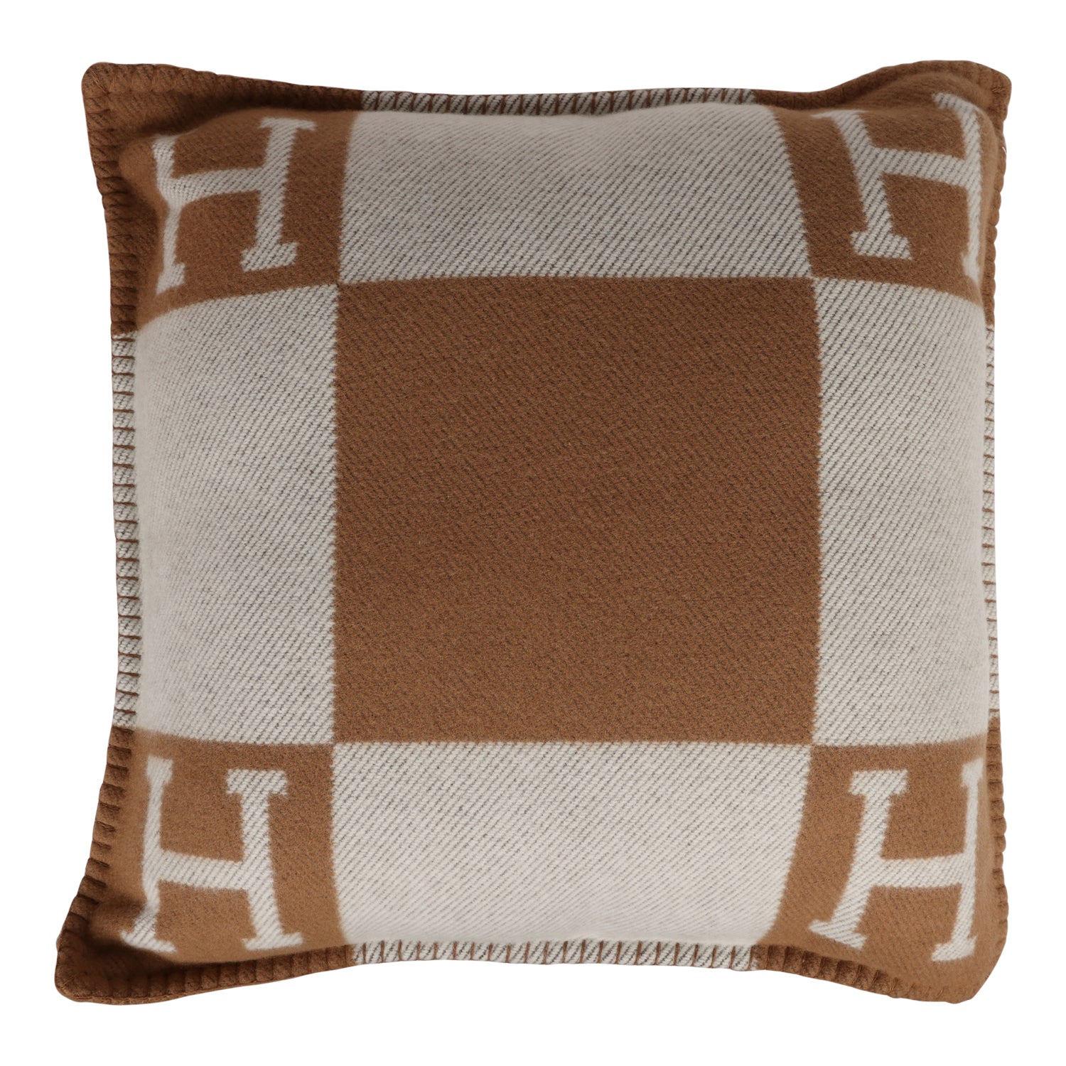 Hermes "Avalon" Ecru and Camel Signature H Cushion PM