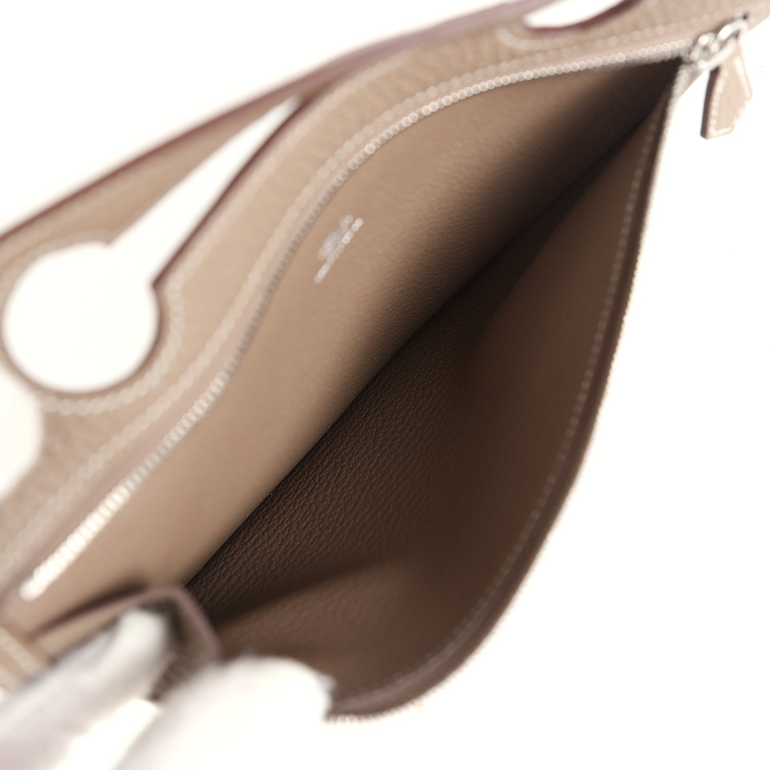 This Back Pocket Pouch is in Etoupe togo with palladium hardware featuring a removable back pocket pouch that is compatible with Birkin 25, 30, and 35 bags. It also has a front zipper closure.