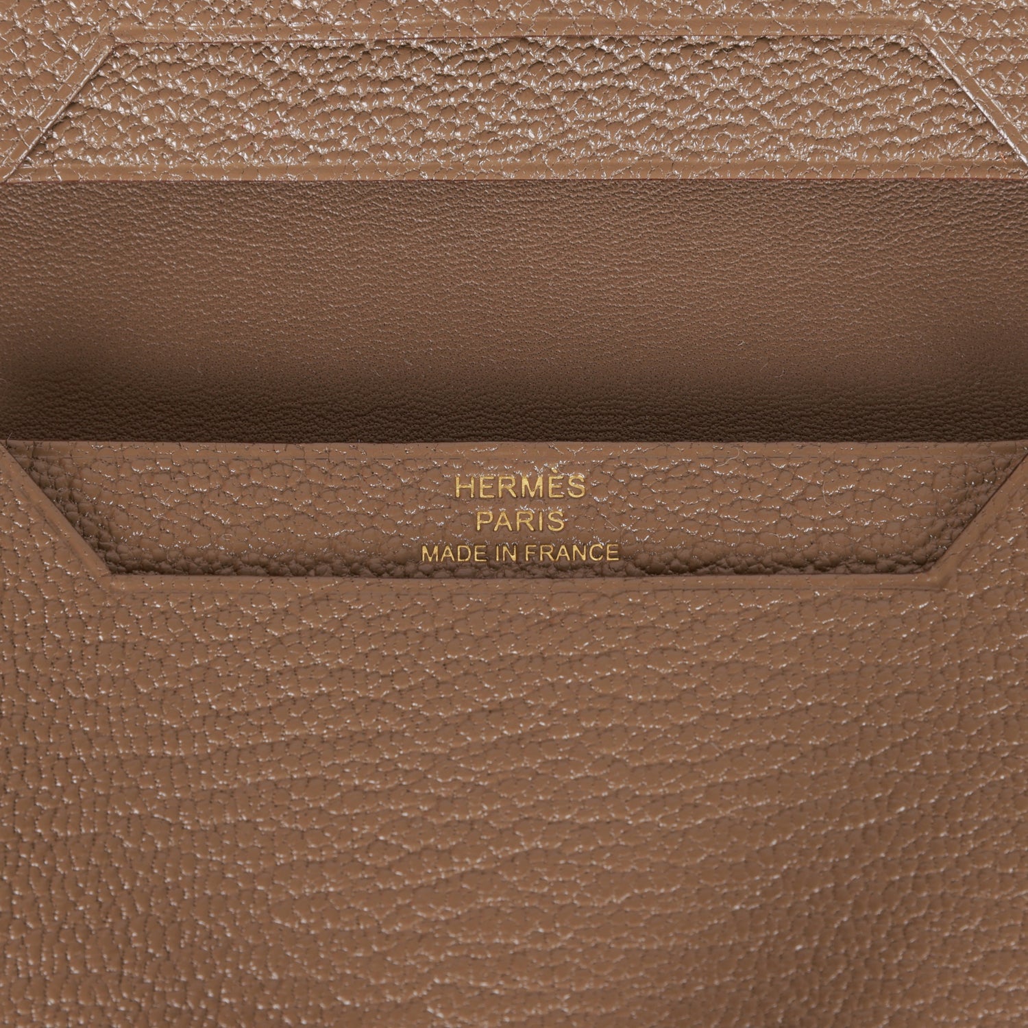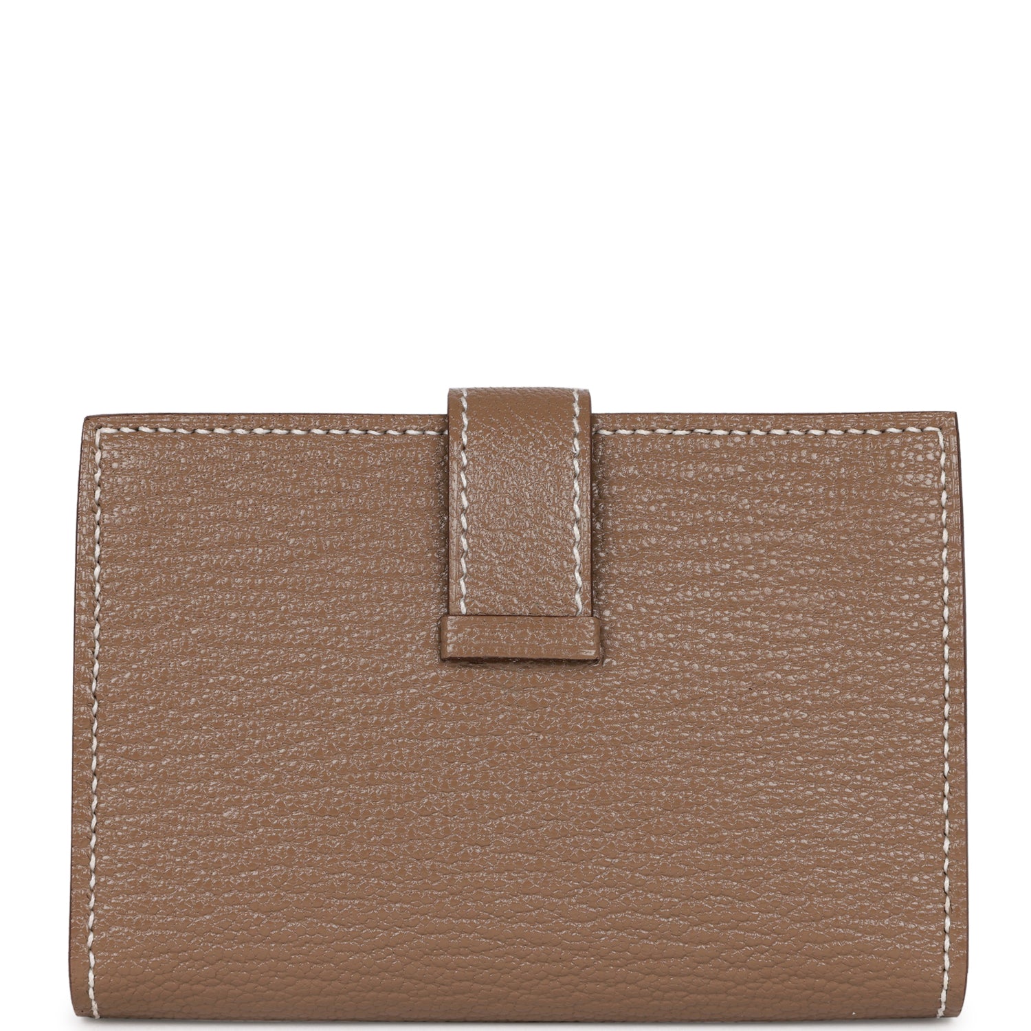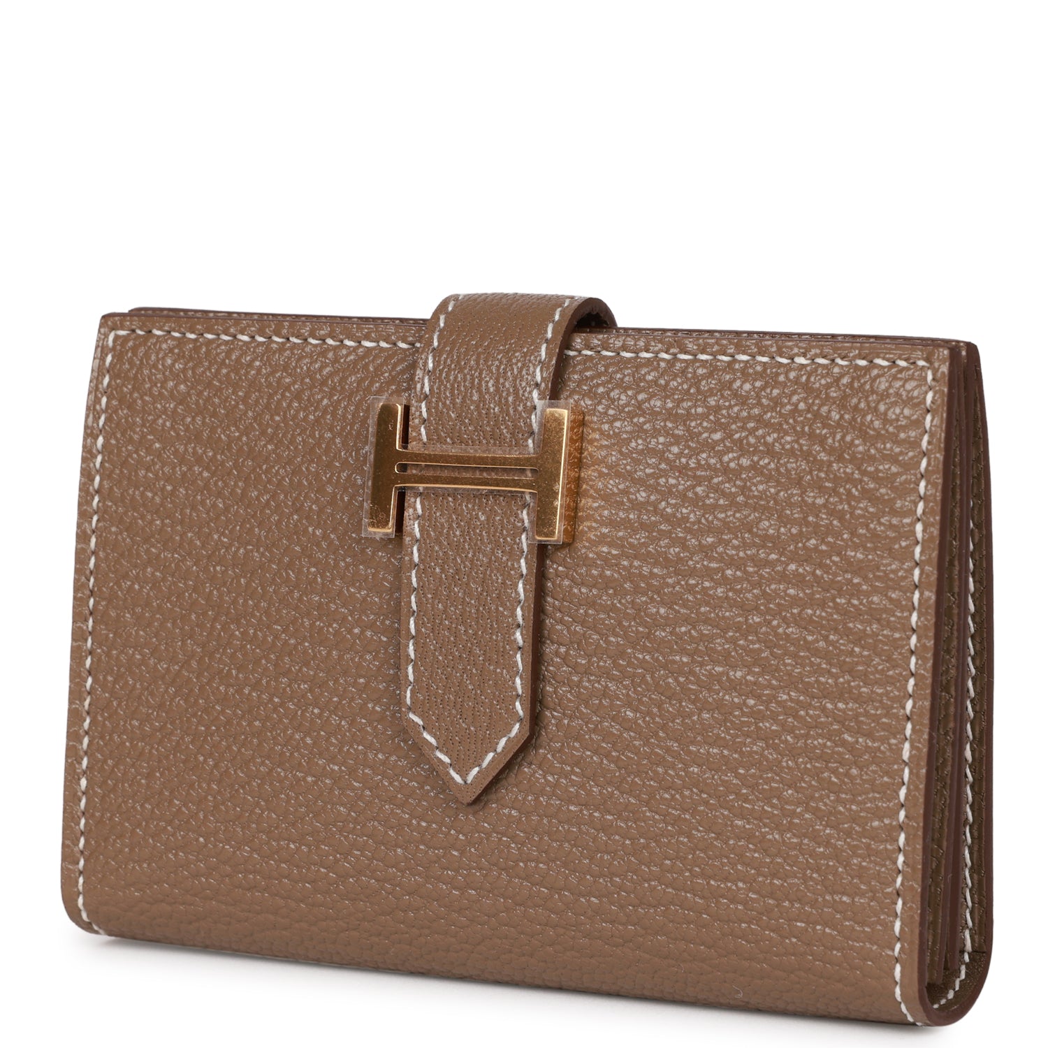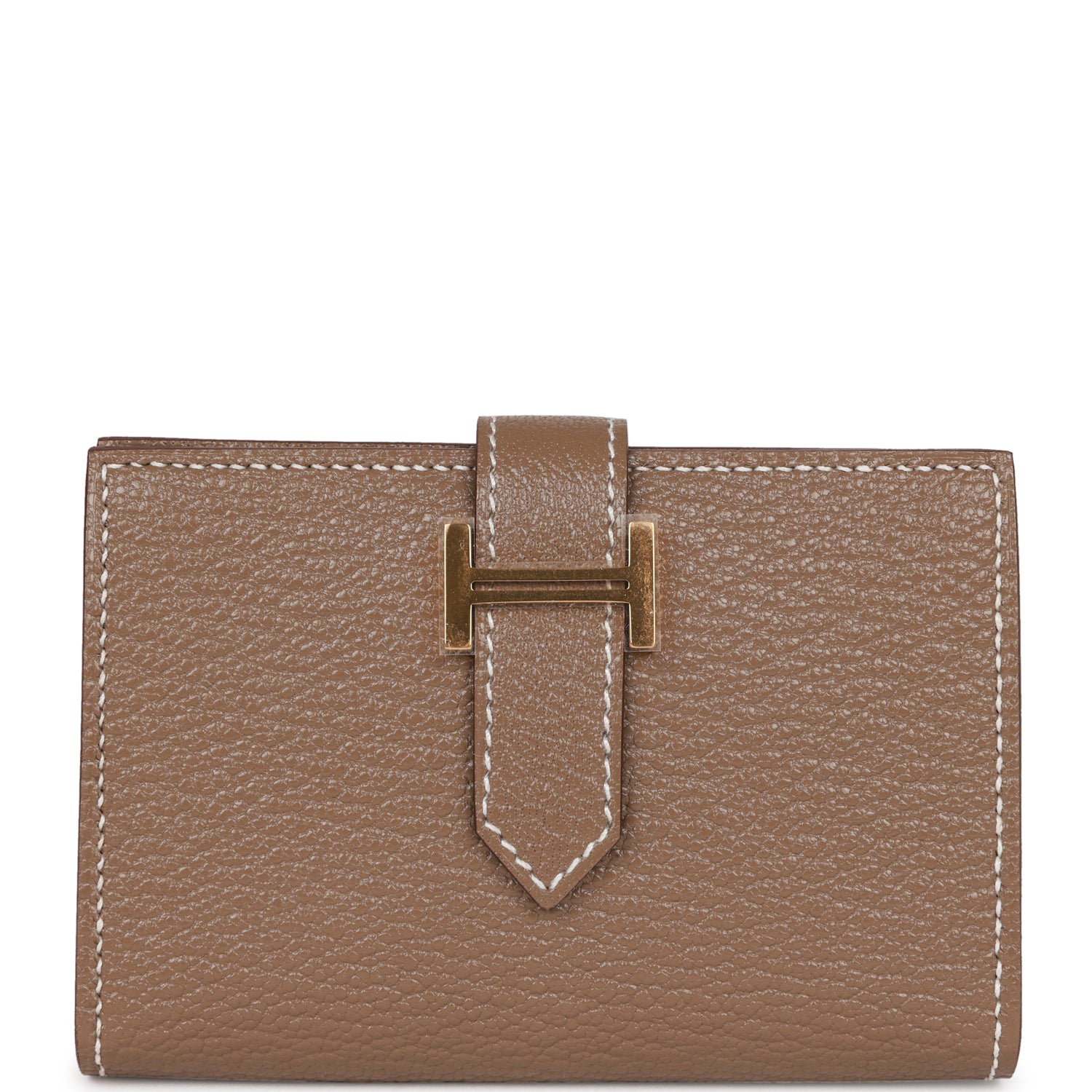 This Bearn Compact Wallet is in etoupe chevre leather with gold hardware, contrast stitching, and a loop closure that tucks into a gold H.