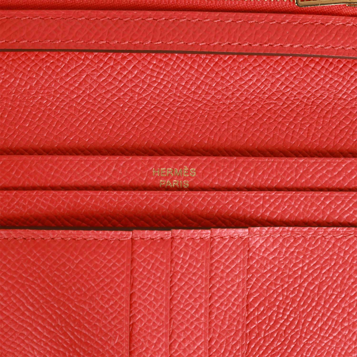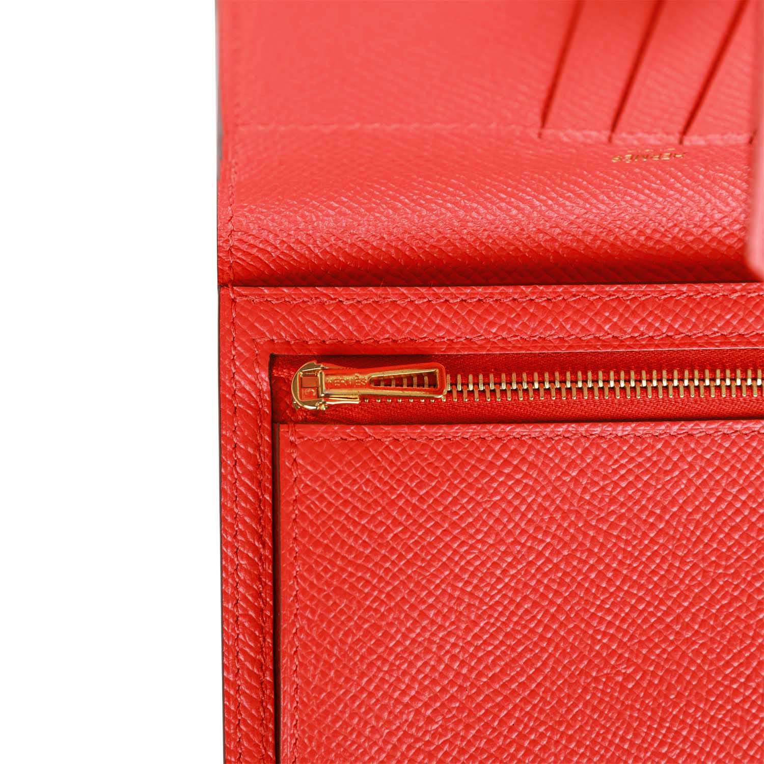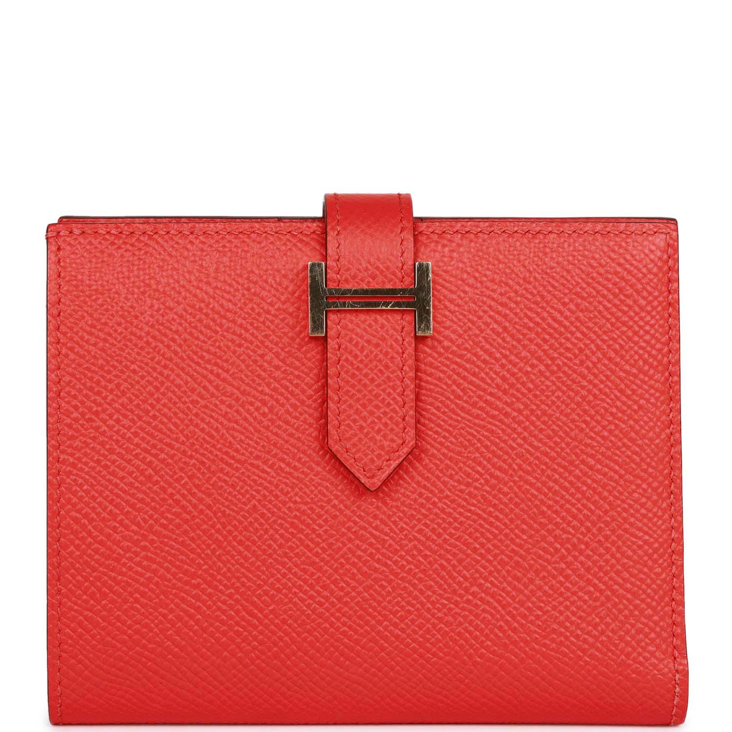 This Bearn Compact Wallet is in Rouge de Coeur epsom leather with gold hardware, tonal stitching, and a loop closure that tucks into a palladium H.