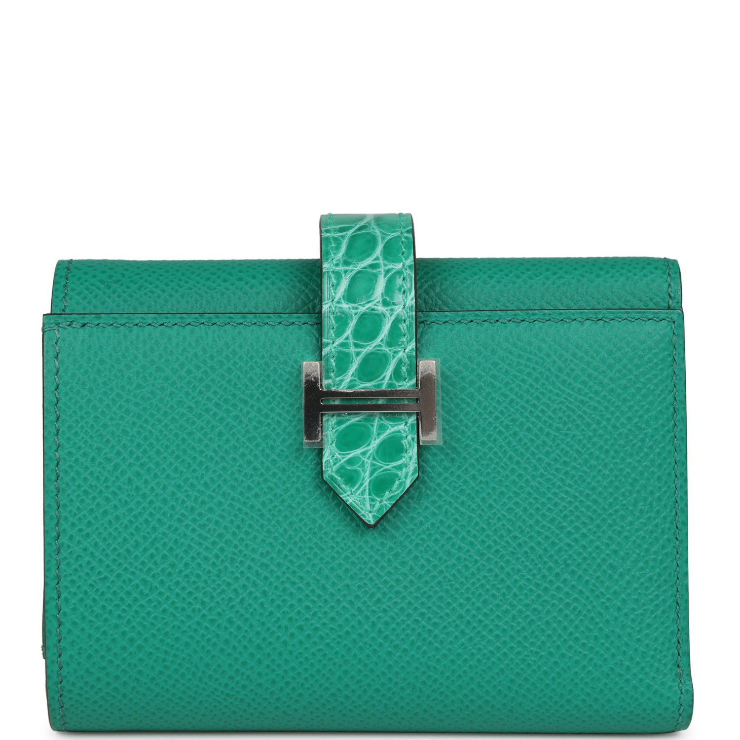 This Bearn Compact Wallet is a Touch in Vert Jade Alligator and Epsom leather with palladium hardware, tonal stitching, and front flap with a pull strap "H" closure.