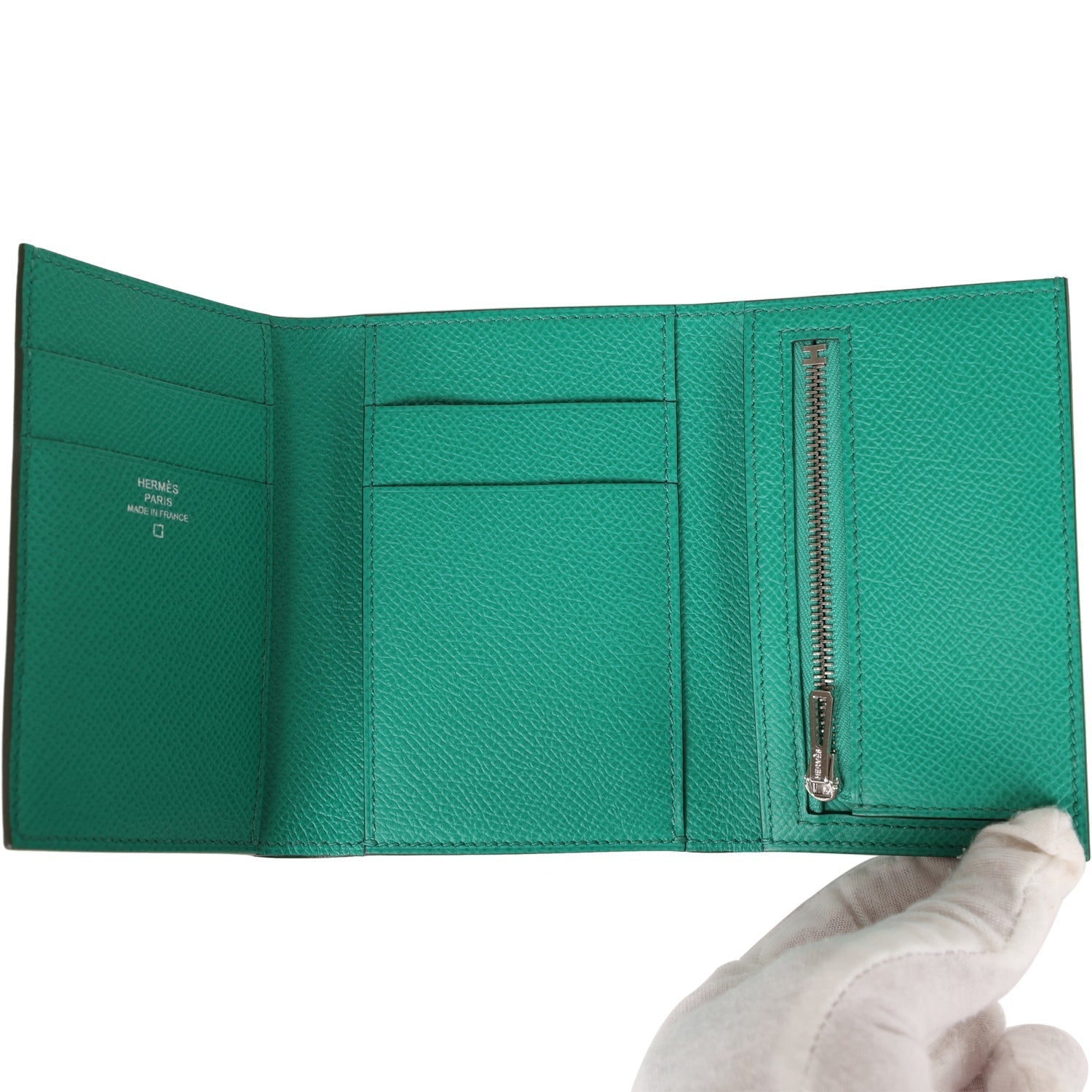 The interior is lined with Vert Jade epsom leather with four credit card slots, four slip pockets, and a zippered change purse with snap closure.