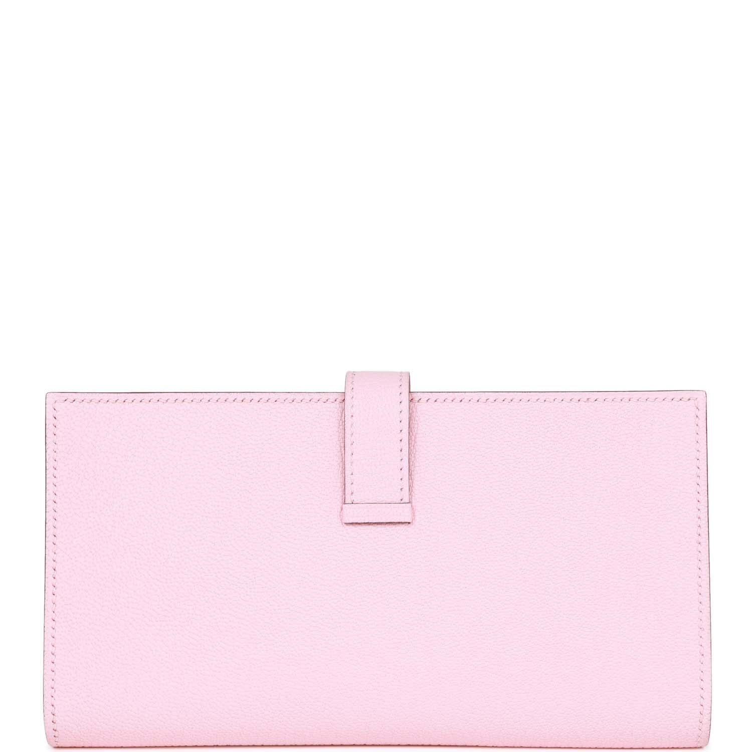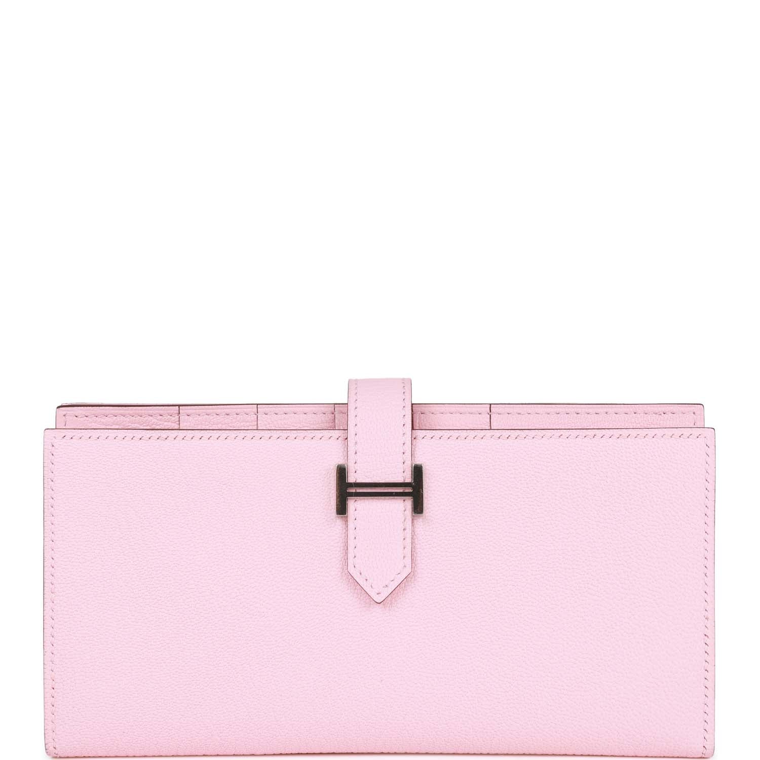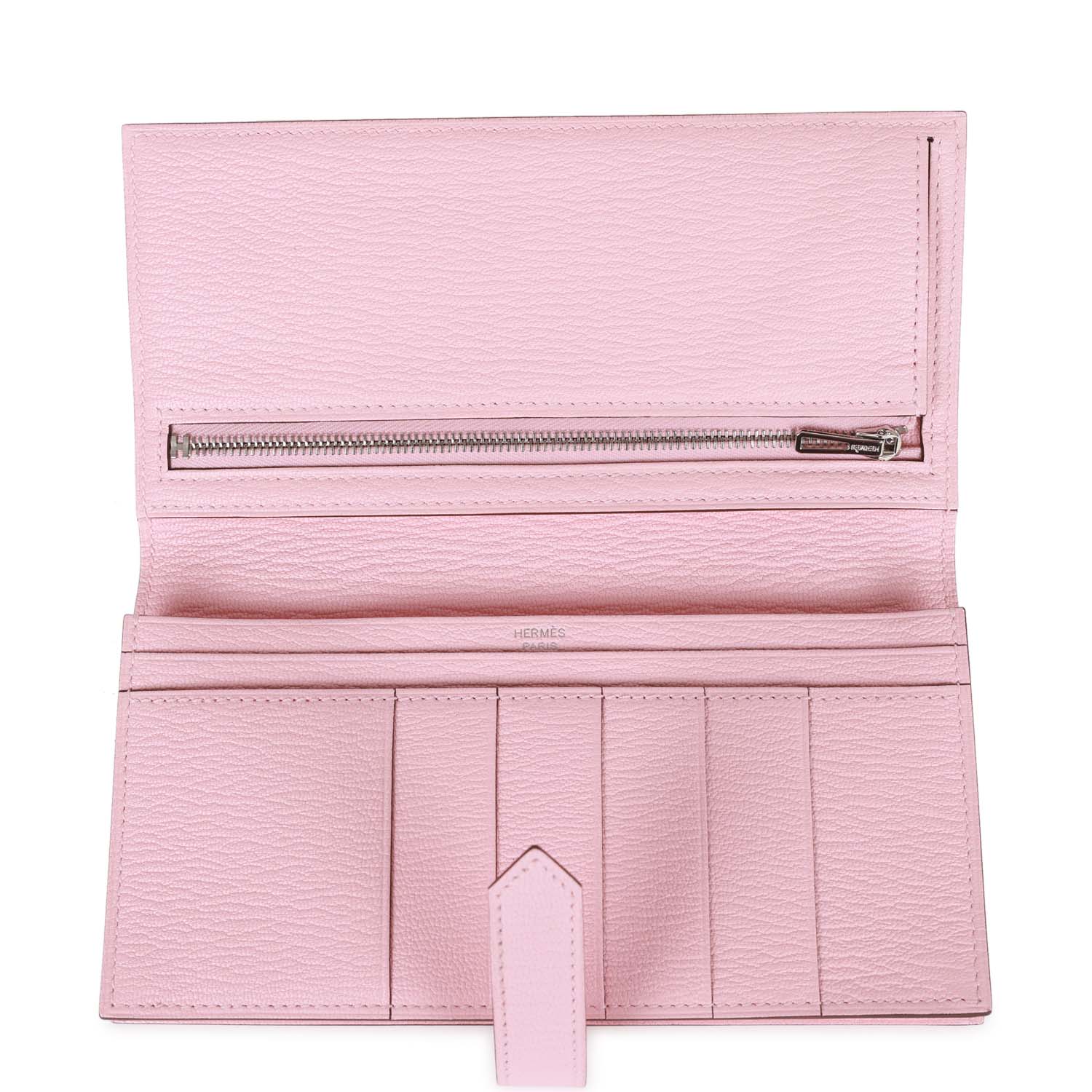 This Hermes Bearn Gusset Wallet is in Rose Sakura chevre mysore leather with palladium hardware, tonal stitching, front flap with a strap that tucks under an "H".