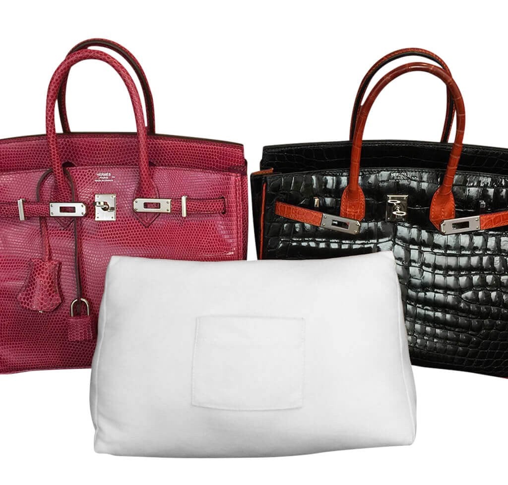 This triangle-shaped pillow is designed to shape and preserve your Hermes Birkin Bag while it is not in use. Perfect for both short and long term storage, the woven tricot, 100% polyester material offers durability and sensitivity, holding its shape over time and acts gently against the interior lining of your Birkin. The specific dimensions of the pillow are inch perfect to fit inside a size 25 Hermes Birkin and maintain the form of the bag. This pillow is ideal for Birkins crafted from soft leather and exotic skins. We also have pillows for size 30 and size 35 Hermes Birkin Bags.