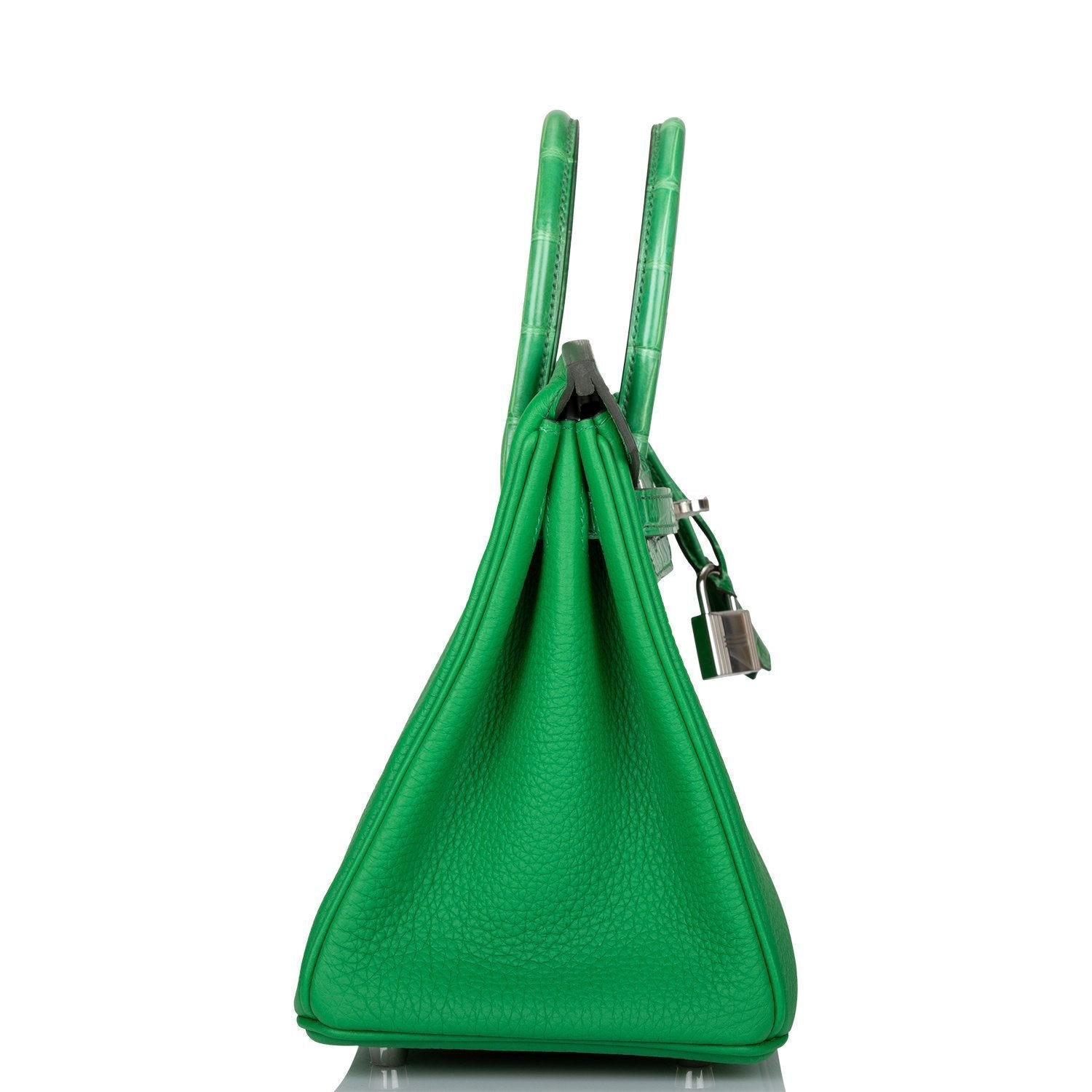 This Birkin is in Bambou shiny Mississippienis alligator and togo leather with palladium hardware and has tonal stitching, front strap, two straps with center toggle closure, clochette with lock and two keys and double rolled handles.