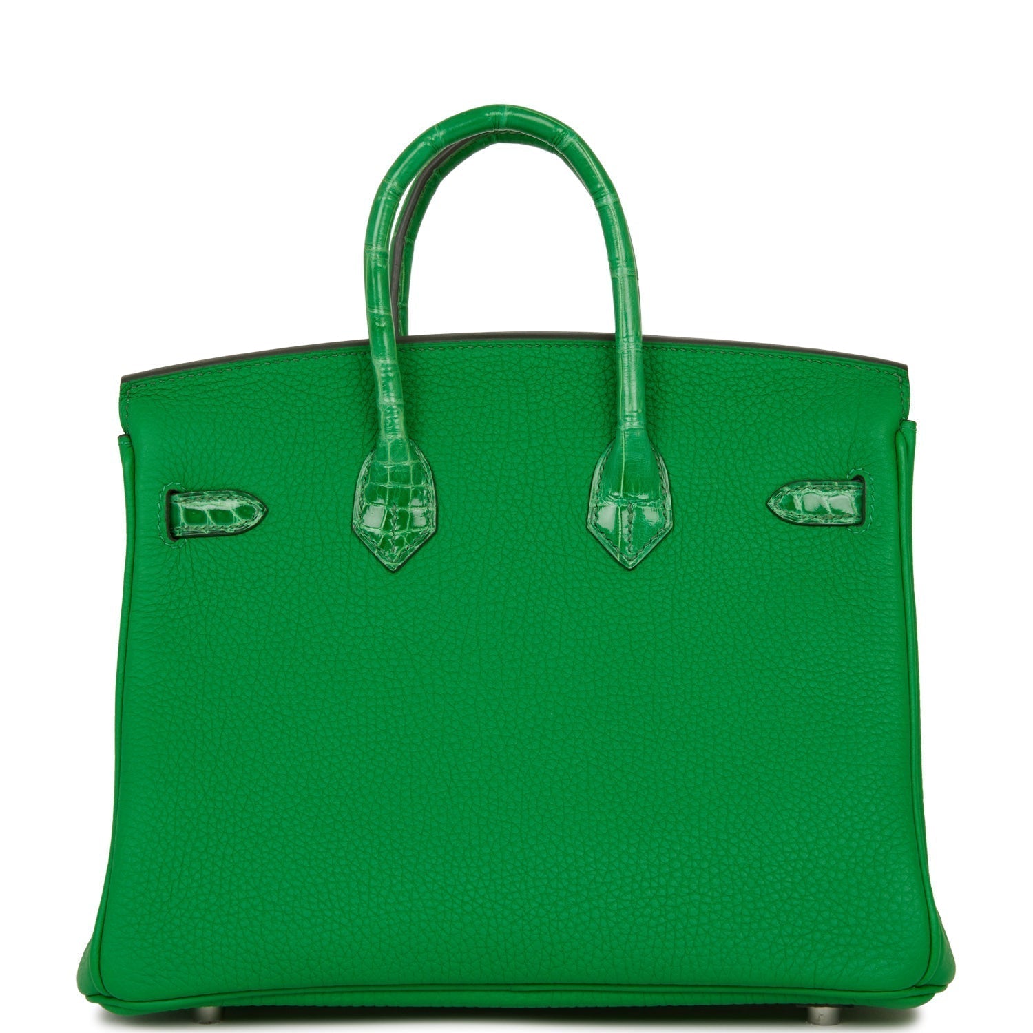This Birkin is in Bambou shiny Niloticus crocodile and togo leather with palladium hardware and has tonal stitching, front strap, two straps with center toggle closure, clochette with lock and two keys and double rolled handles.
