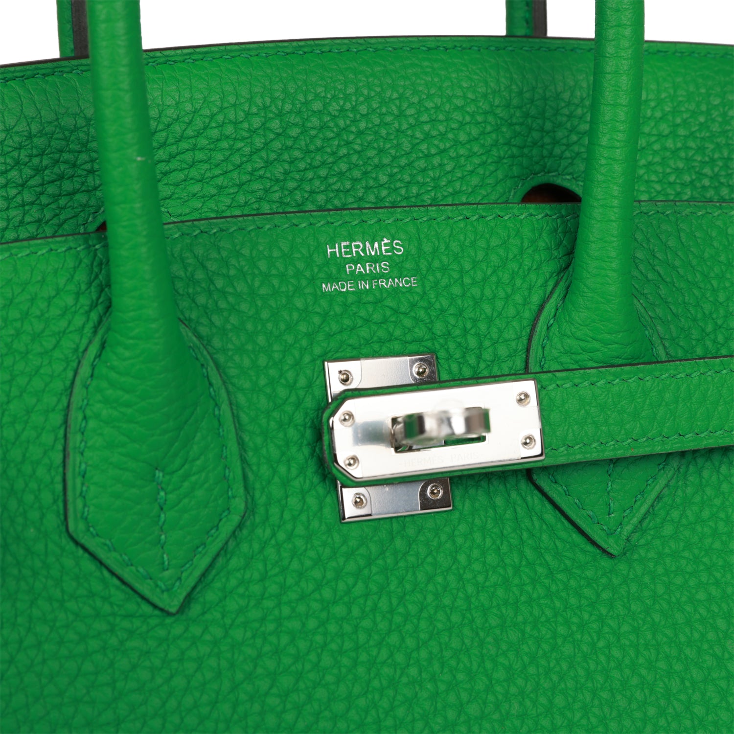 This Birkin is in Bambou togo leather with palladium hardware and has tonal stitching, two straps with front toggle closure, clochette with lock and two keys and double rolled handles.