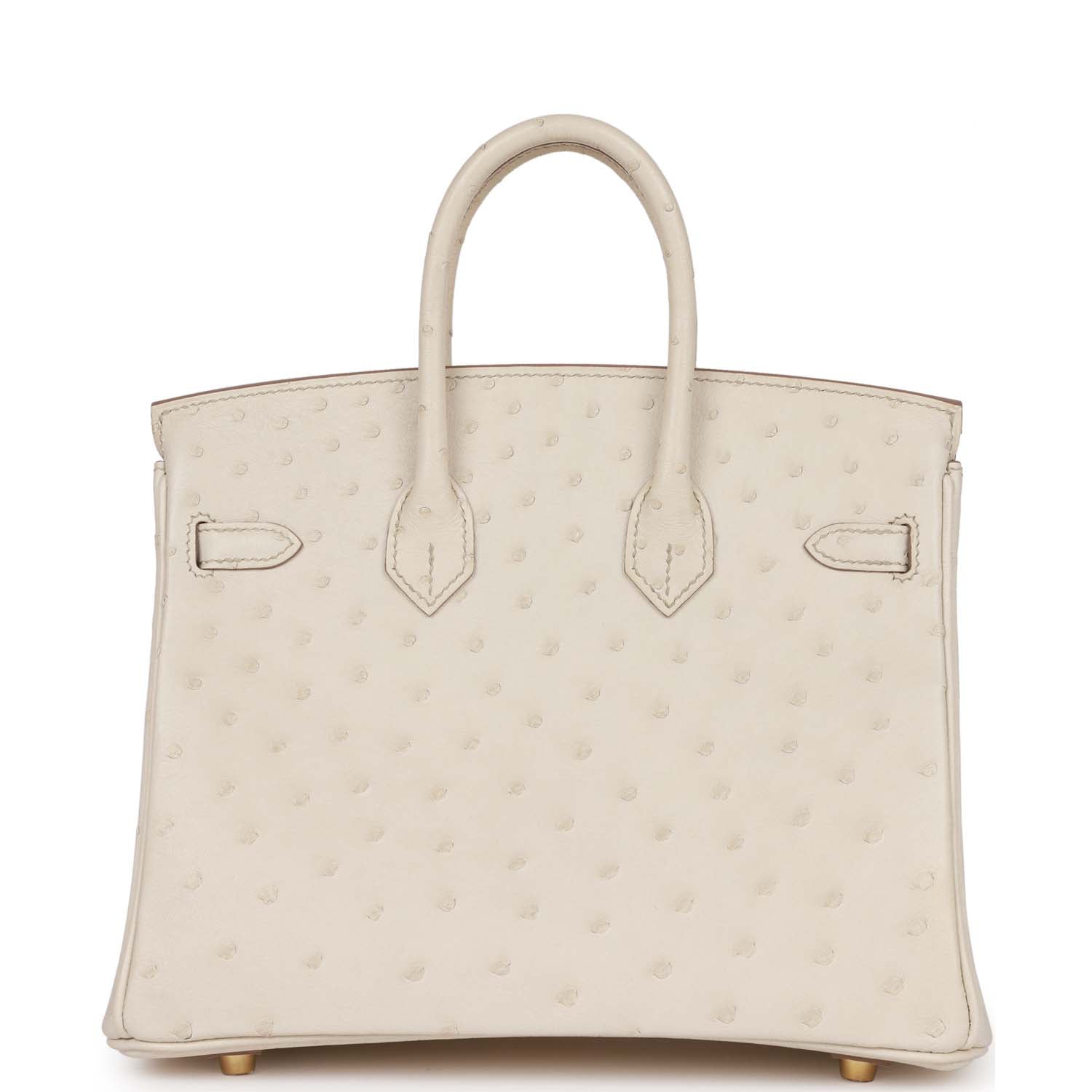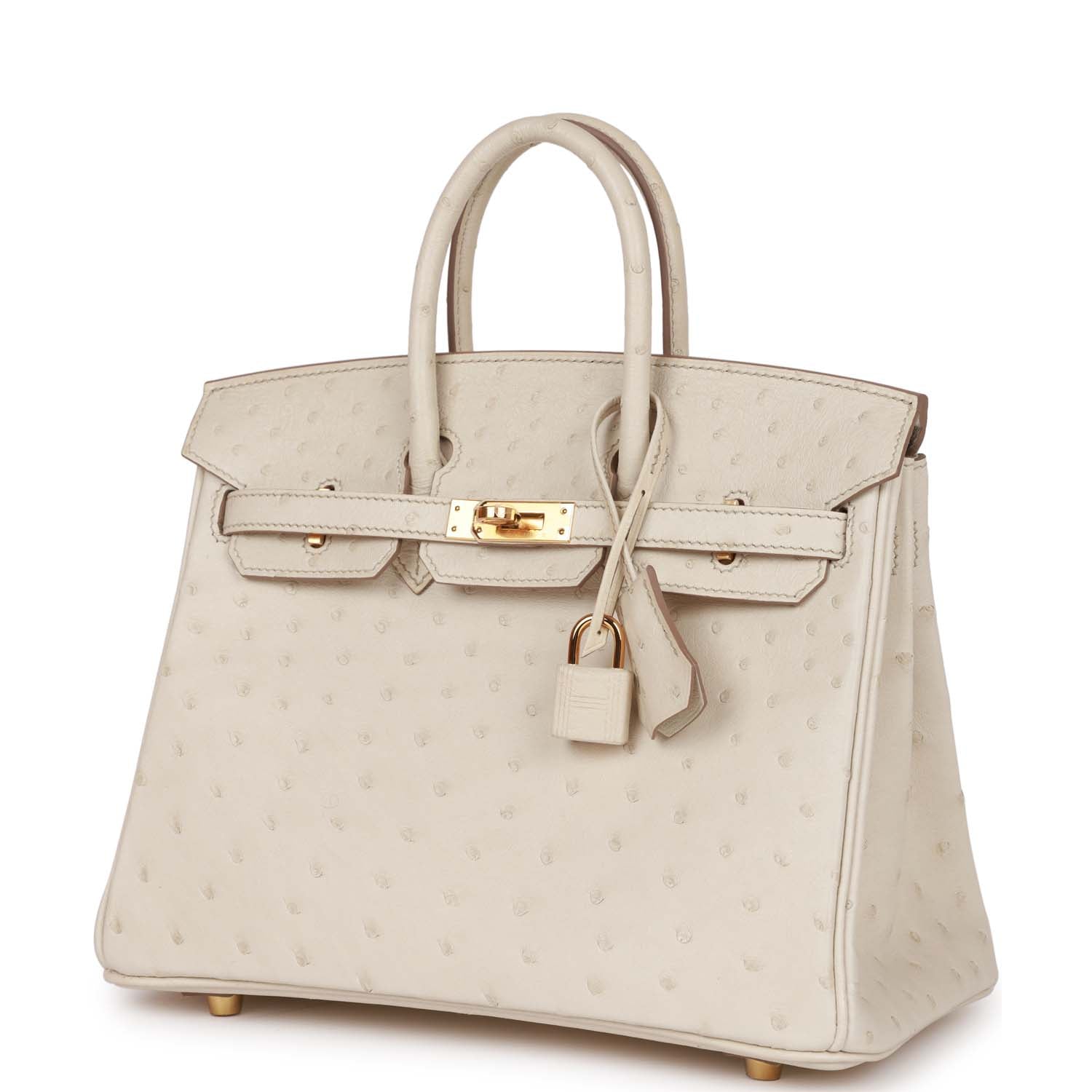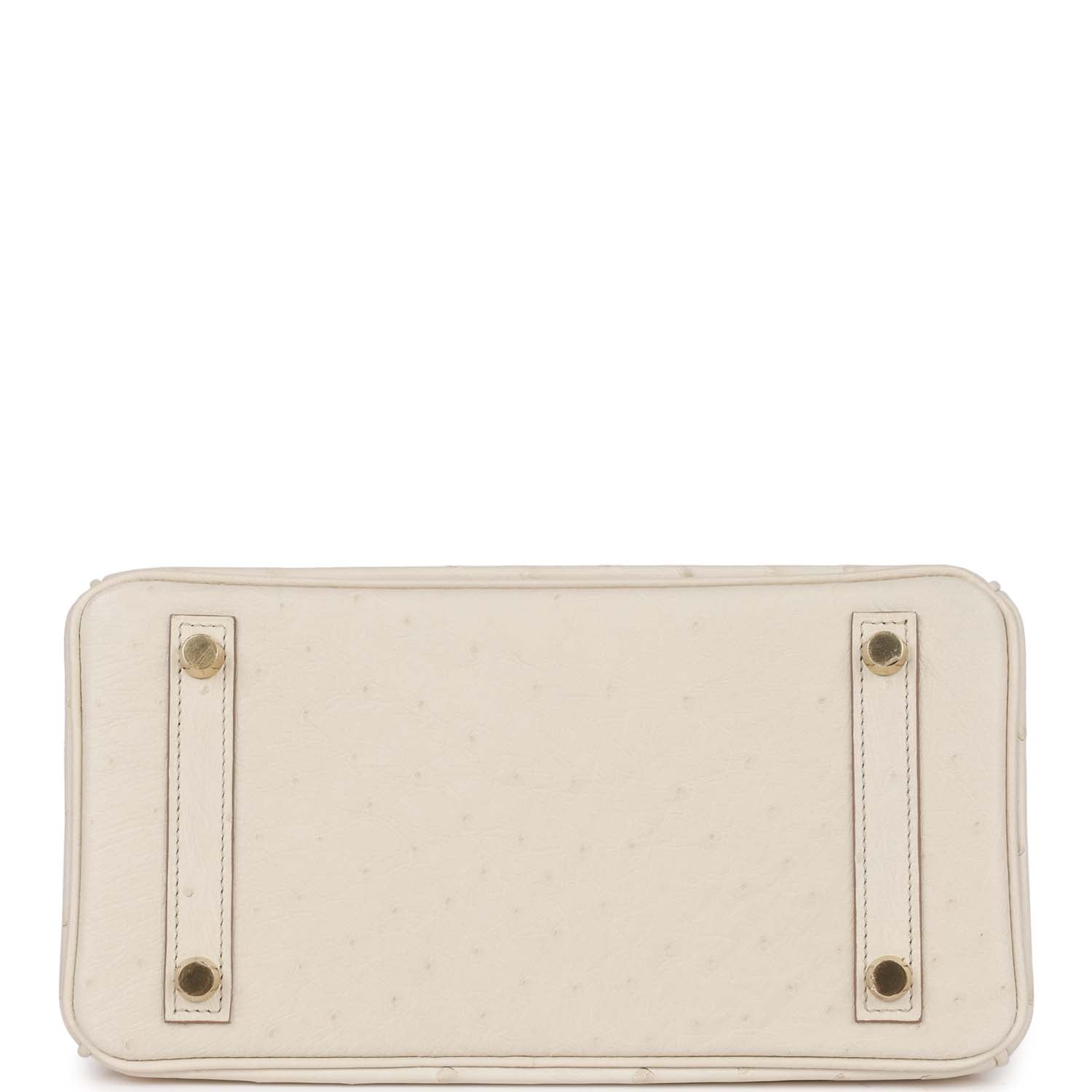 This Birkin is in Beton ostrich with gold hardware and features tonal stitching, front flap, two straps with center toggle closure, clochette with lock and two keys, and double rolled handles.