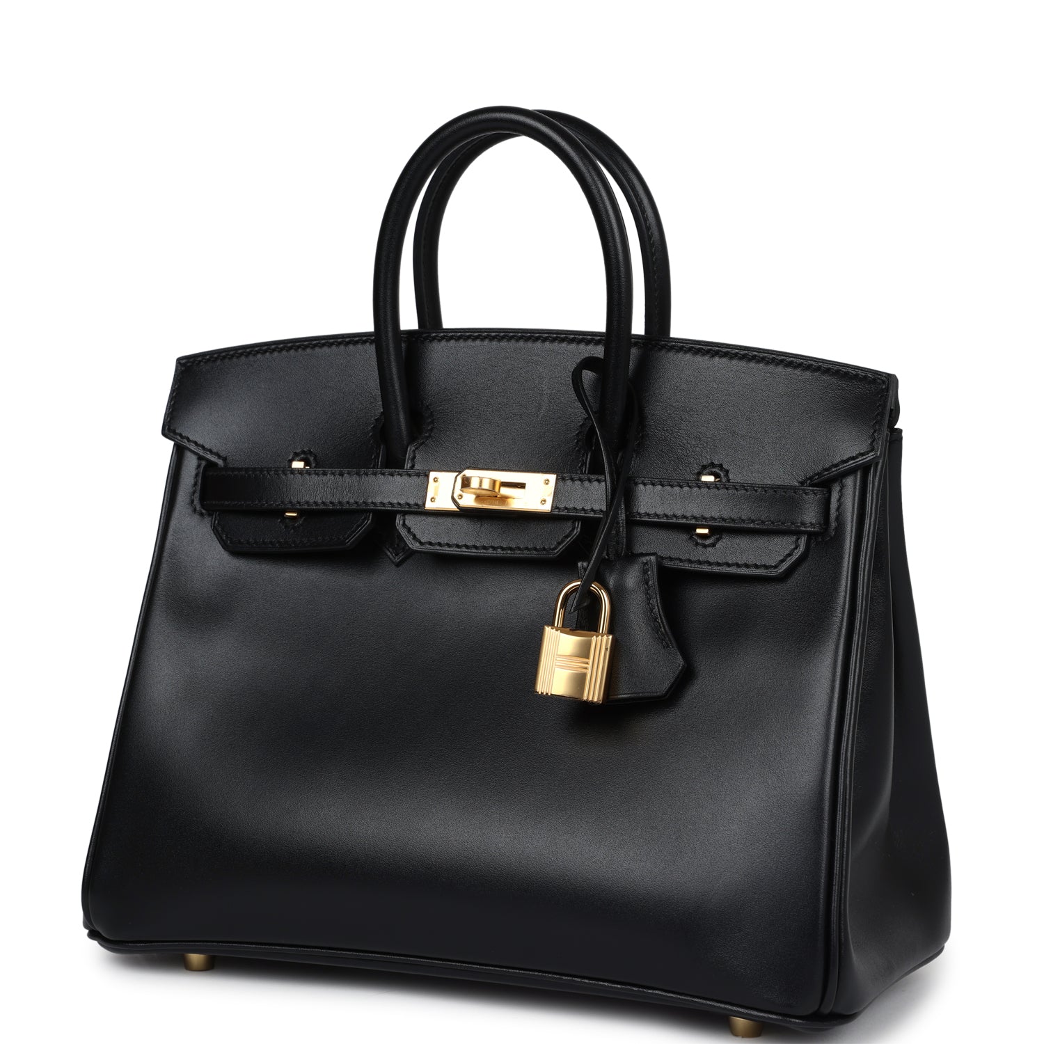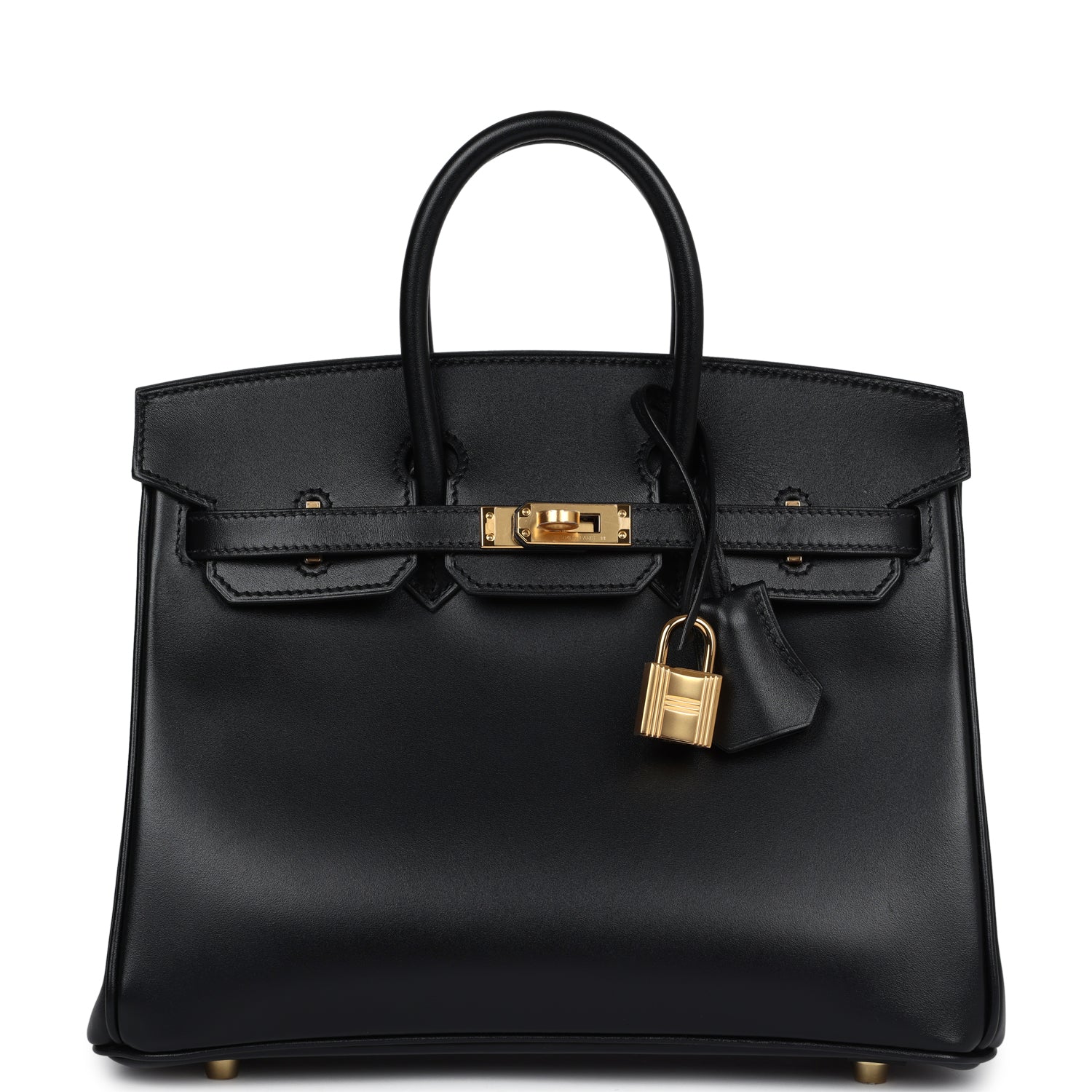 This Birkin is in Black box calf leather with gold hardware and has tonal stitching, front flap, two straps with center toggle closure, clochette with lock and two keys, and double rolled handles.