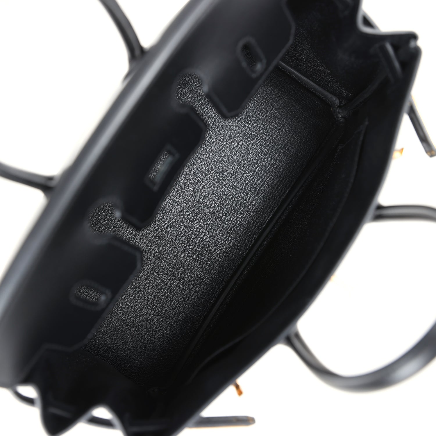 The interior is lined with black chevre and has a zip pocket with an Hermes engraved zipper pull and an open pocket on the opposite side.