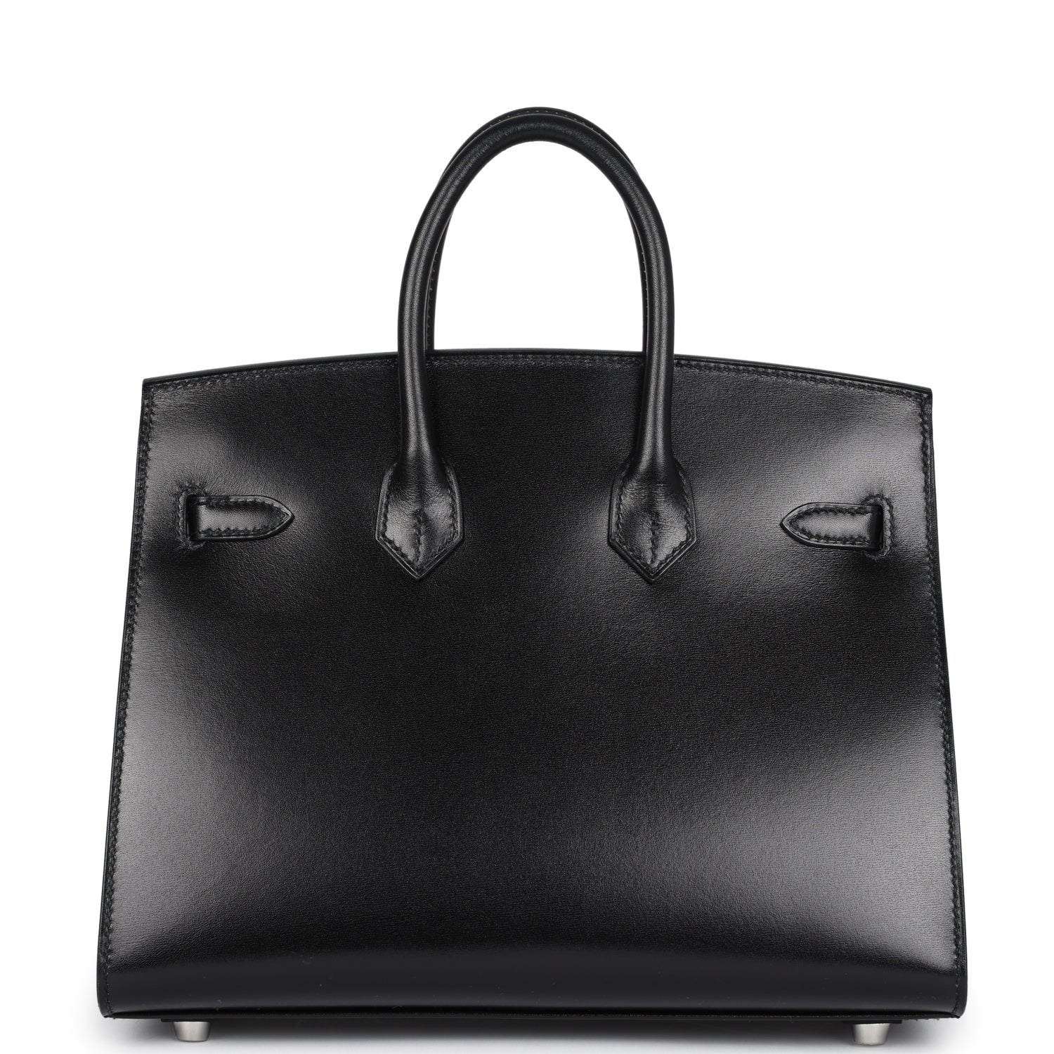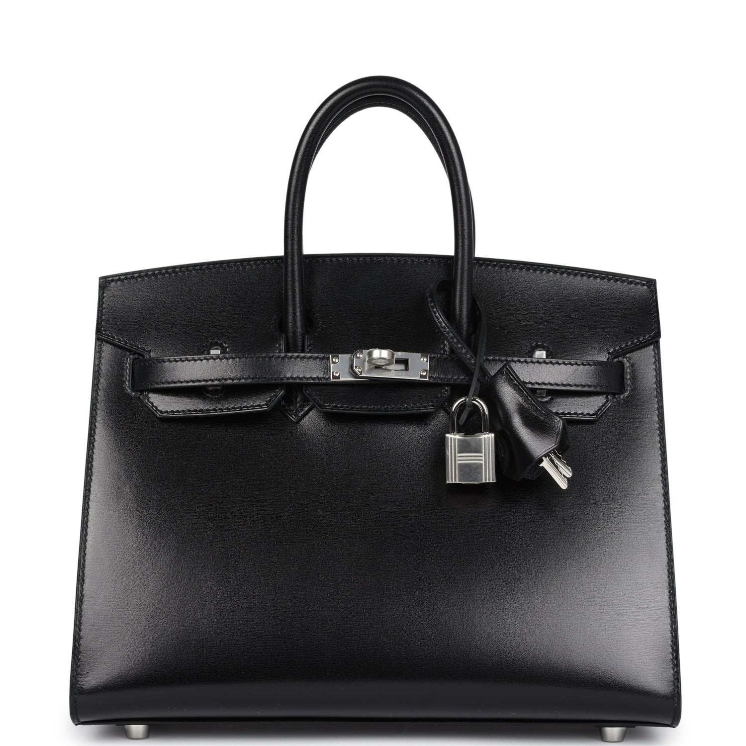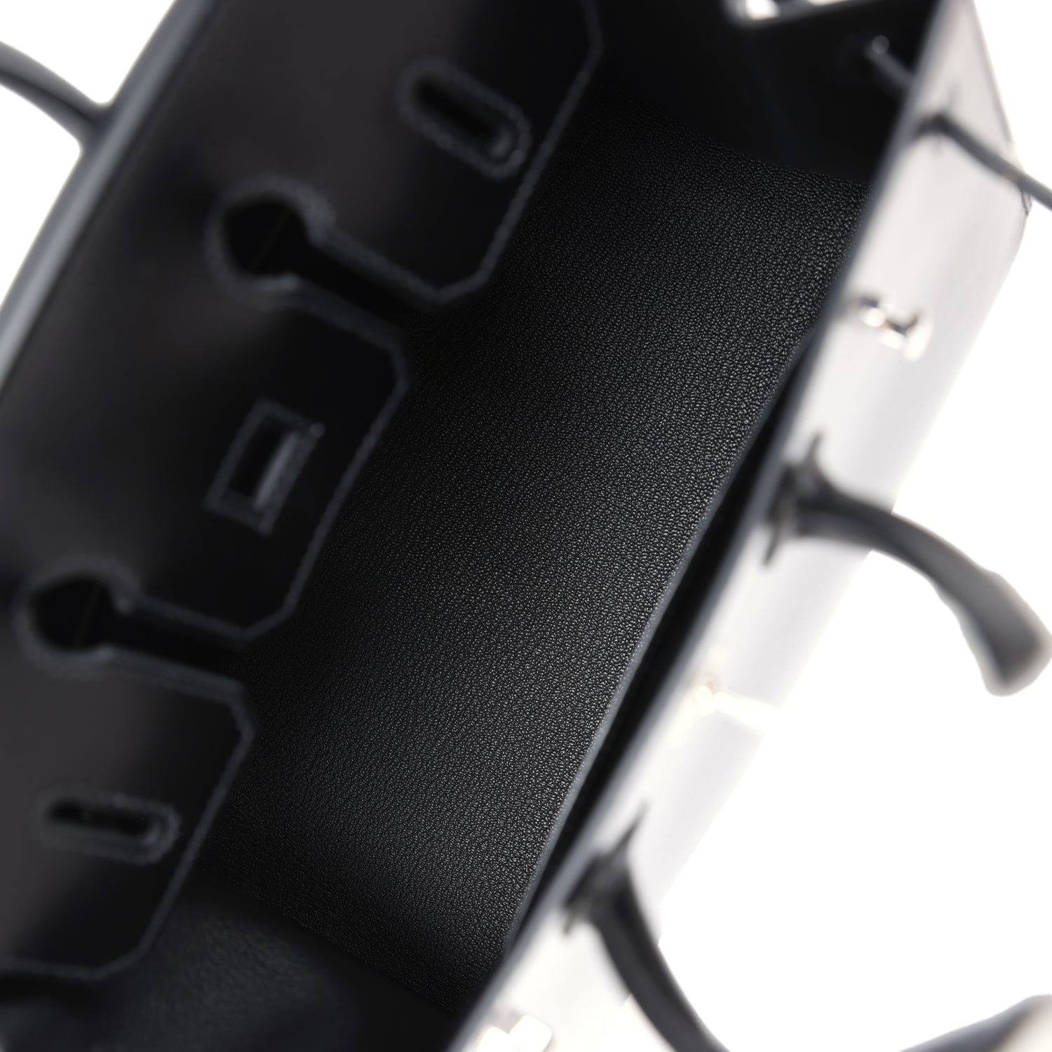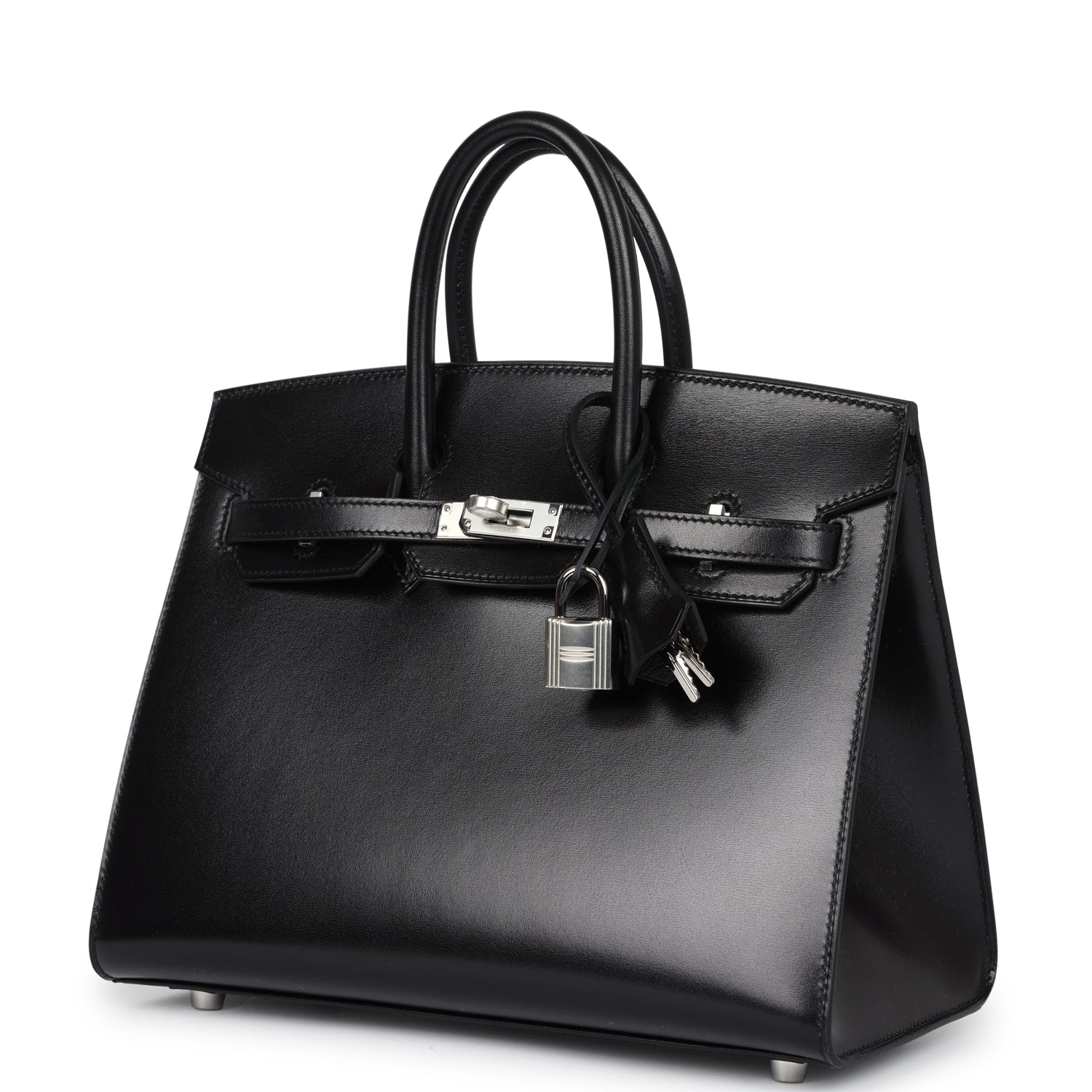 This Birkin is in Black box calf leather with palladium hardware and has tonal stitching, front flap, two straps with center toggle closure, clochette with lock and two keys, and double rolled handles.