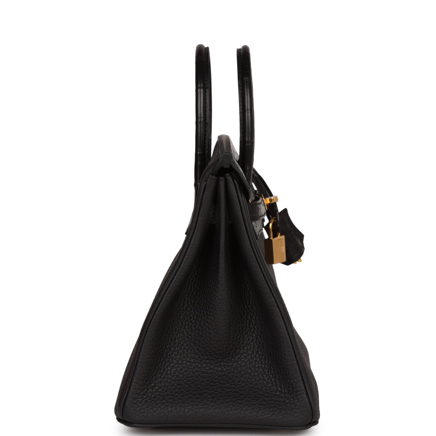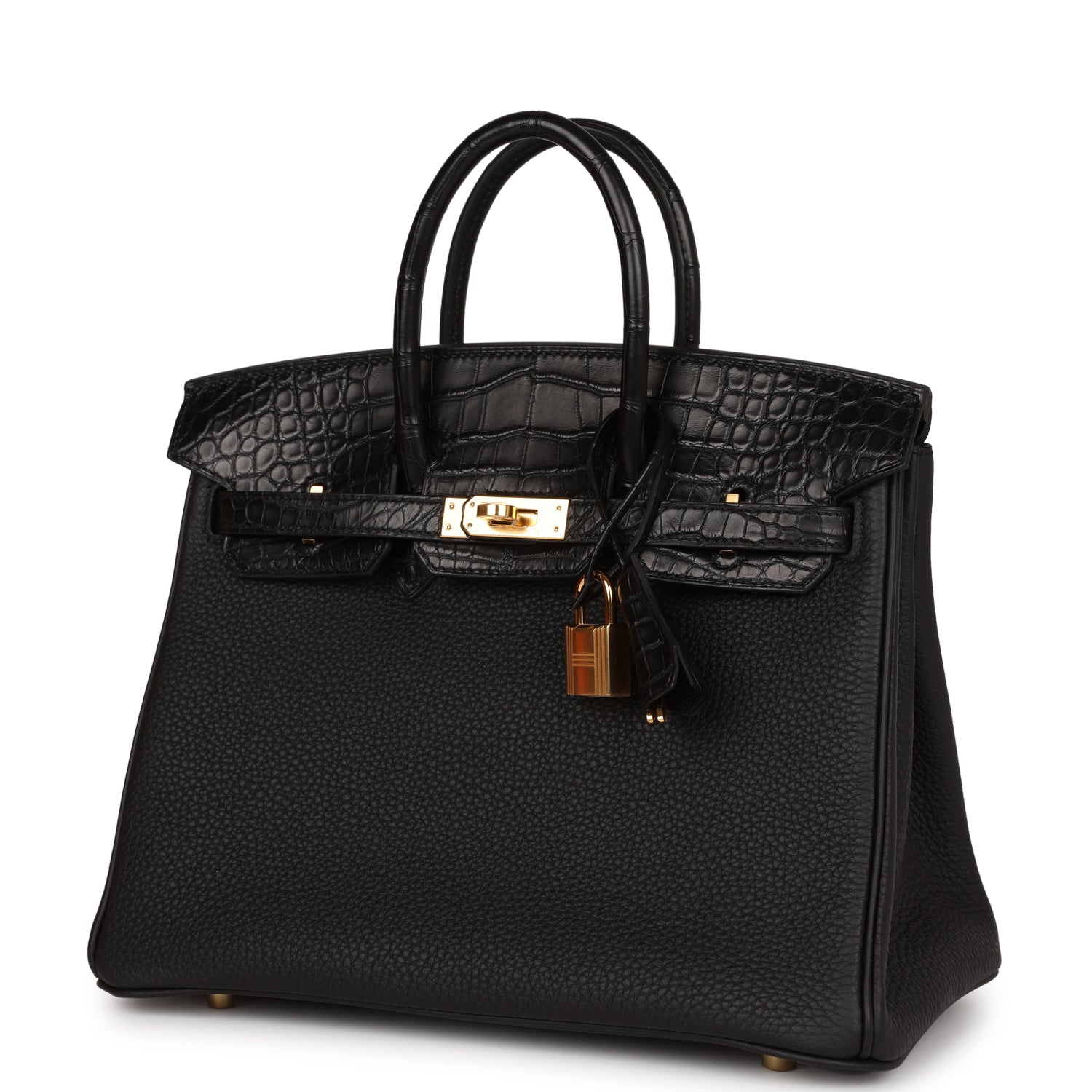 This Birkin is in Black matte Mississippienis alligator and togo leather with gold hardware and has tonal stitching, front strap, two straps with center toggle closure, clochette with lock and two keys and double rolled handles.