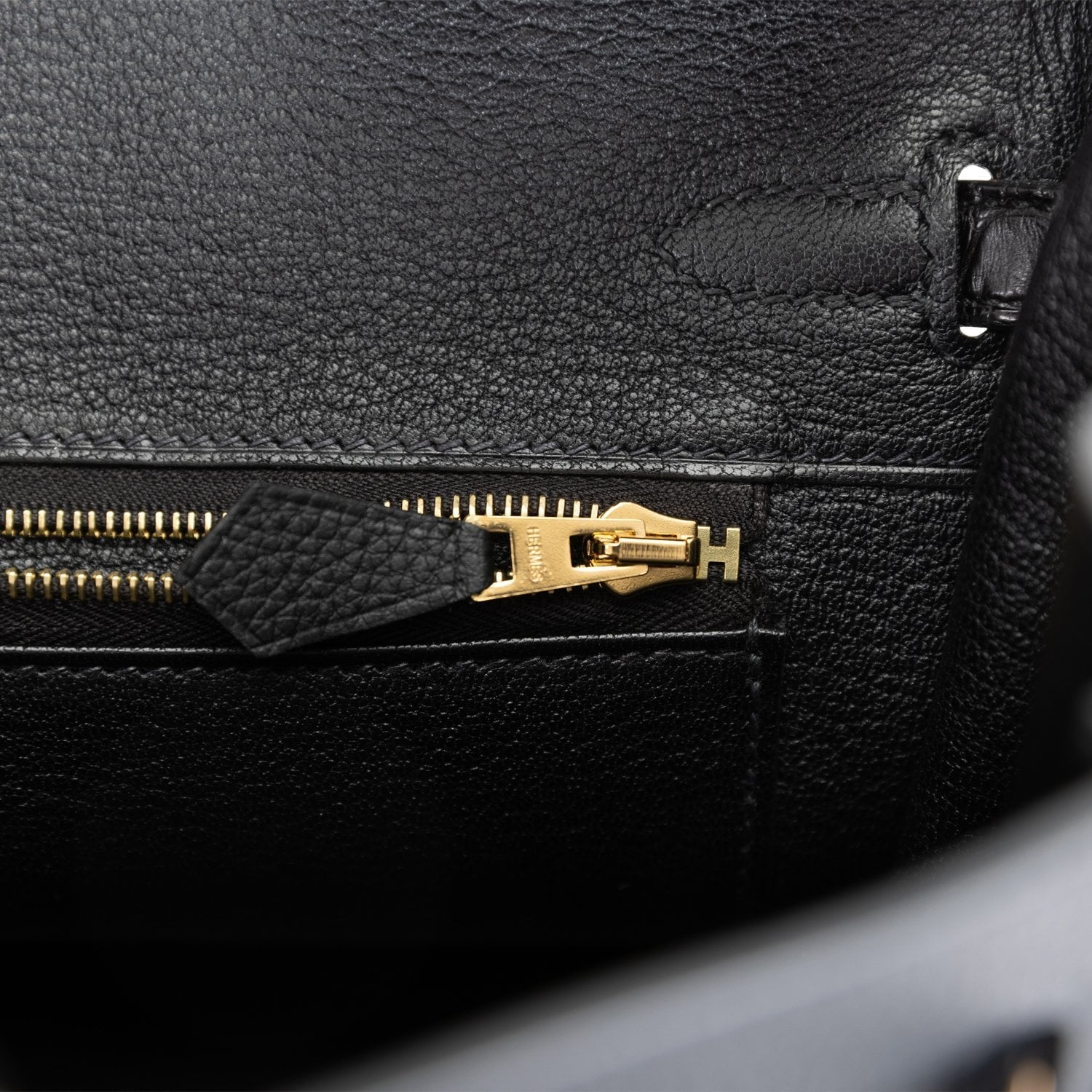 The interior is lined with black chevre and has one zip pocket with an Hermes engraved zipper pull and an open pocket on the opposite side.