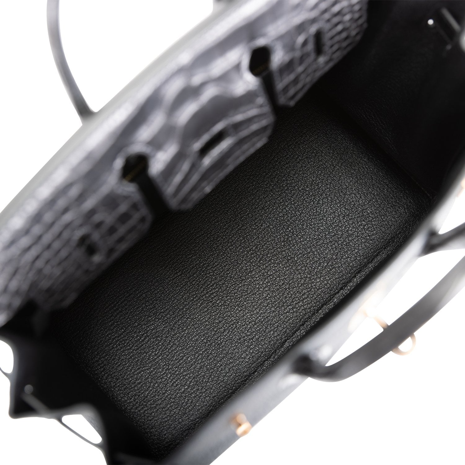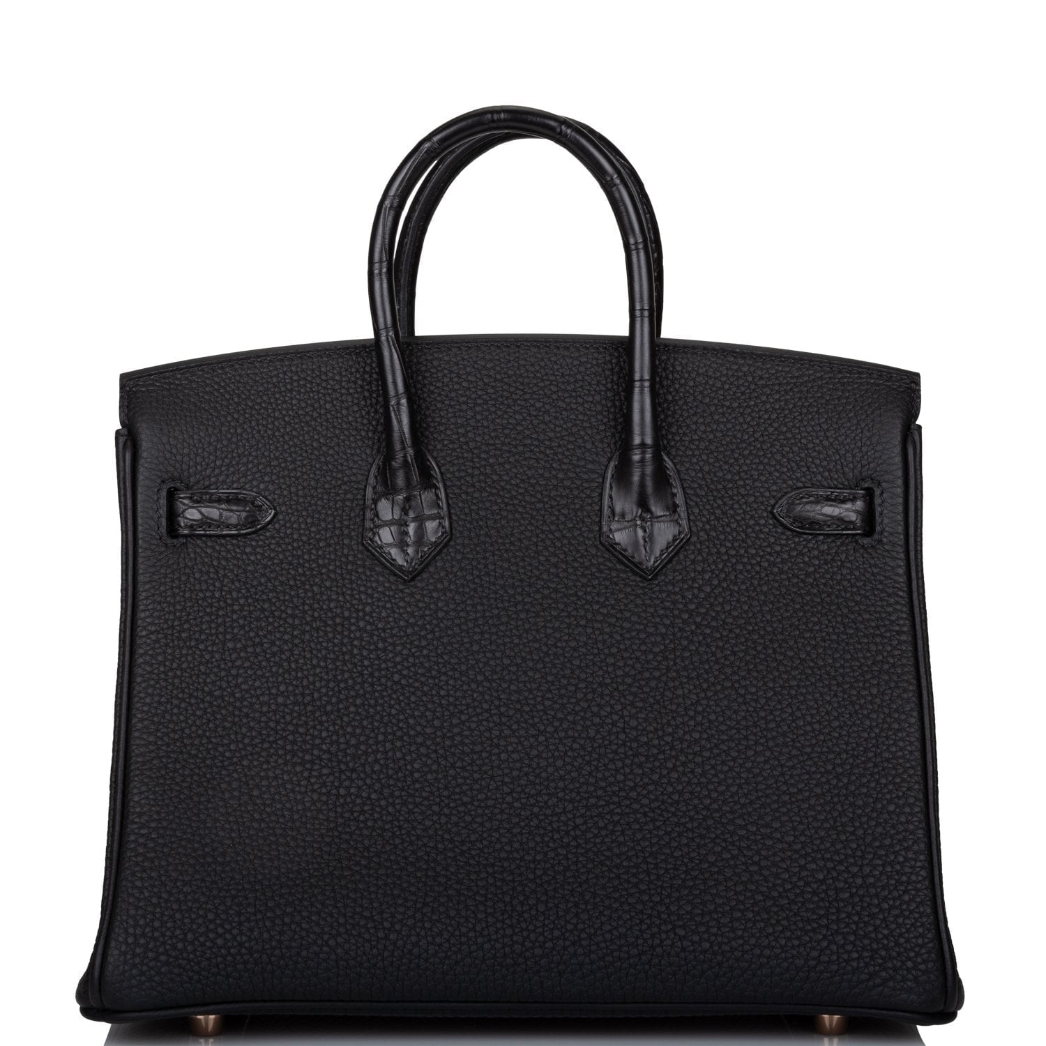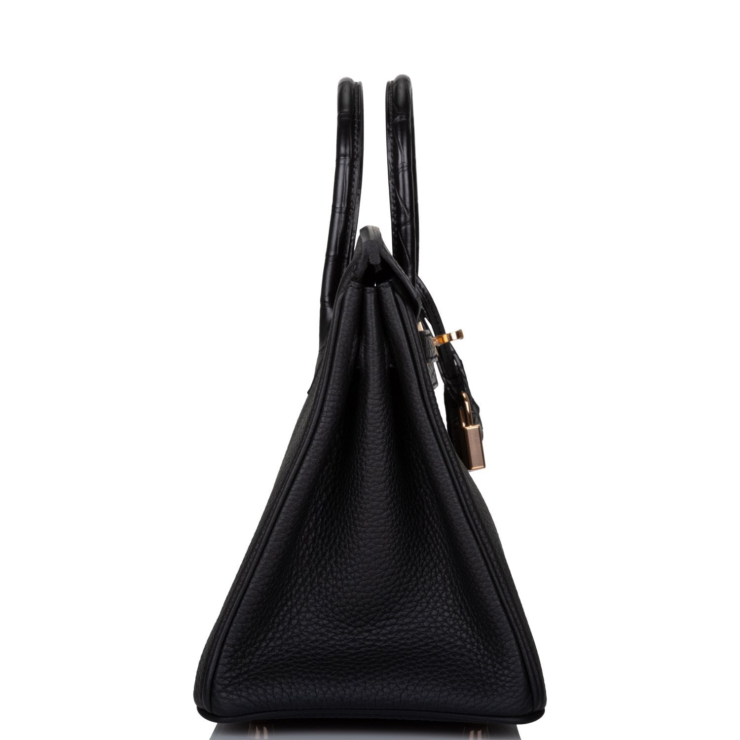 This Birkin is in black matte Mississippienis alligator and togo leather with rose gold hardware and has tonal stitching, front strap, two straps with center toggle closure, clochette with lock and two keys and double rolled handles.