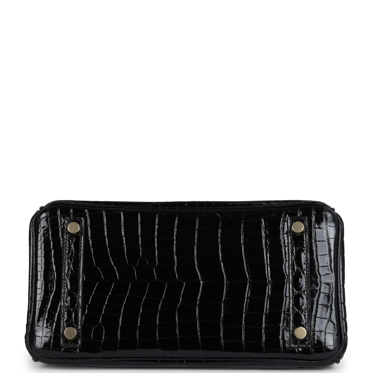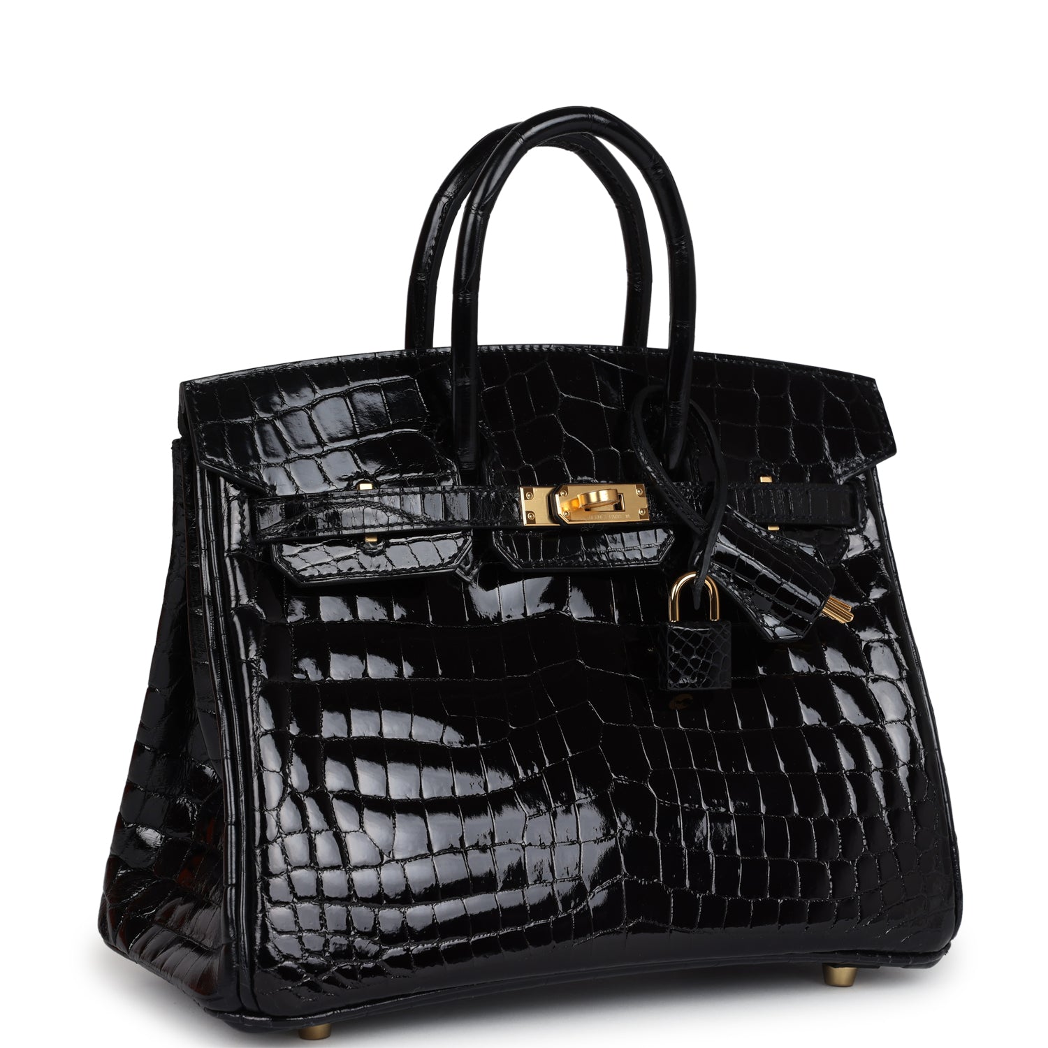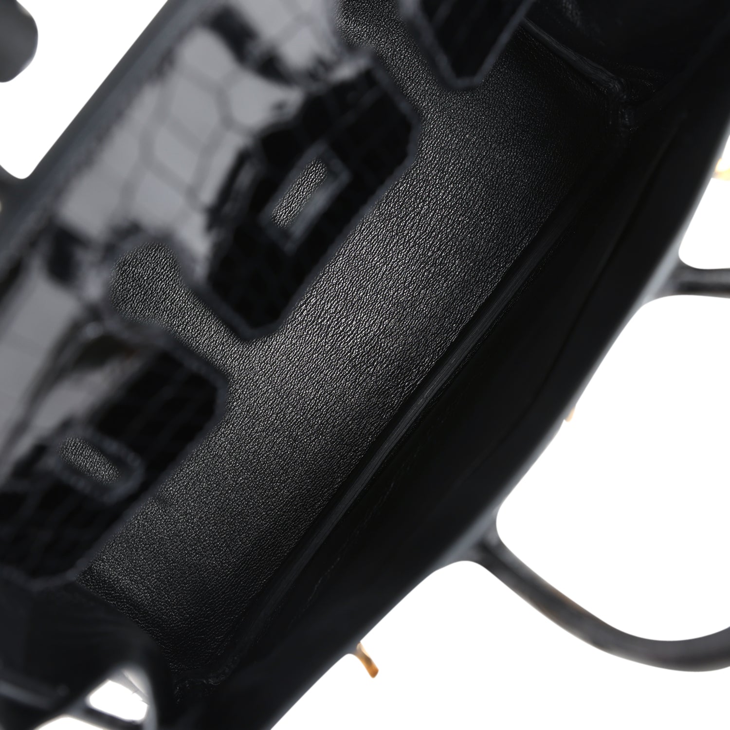 This Birkin is in Black Shiny Niloticus Crocodile leather with gold hardware, tonal stitching, front flap with two straps, front toggle closure, clochette with lock and two keys, and double rolled handles.