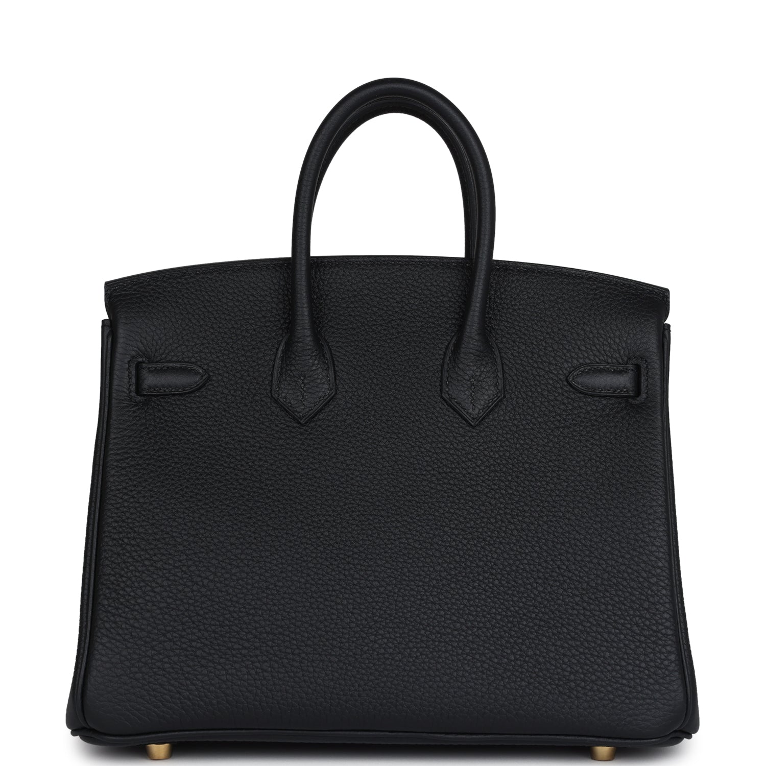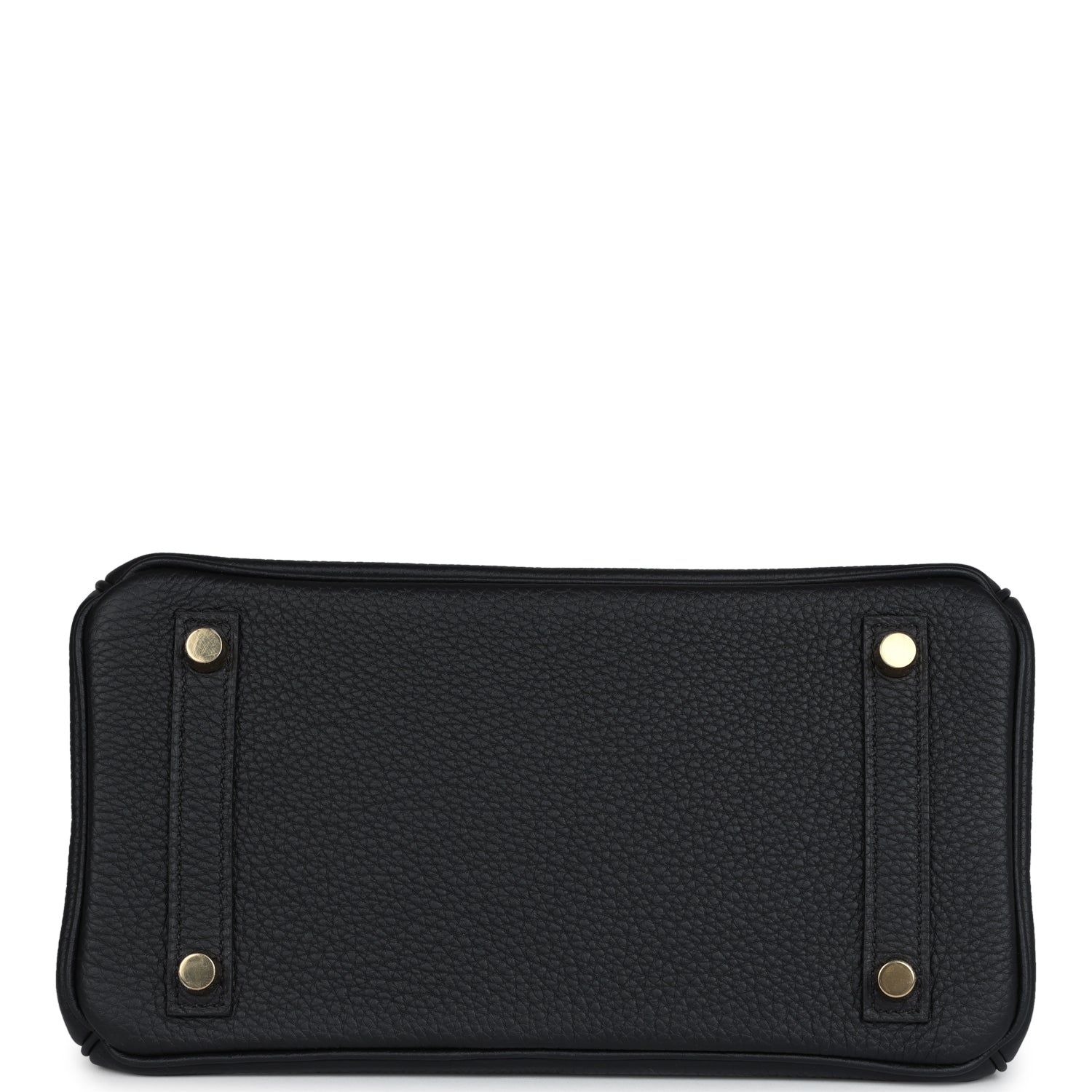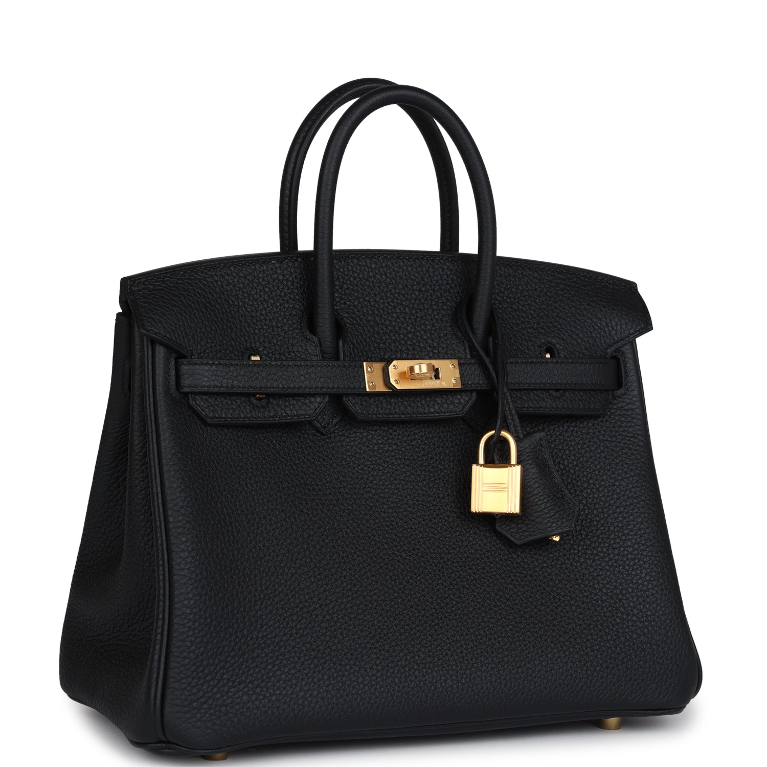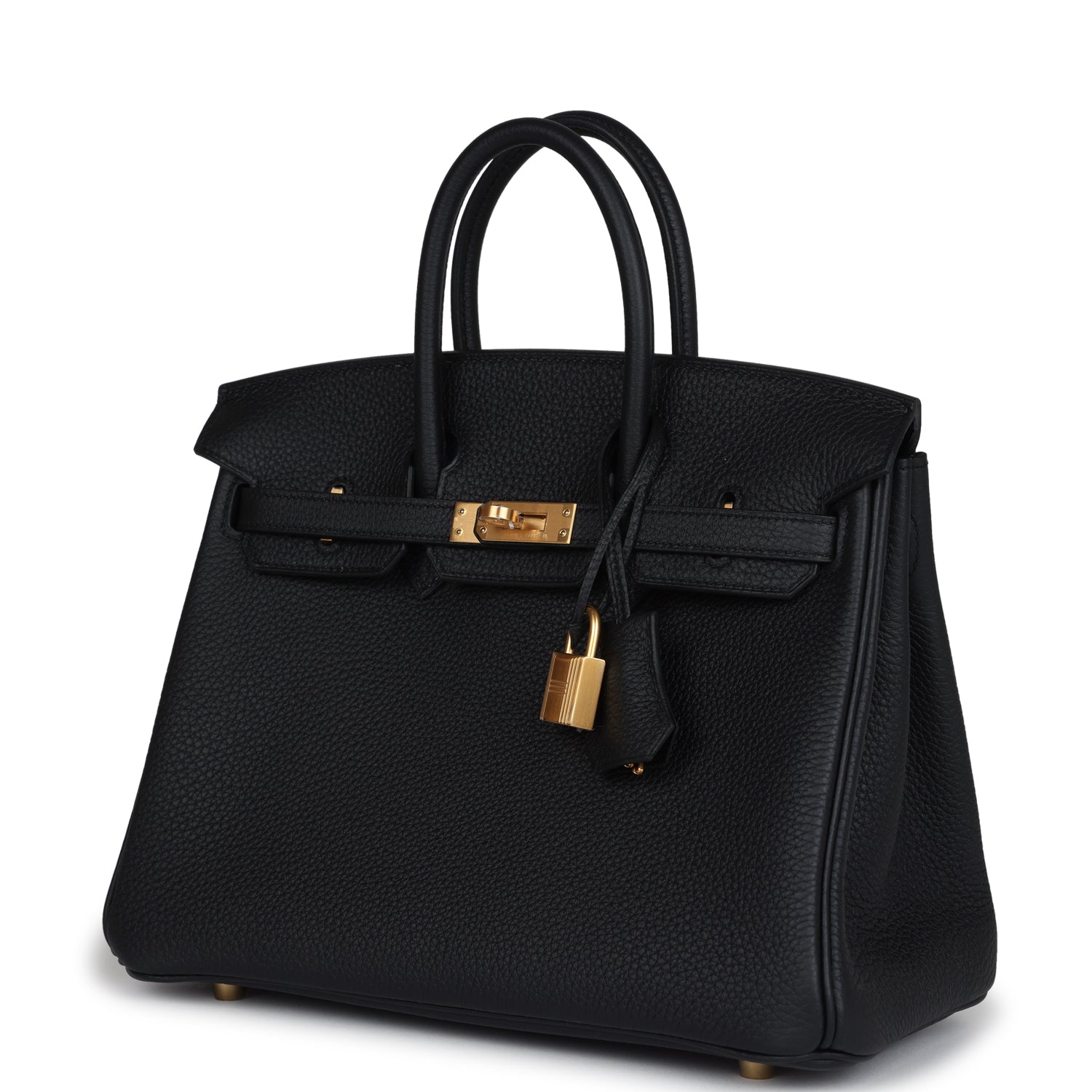 This Black togo leather with brushed gold hardware, has tonal stitching, front flap, two straps with center toggle closure, clochette with lock and two keys, and double rolled handles.