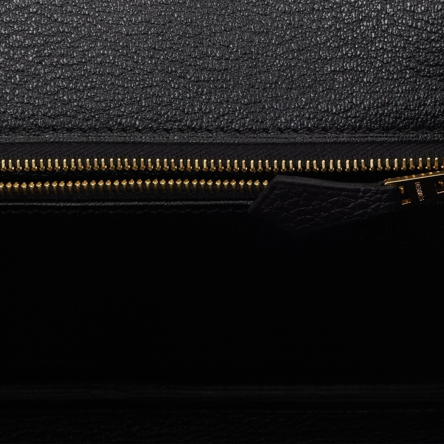 The interior is lined with black chevre and has a zip pocket with an Hermes engraved zipper pull and an open pocket on the opposite side.