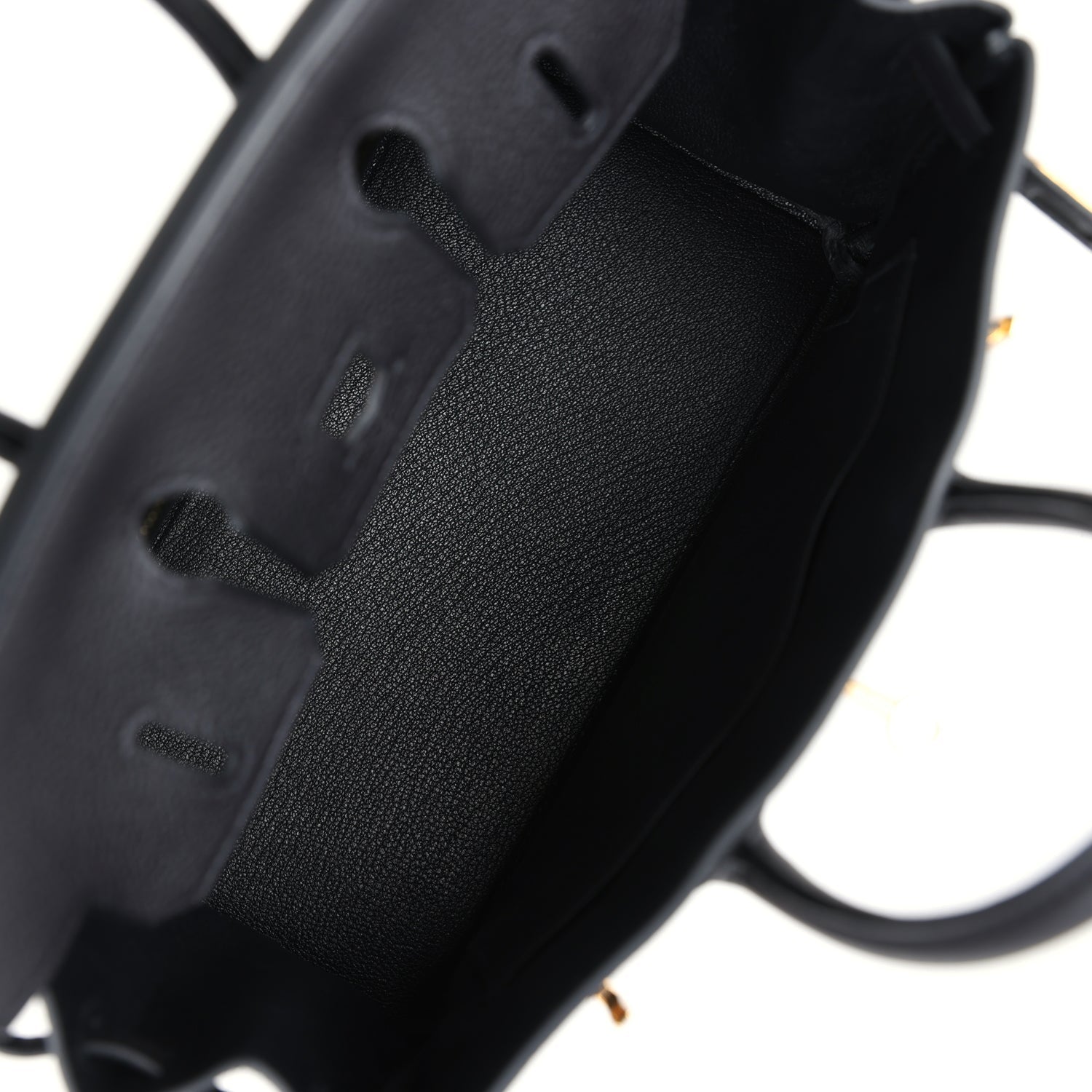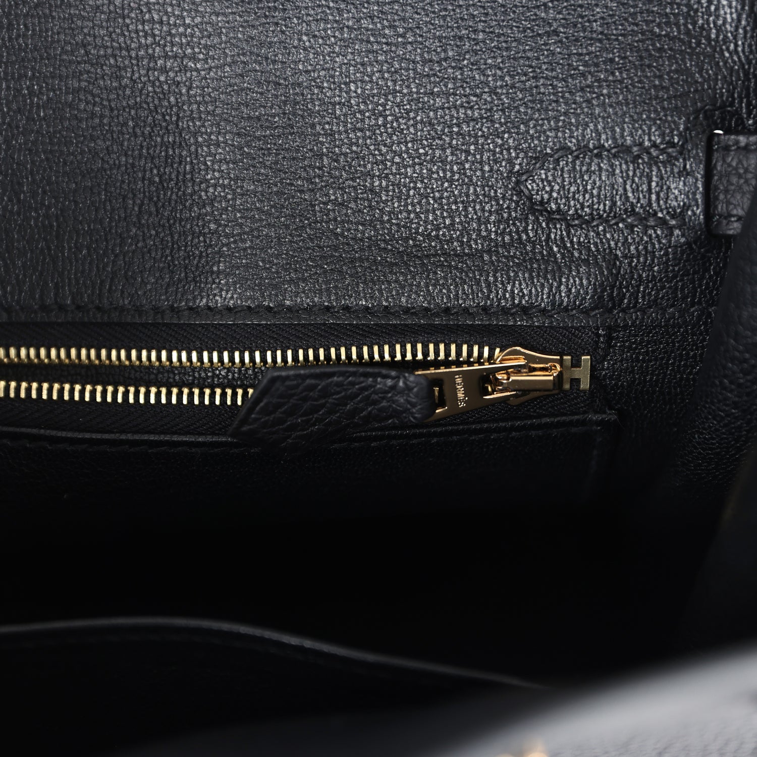 The interior is lined with black chevre and has a zip pocket with an Hermes engraved zipper pull and an open pocket on the opposite side.