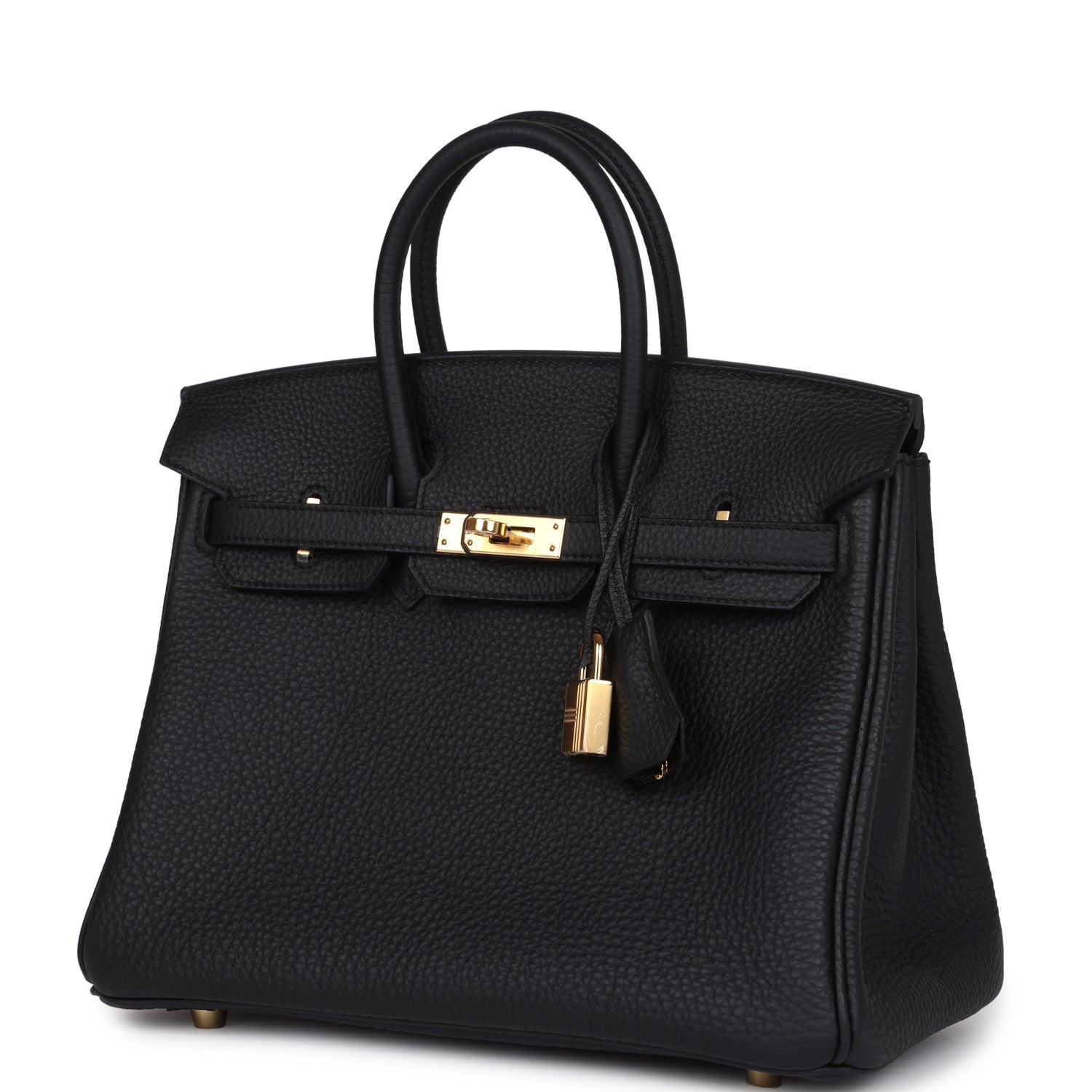 This Birkin is in Black togo leather with gold hardware, has tonal stitching, front flap, two straps with center toggle closure, clochette with lock and two keys, and double rolled handles.