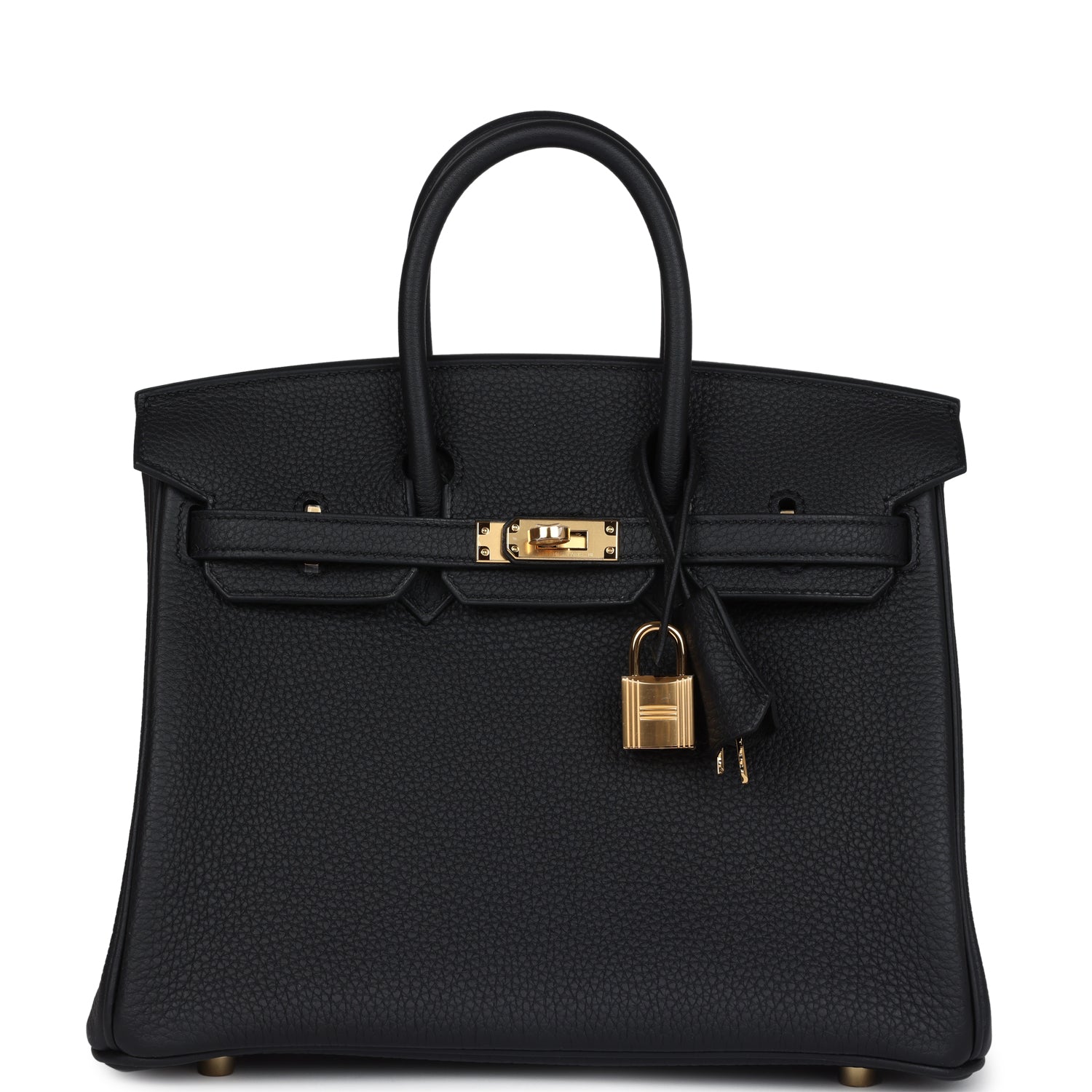 This Birkin is in Black togo leather with gold hardware, has tonal stitching, front flap, two straps with center toggle closure, clochette with lock and two keys, and double rolled handles.