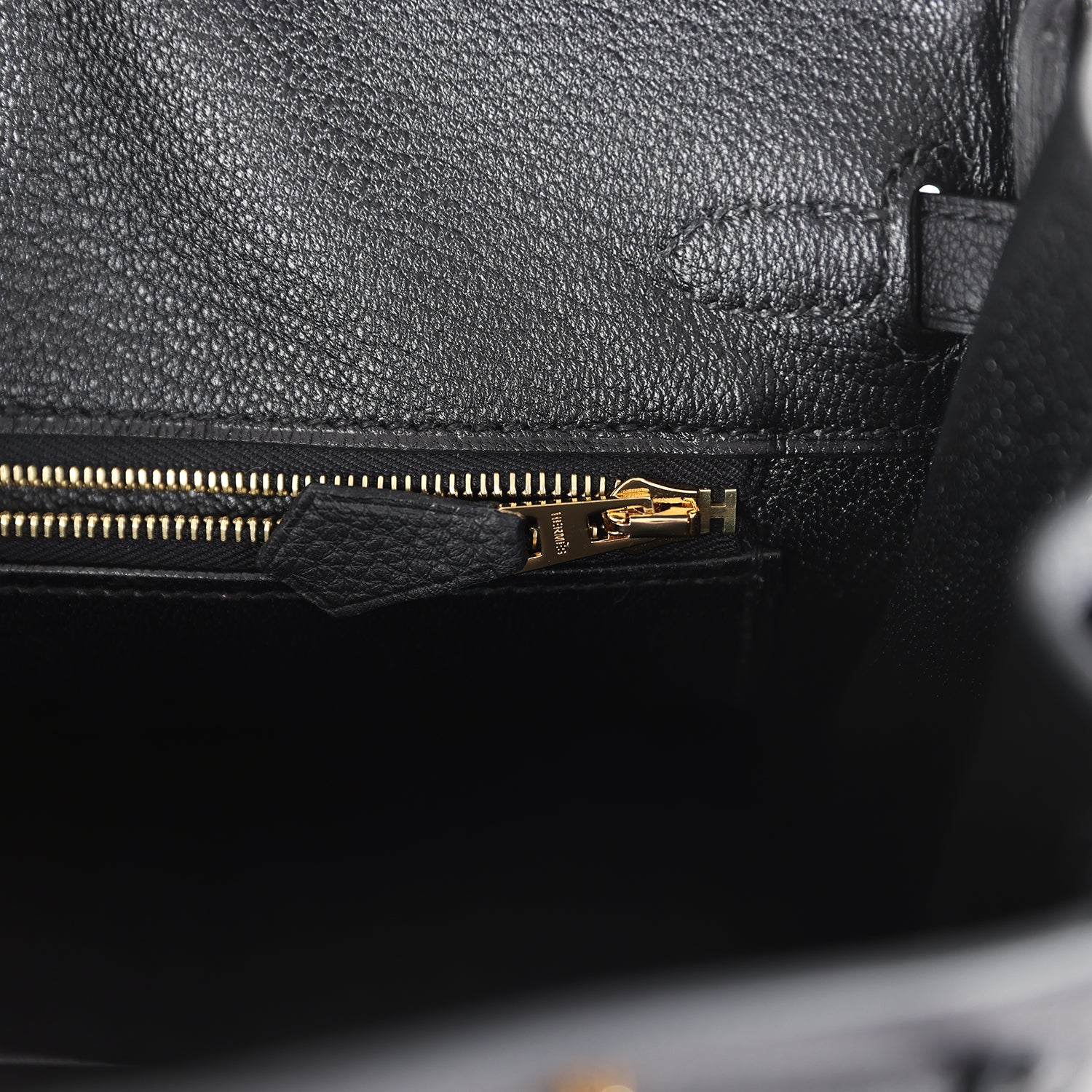 The interior is lined with Black chevre and has a zip pocket with an Hermes engraved zipper pull and an open pocket on the opposite side.