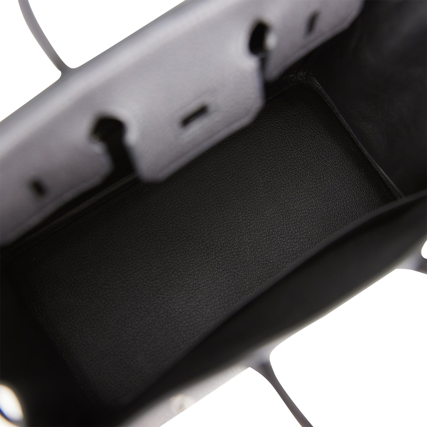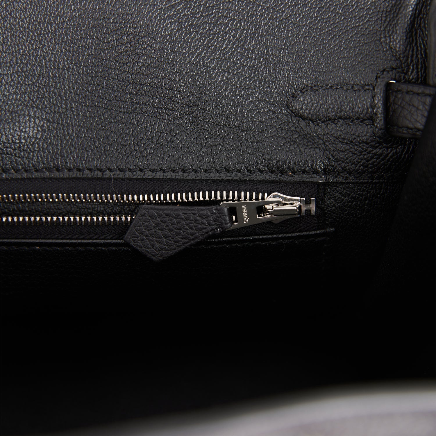 The interior is lined with black chevre and has a zip pocket with an Hermes engraved zipper pull and an open pocket on the opposite side.