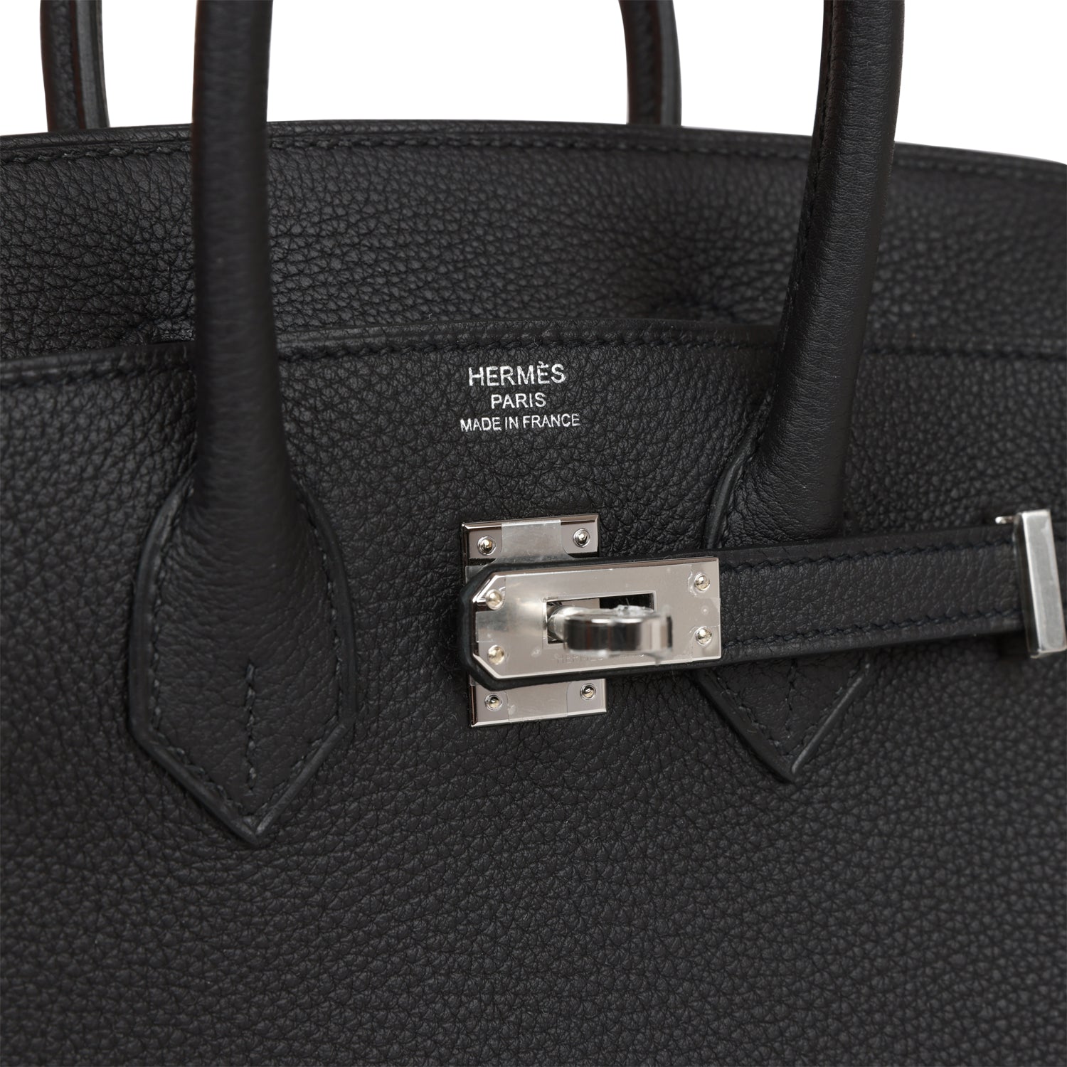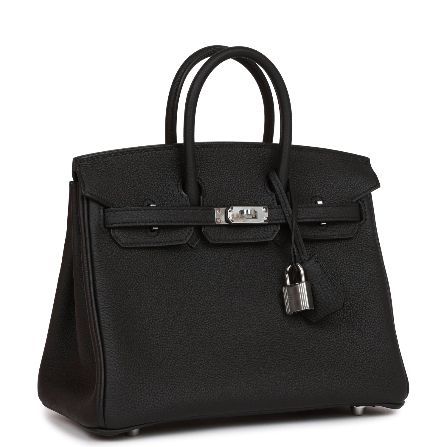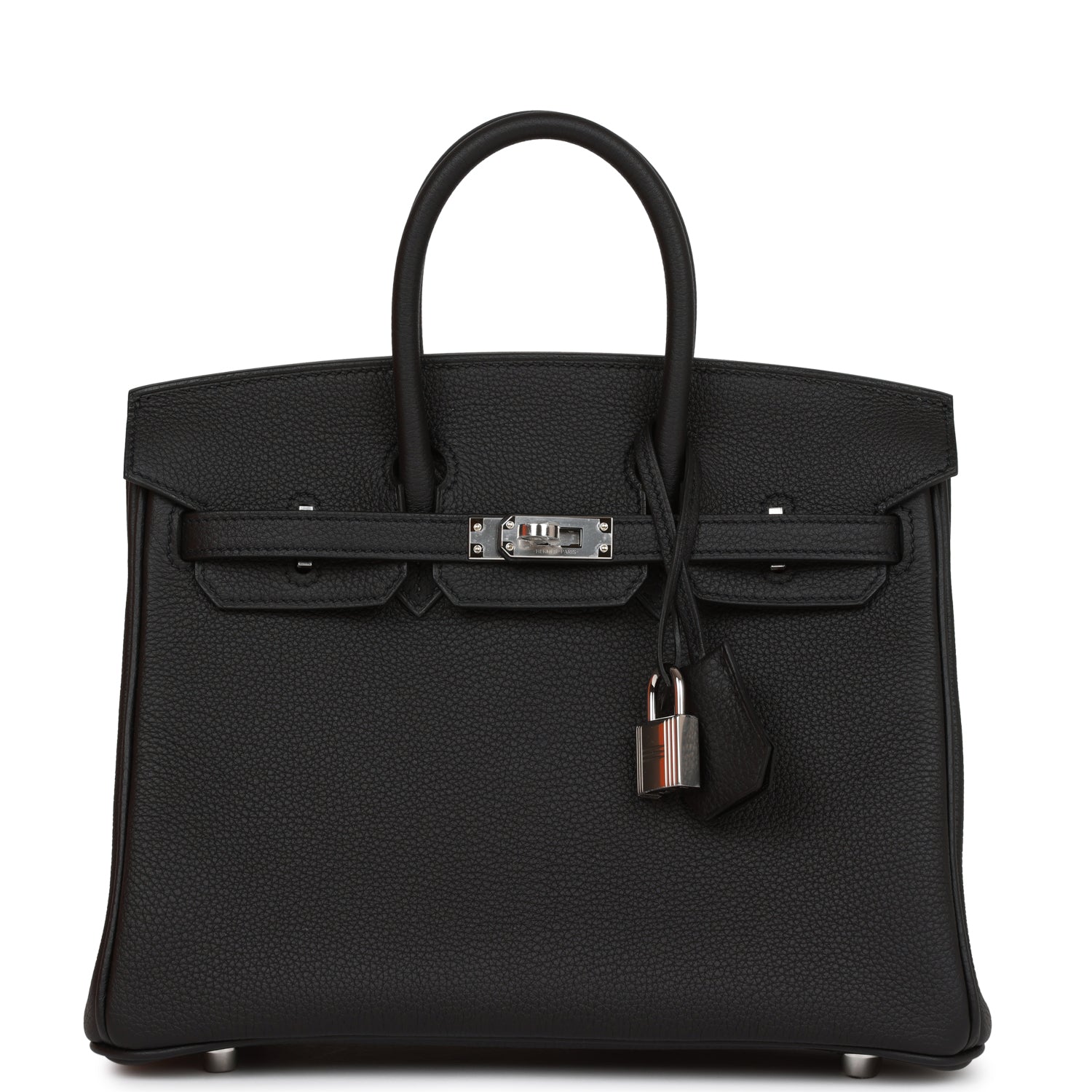This Birkin is in Black togo leather with palladium hardware and has tonal stitching, front flap, two straps with center toggle closure, clochette with lock and two keys, and double rolled handles.
