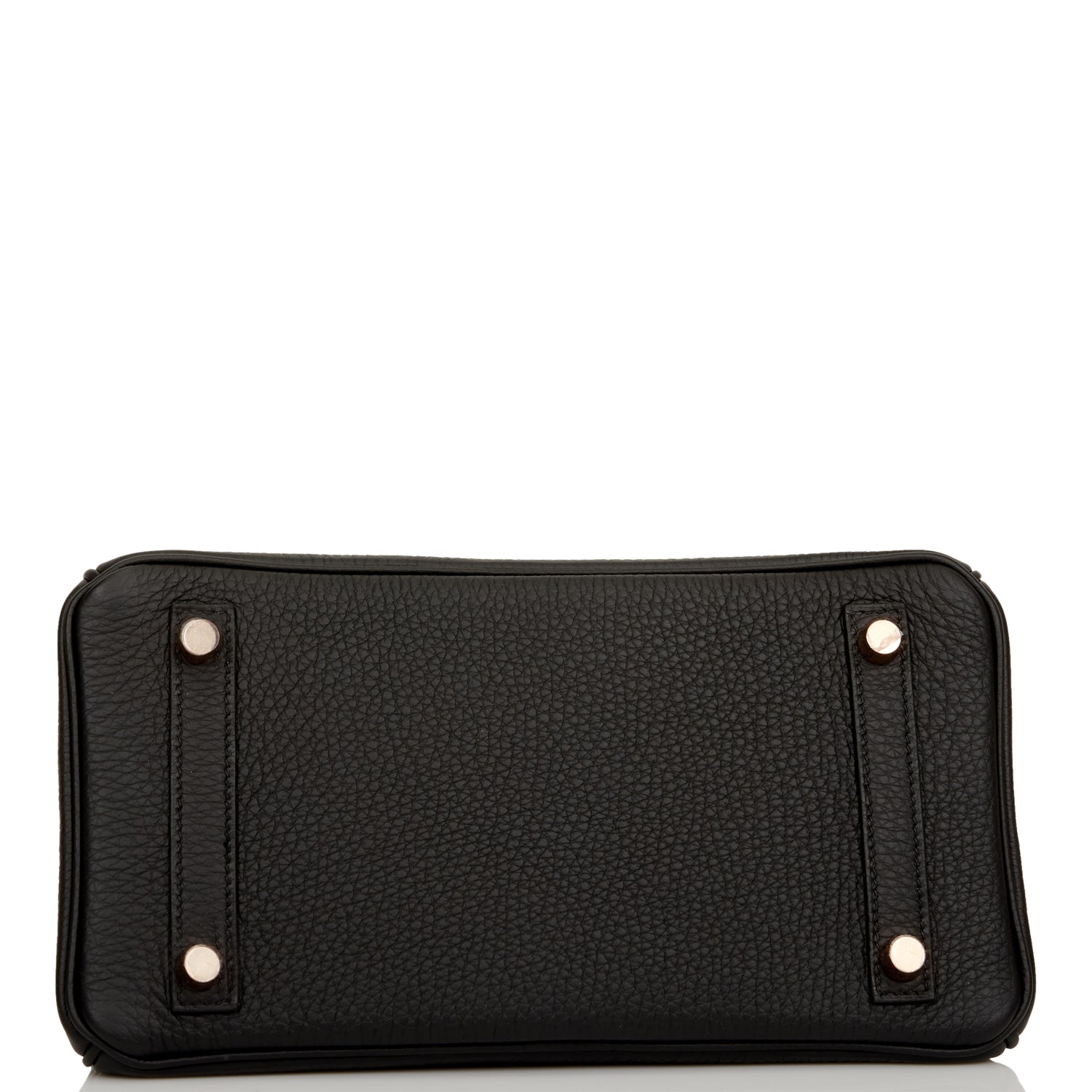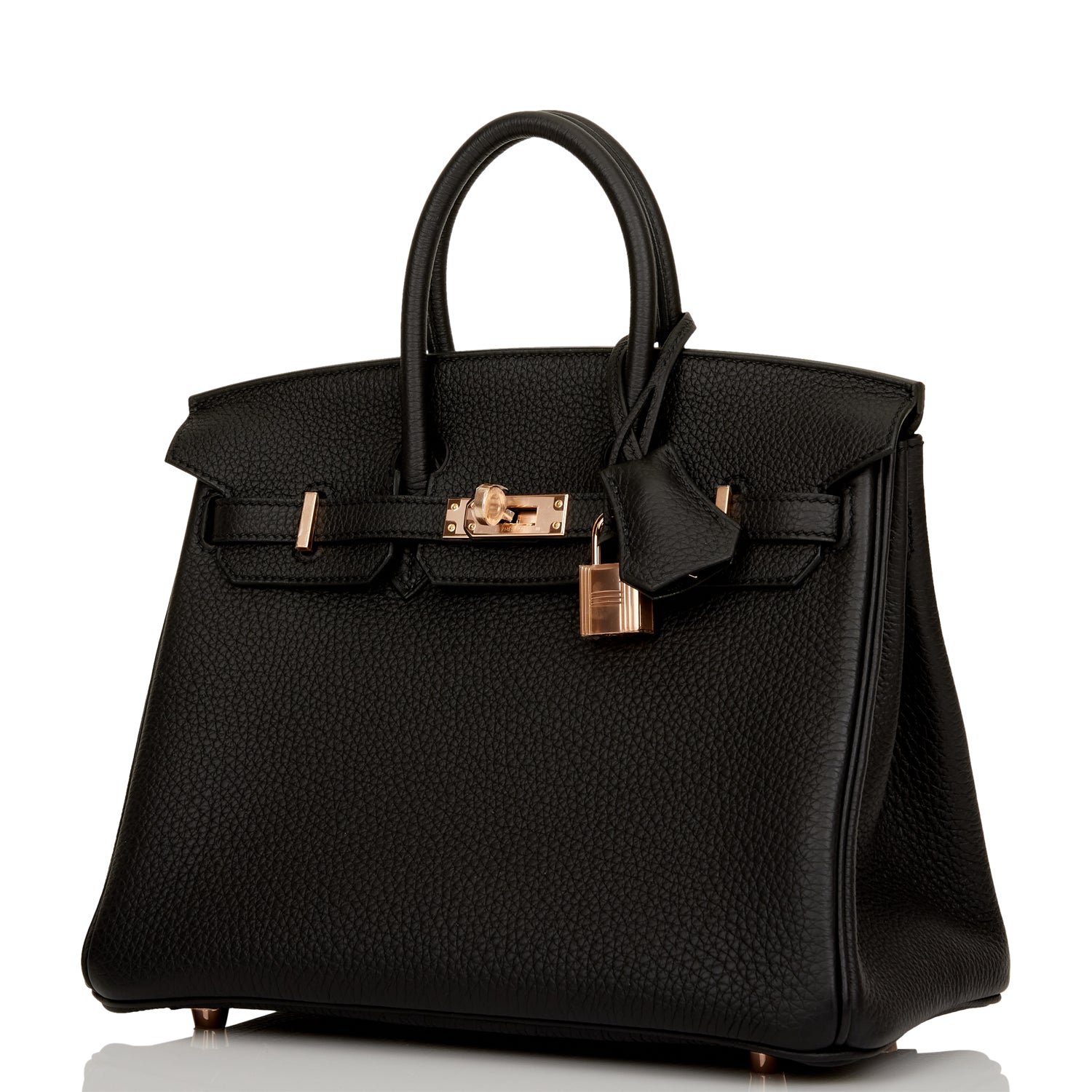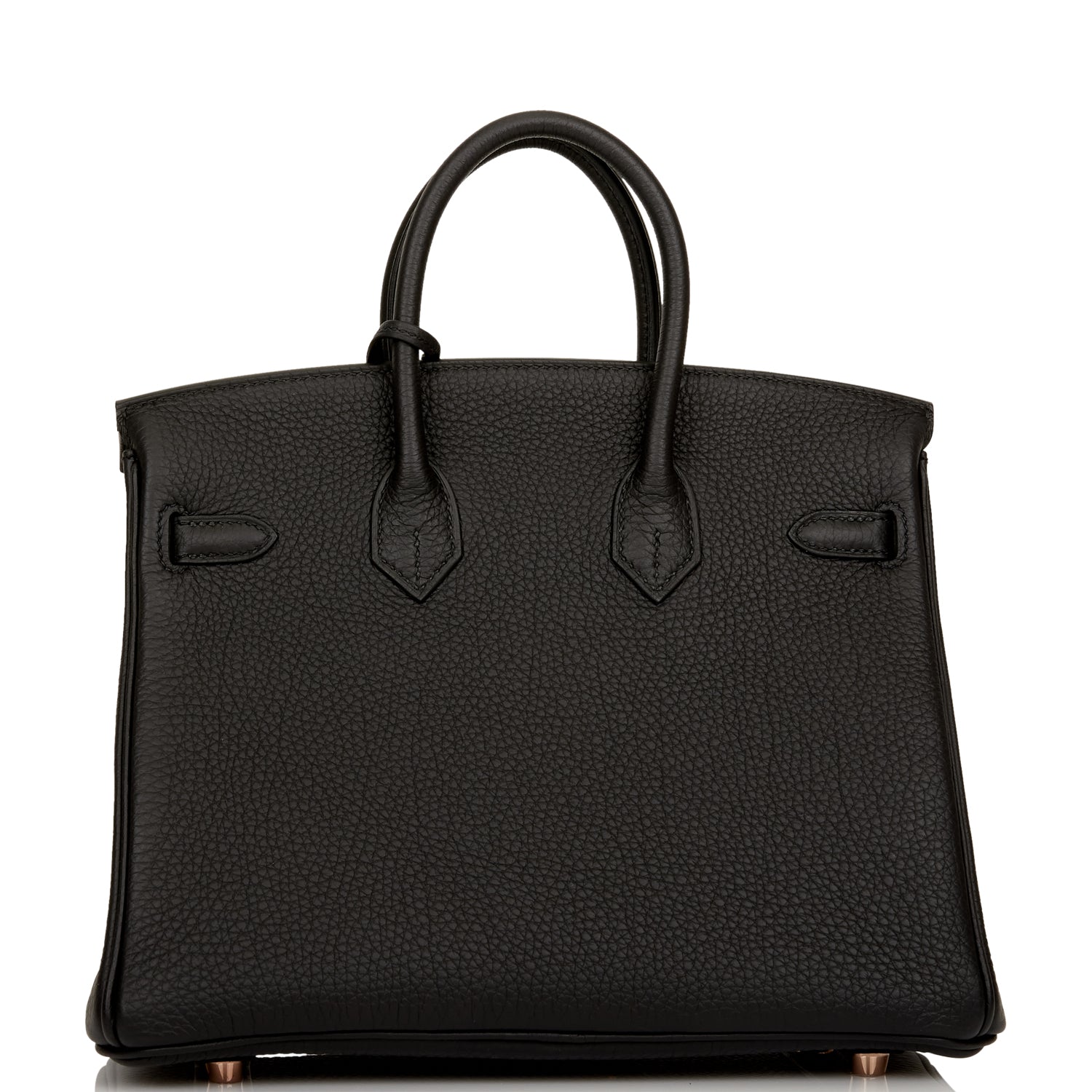 This Birkin is in Black togo leather with rose gold hardware and has tonal stitching, front flap, two straps with center toggle closure, clochette with lock and two keys, and double rolled handles.