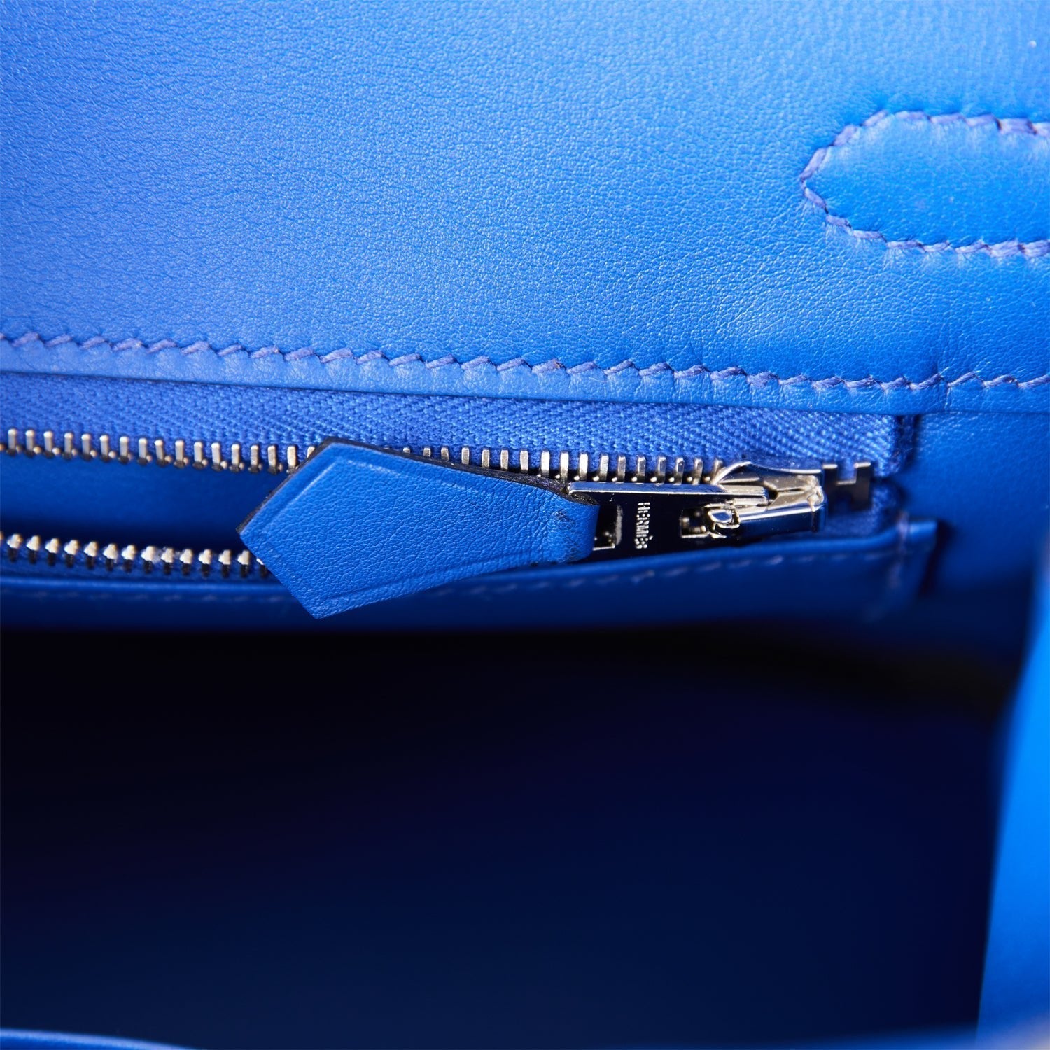 The interior is lined with Bleu Electric chevre and has one zip pocket with an Hermes engraved zipper pull and an open pocket on the opposite side.