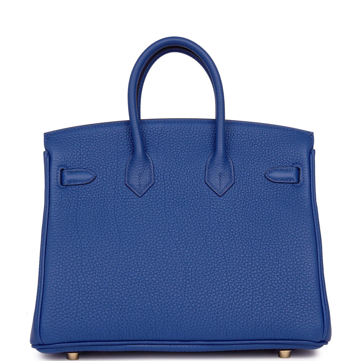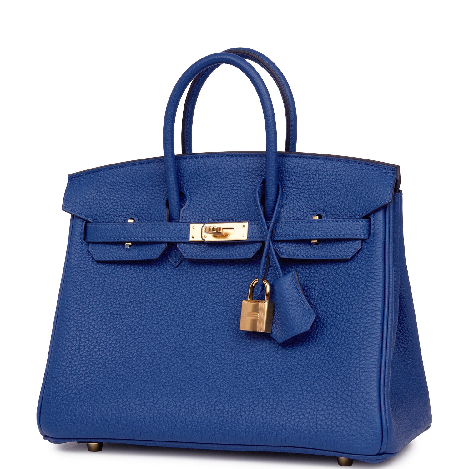 This Birkin is in Bleu France togo leather with gold hardware and has tonal stitching, front flap, two straps with center toggle closure, clochette with lock and two keys, and double rolled handles.