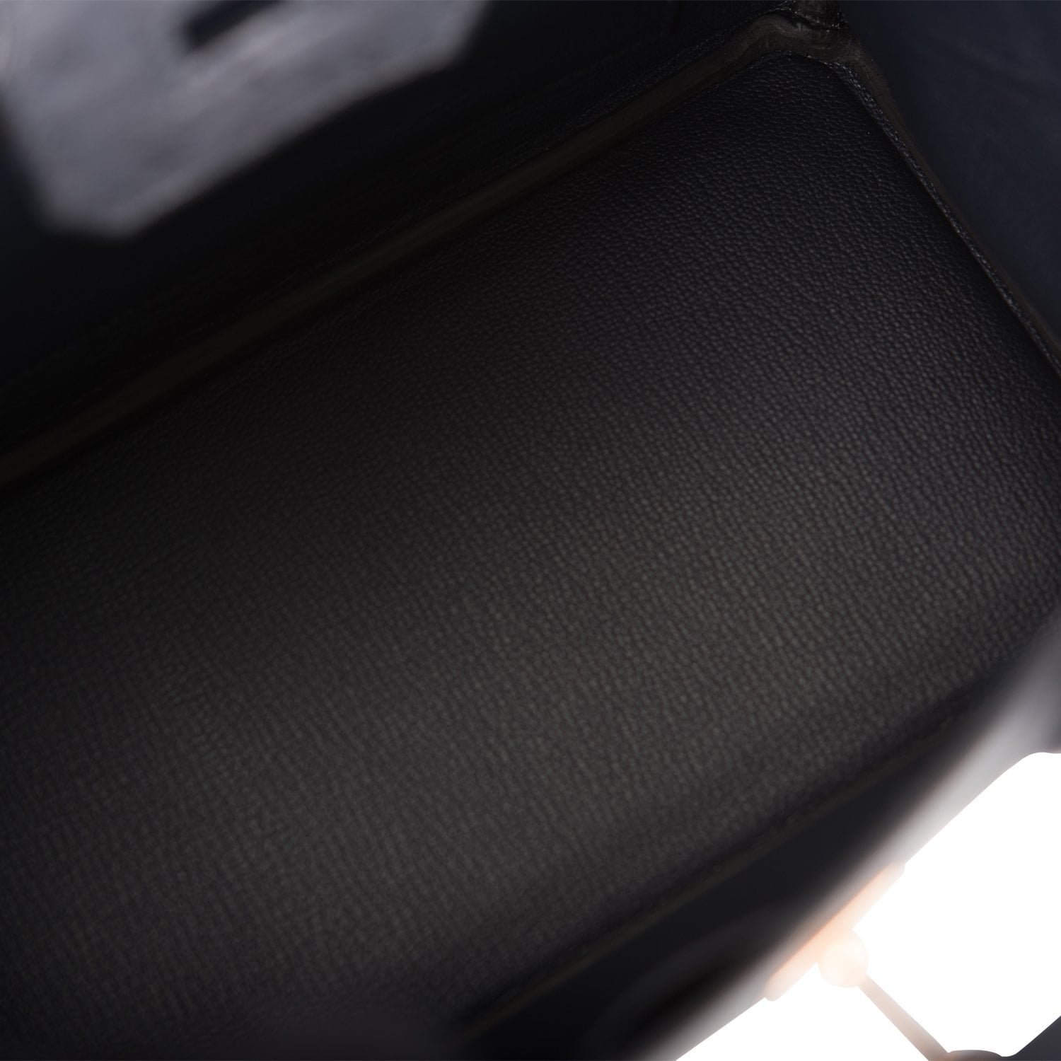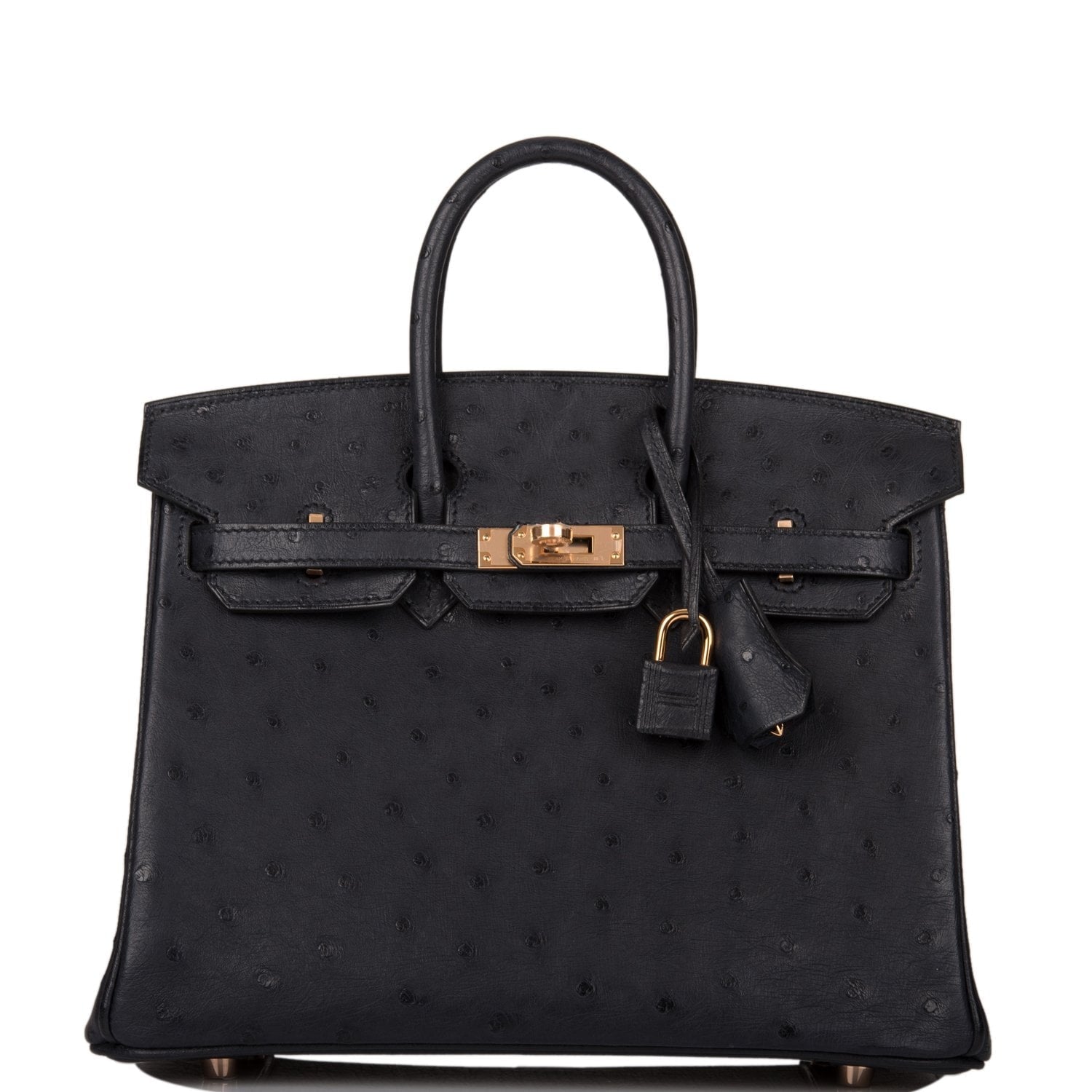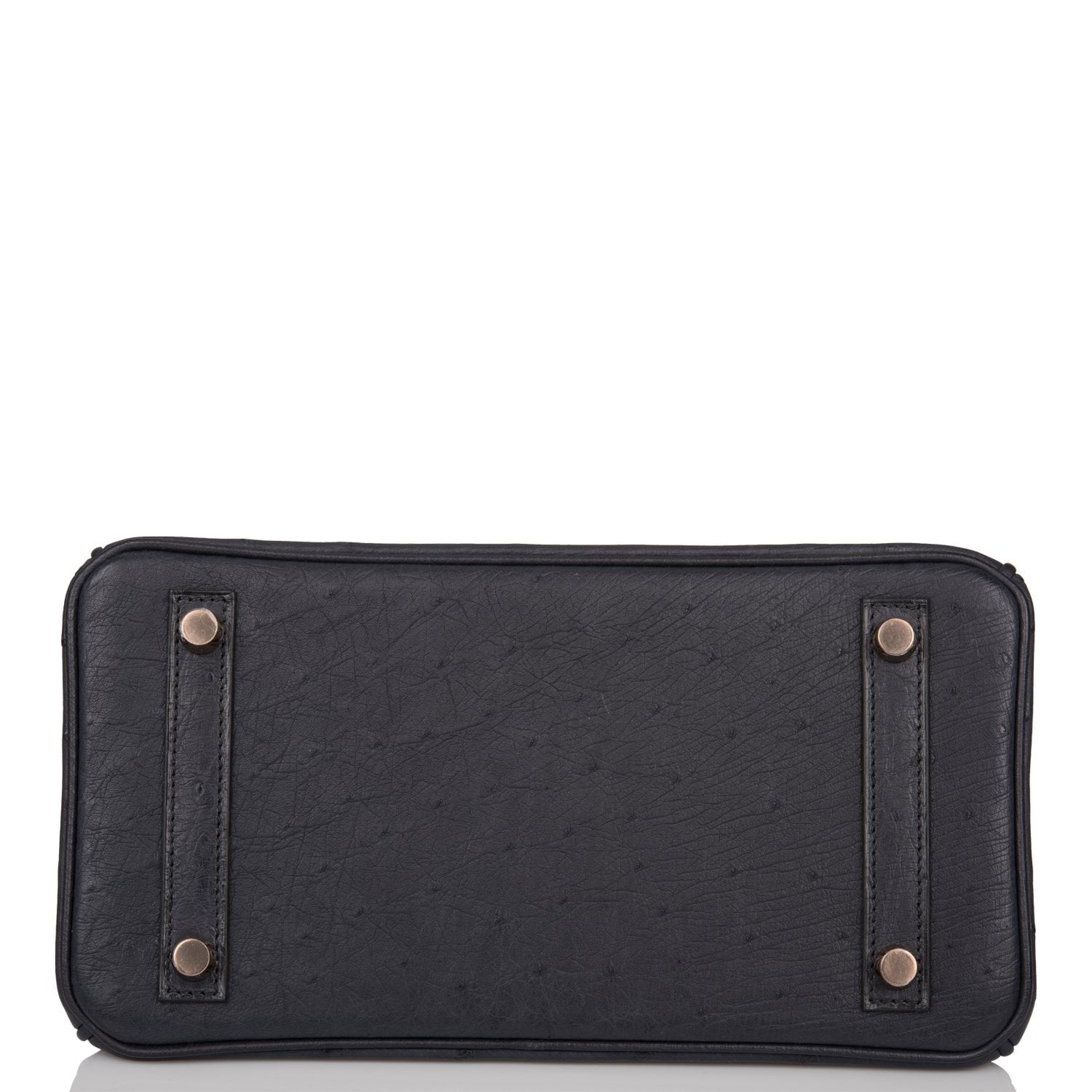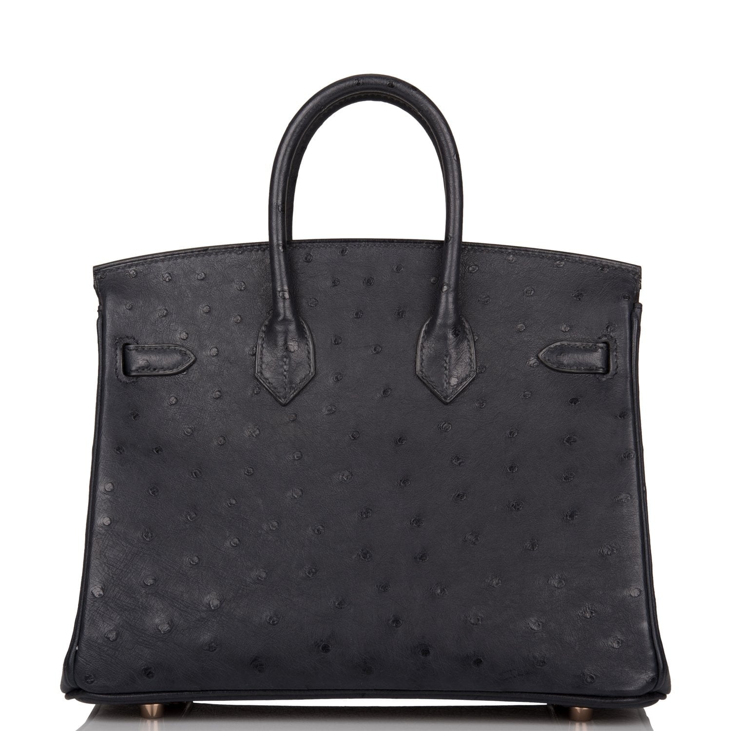 This Birkin is in Bleu Indigo ostrich with rose gold hardware and features tonal stitching, front flap, two straps with center toggle closure, clochette with lock and two keys, and double rolled handles.