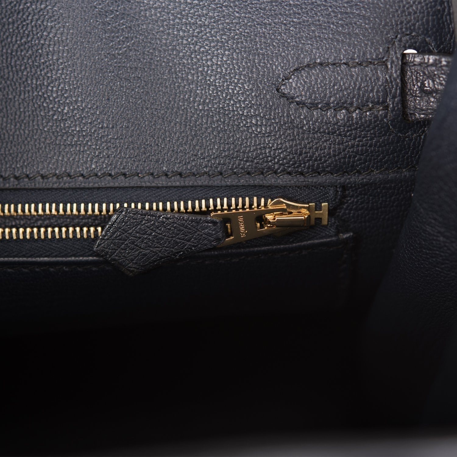 The interior is lined with Bleu Indigo chevre and has a zip pocket with an Hermes engraved zipper pull and an open pocket on the opposite side.