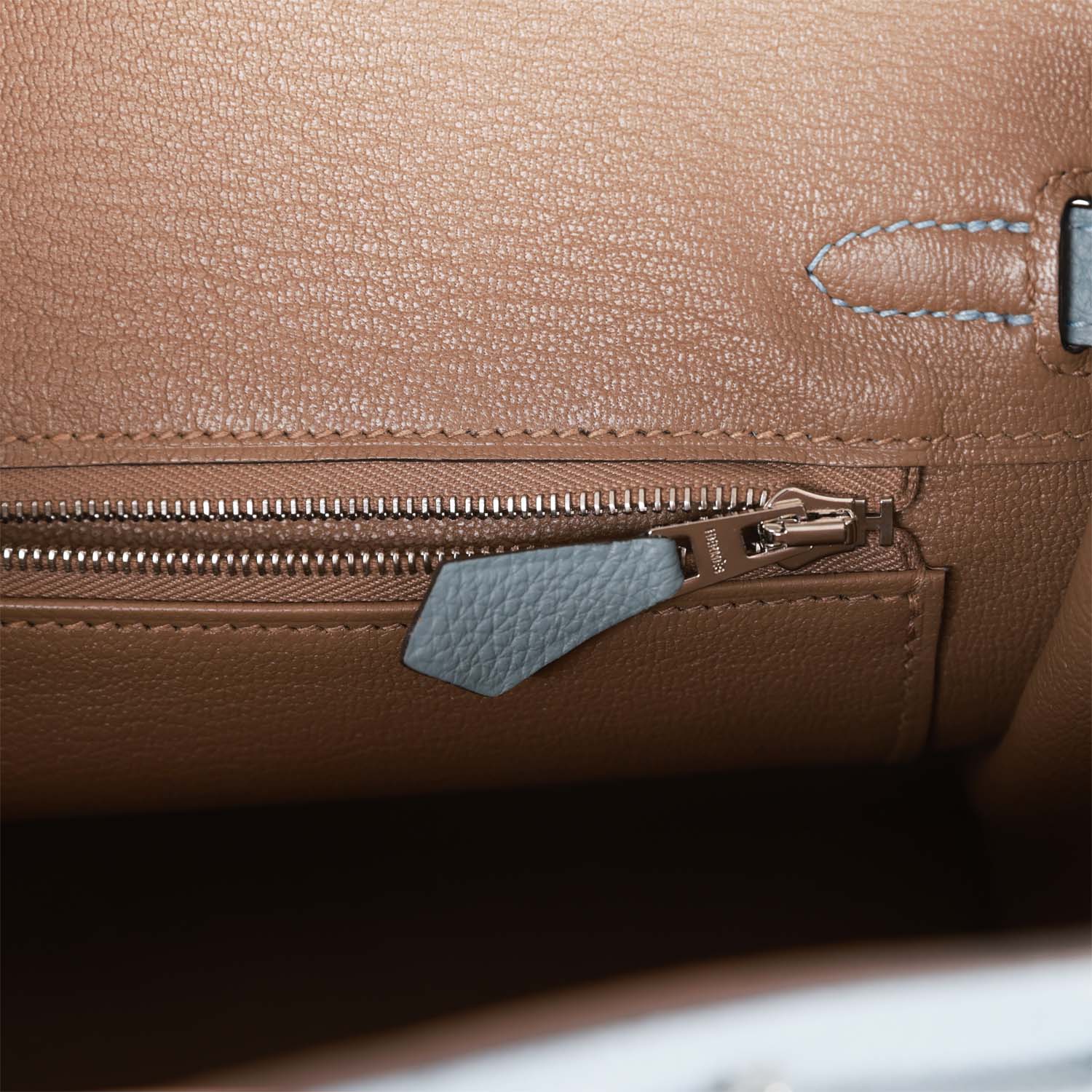 The interior is lined with Beige de Weimar chevre and has one zip pocket with an Hermes engraved zipper pull and an open pocket on the opposite side.