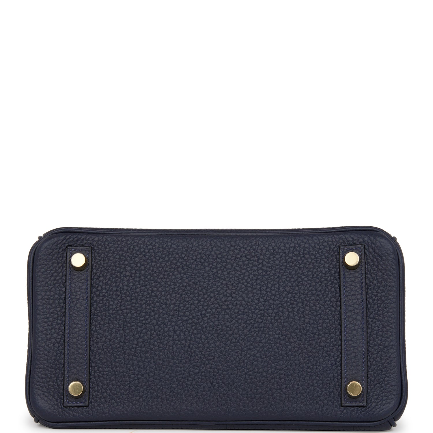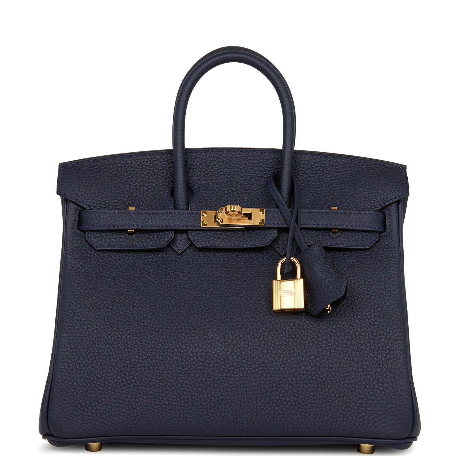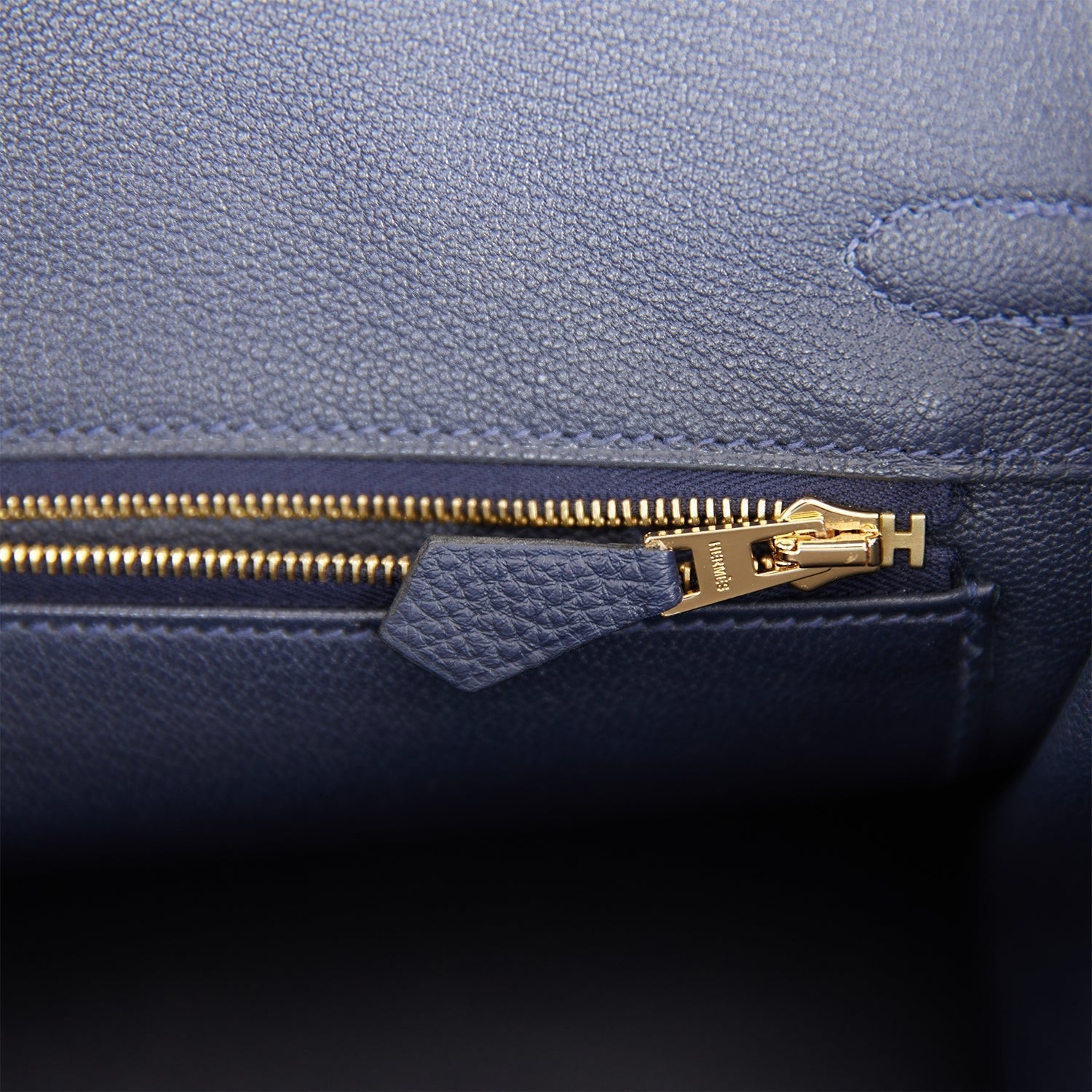 This Birkin is in Bleu Nuit togo leather with gold hardware and has tonal stitching, front flap, two straps with center toggle closure, clochette with lock and two keys, and double rolled handles.