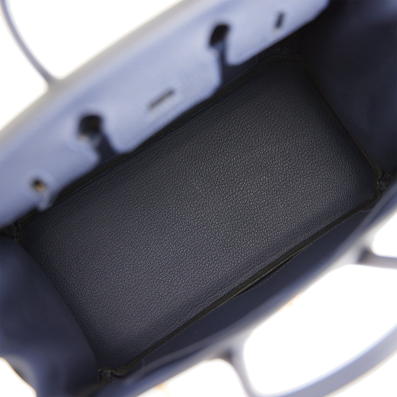 The interior is lined with Bleu Nuit chevre and has a zip pocket with an Hermes engraved zipper pull and an open pocket on the opposite side.