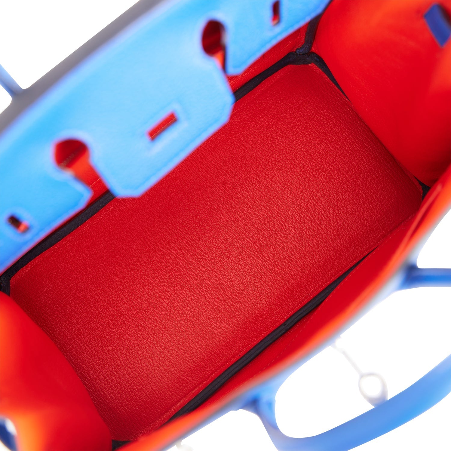 This Birkin is in Bleu Royal togo leather with palladium hardware and has tonal stitching, two straps with front toggle closure, clochette with lock and two keys and double rolled handles.