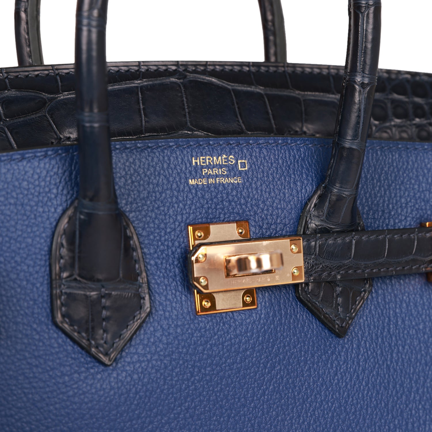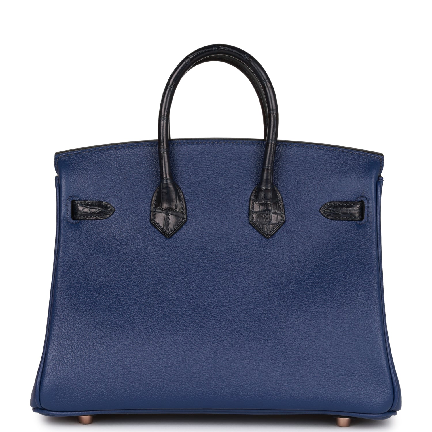 This Birkin is in Bleu Saphir matte Mississippienis alligator and Bleu Marine togo leather with rose gold hardware and has tonal stitching, front strap, two straps with center toggle closure, clochette with lock and two keys and double rolled handles.