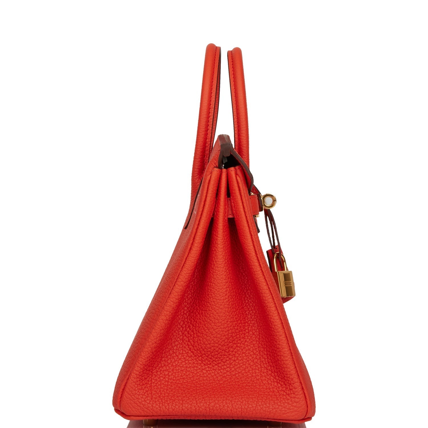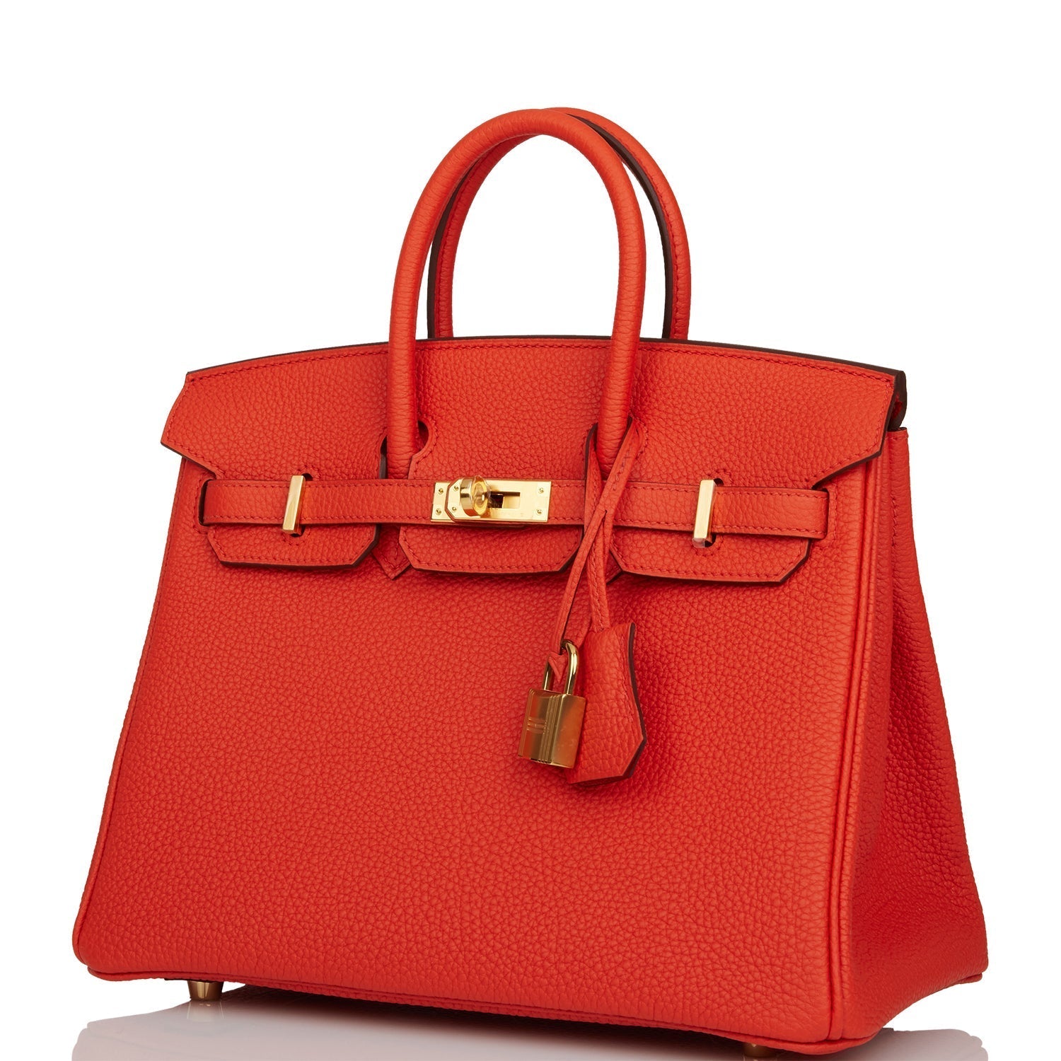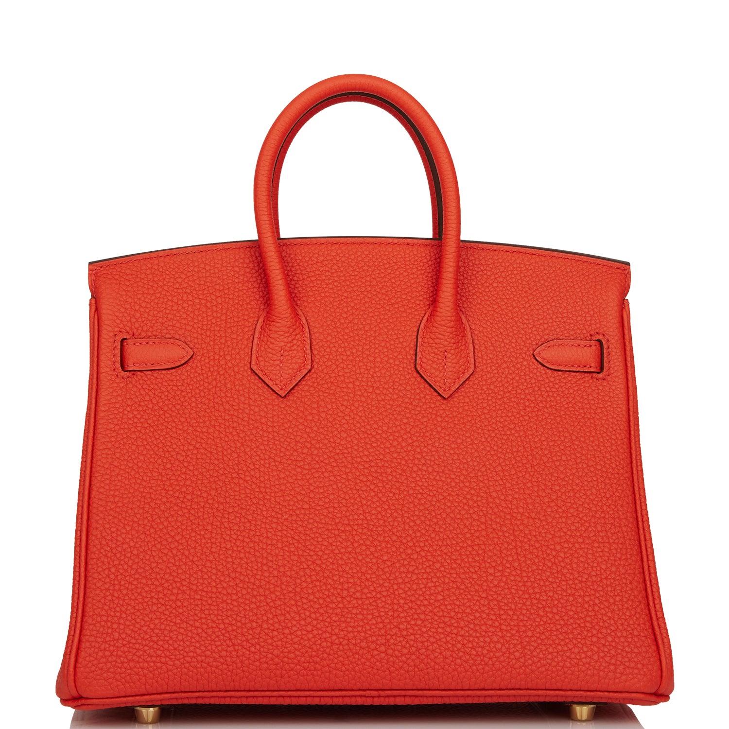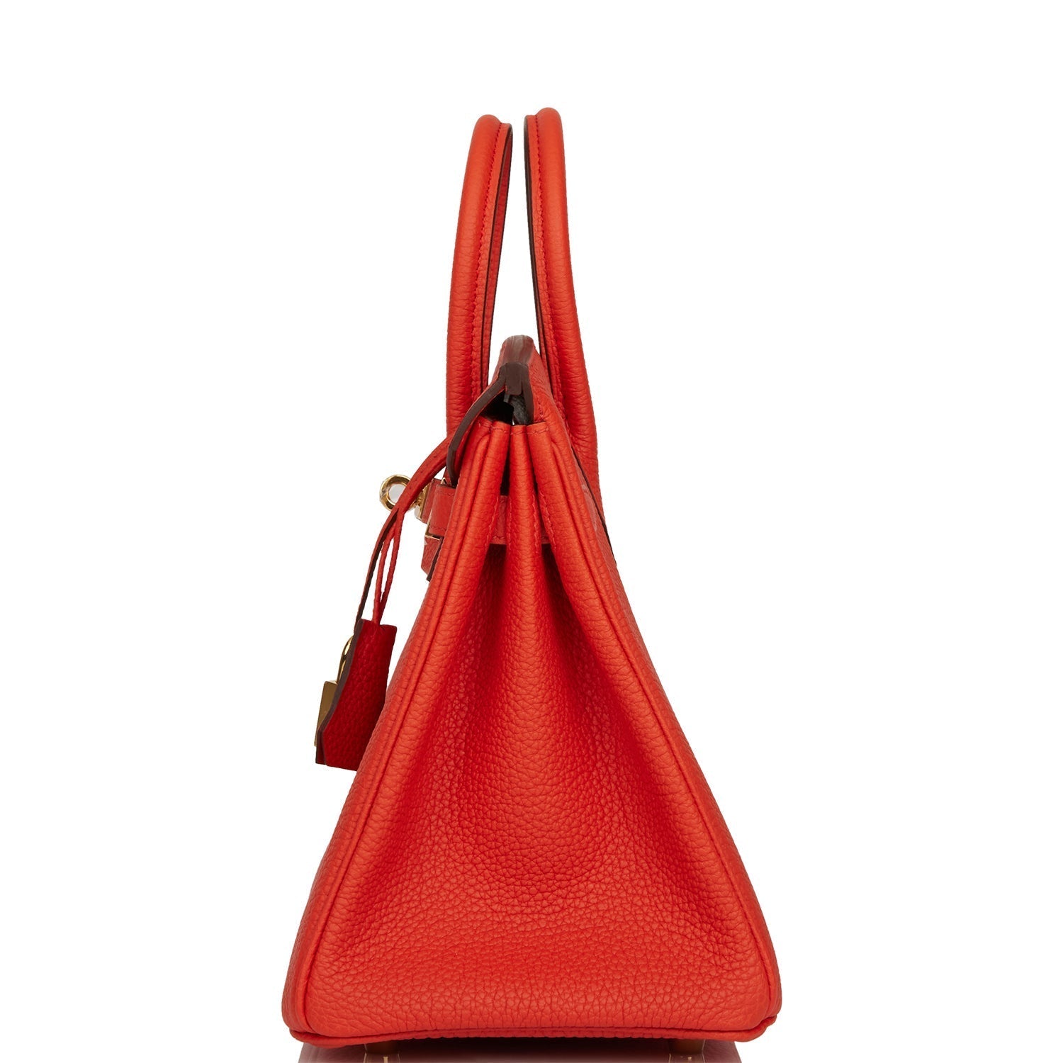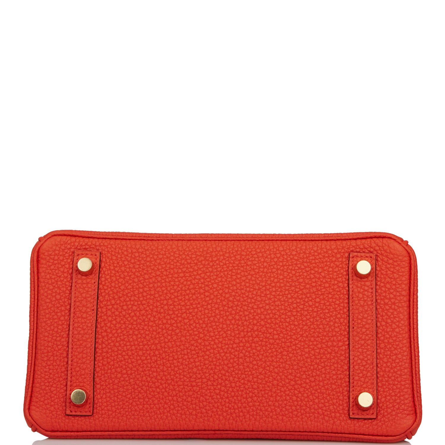 This Birkin is in Capucine togo leather with gold hardware and has tonal stitching, front flap, two straps with center toggle closure, clochette with lock and two keys, and double rolled handles.