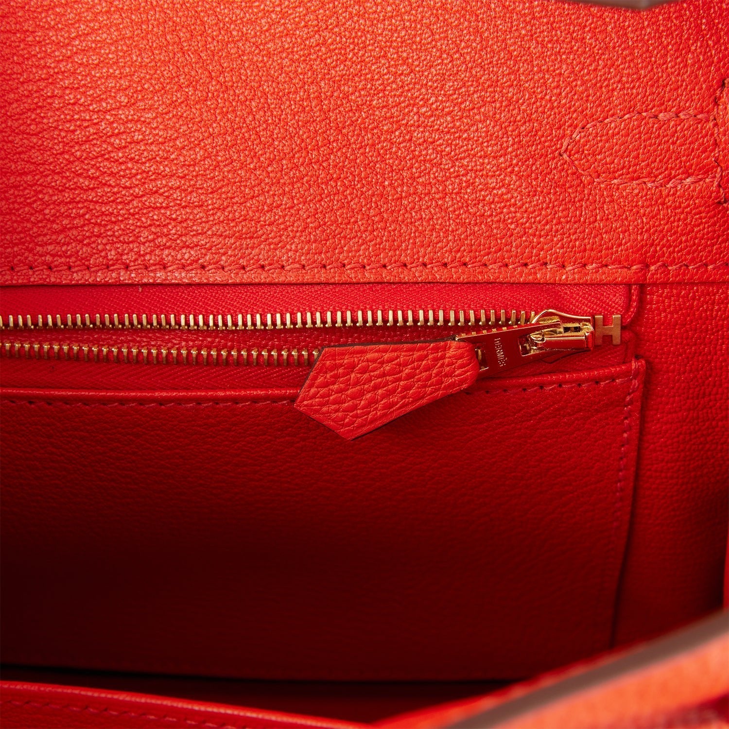 The interior is lined with Capucine chevre and has a zip pocket with an Hermes engraved zipper pull and an open pocket on the opposite side.