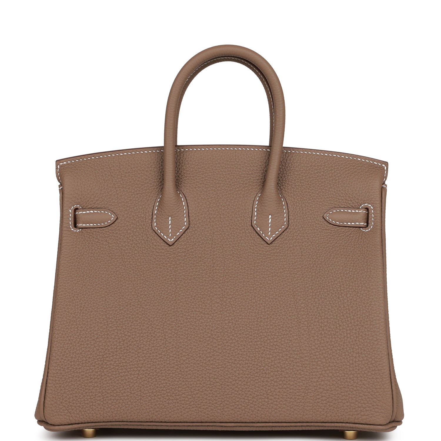 This Birkin is in Etoupe togo leather with gold hardware and has contrast stitching, front flap, two straps with center toggle closure, clochette with lock and two keys, and double rolled handles.
