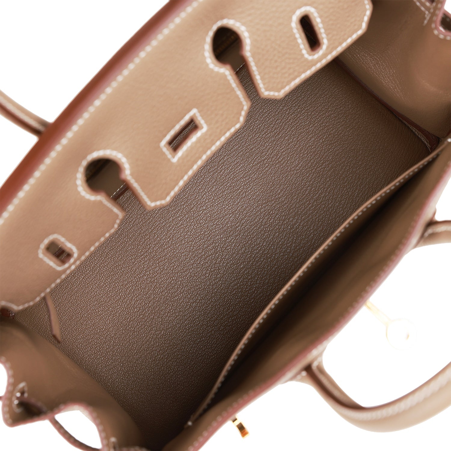 The interior is lined with Etoupe chevre and has one zip pocket with an Hermes engraved zipper pull and an open pocket on the opposite side.