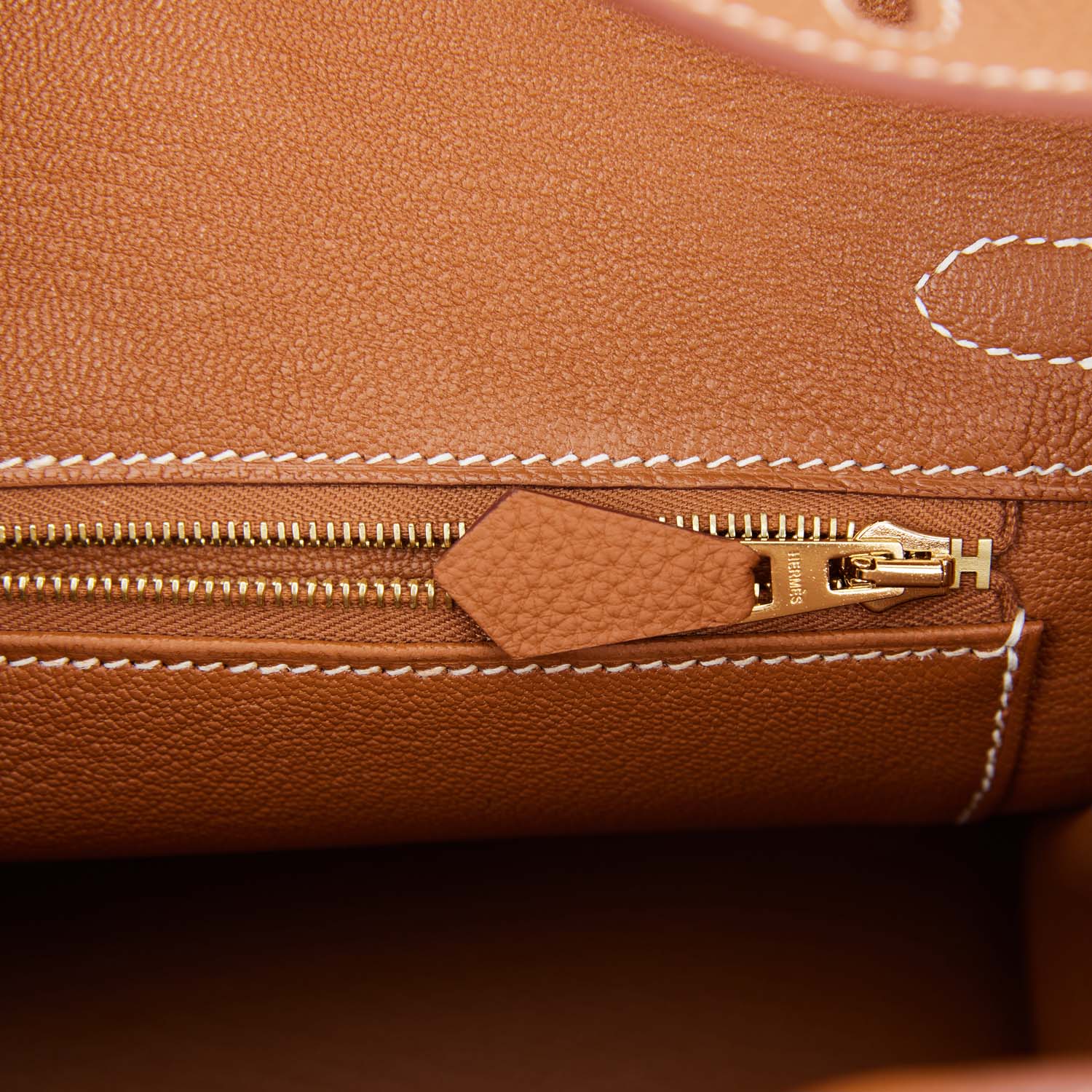 This Birkin is in Gold togo leather with gold hardware and features contrast stitching, front flap, two straps with center toggle closure, a clochette with lock and two keys and double rolled handles.