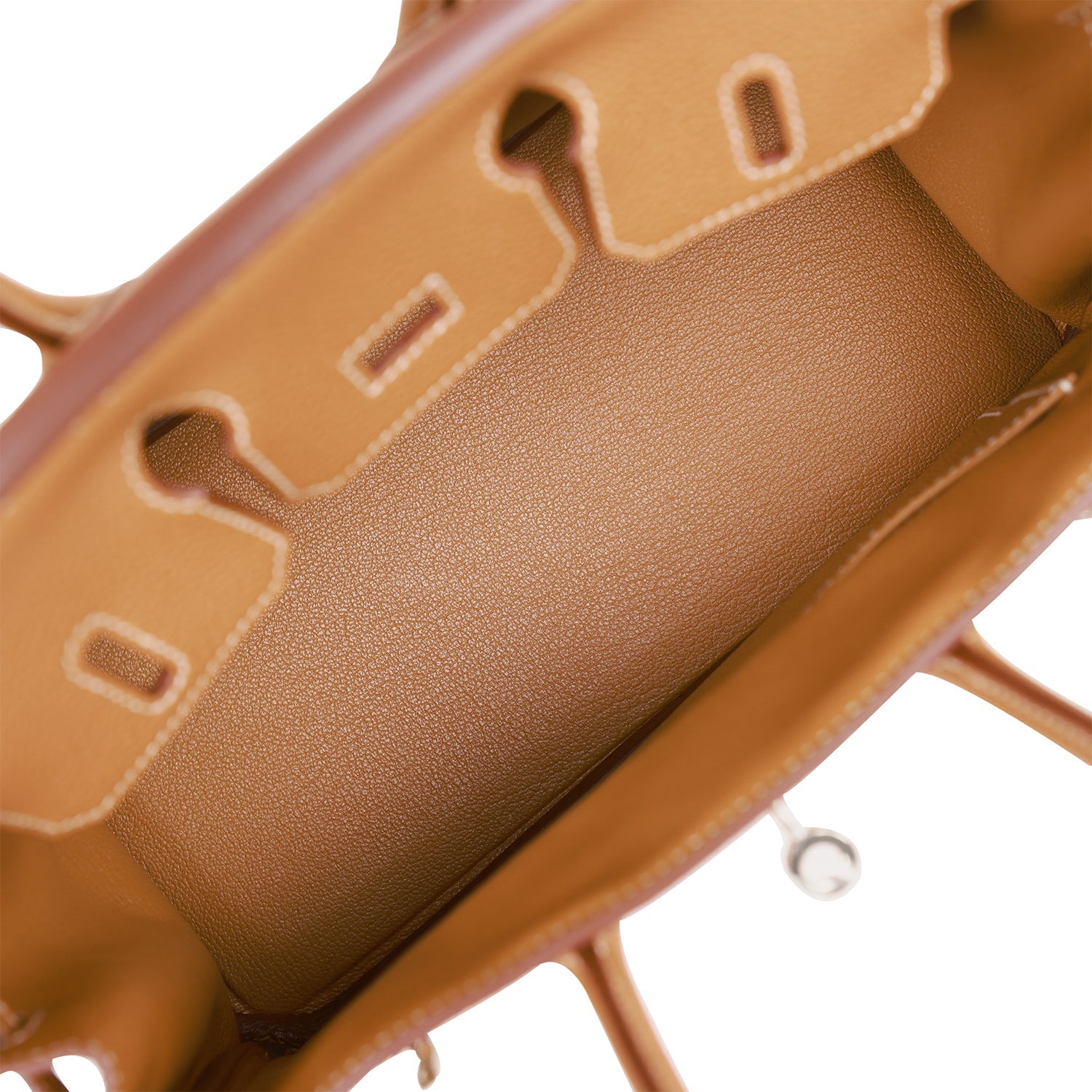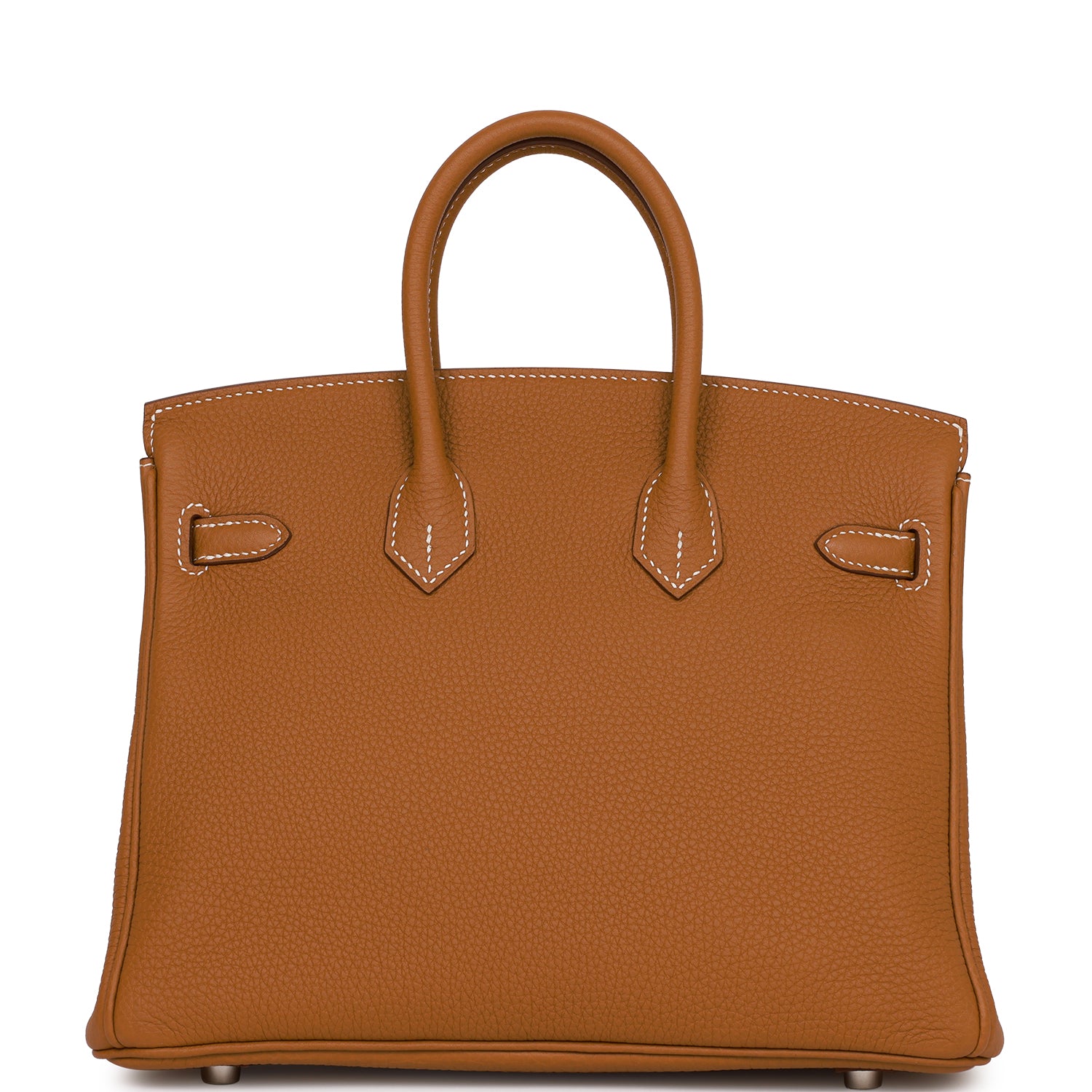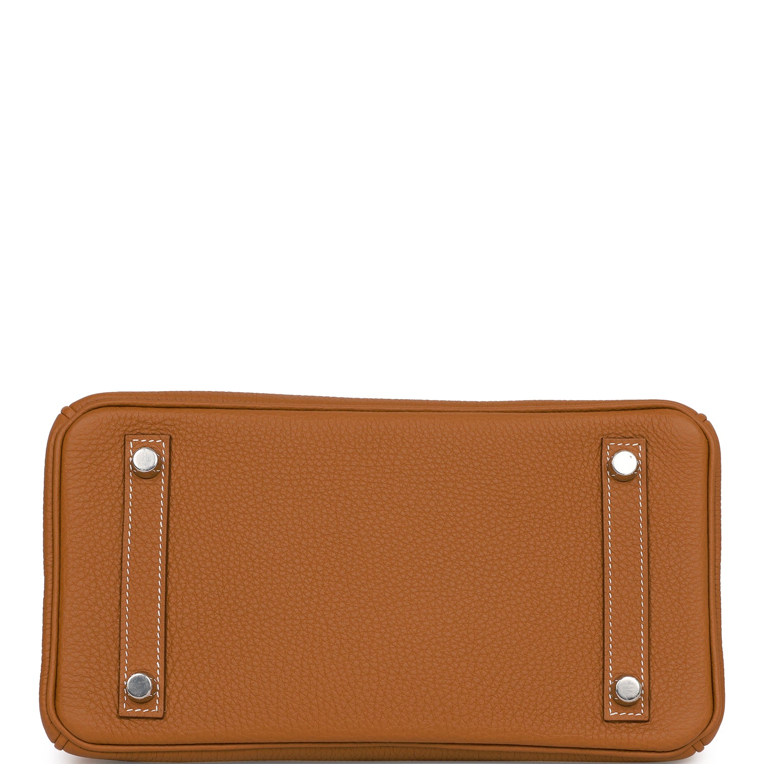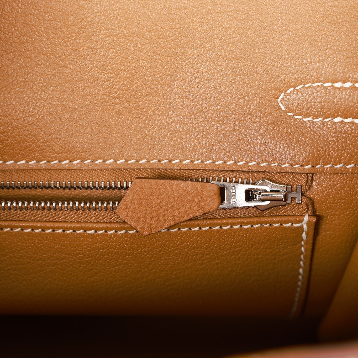 This Birkin is in Gold togo leather with palladium hardware and features contrast stitching, front flap, two straps with center toggle closure, a clochette with lock and two keys and double rolled handles.