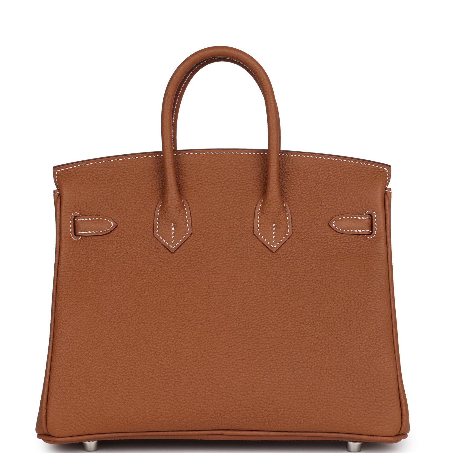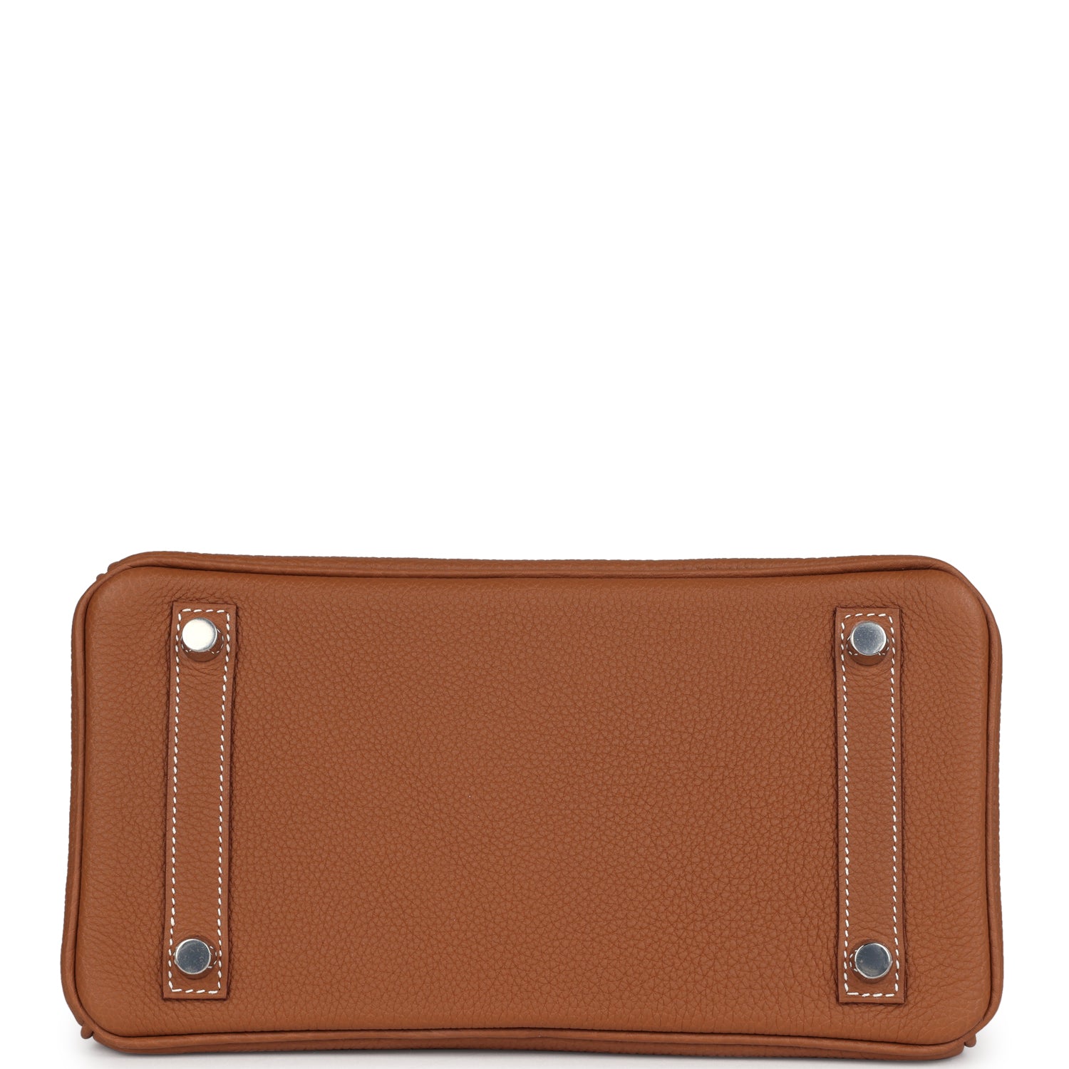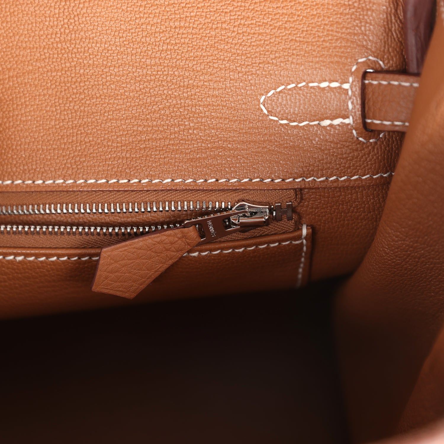 This Birkin is in Gold togo leather with palladium hardware and features contrast stitching, front flap, two straps with center toggle closure, a clochette with lock and two keys and double rolled handles.