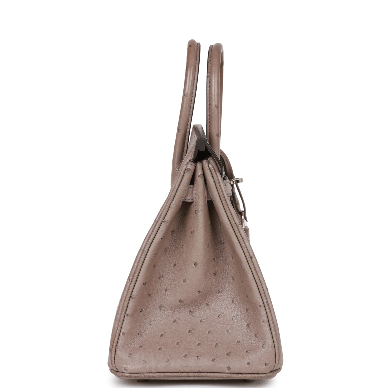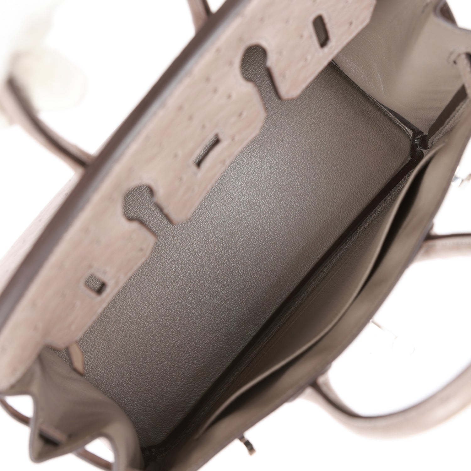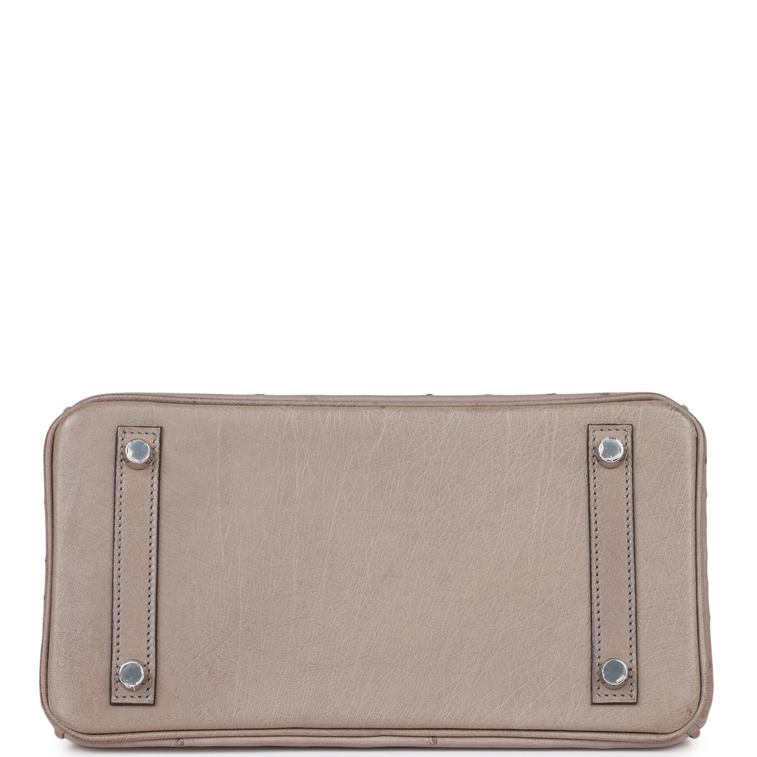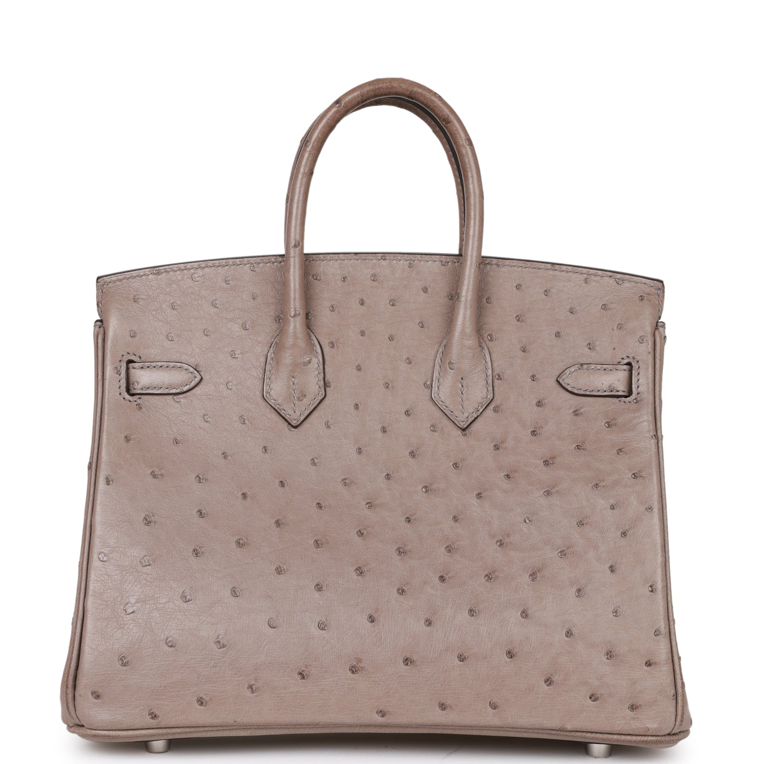 This Hermes Birkin 25cm is in Gris Tourterelle ostrich with palladium hardware, tonal stitching, front flap with two straps, front toggle closure, clochette with lock and two keys, and double rolled handles.