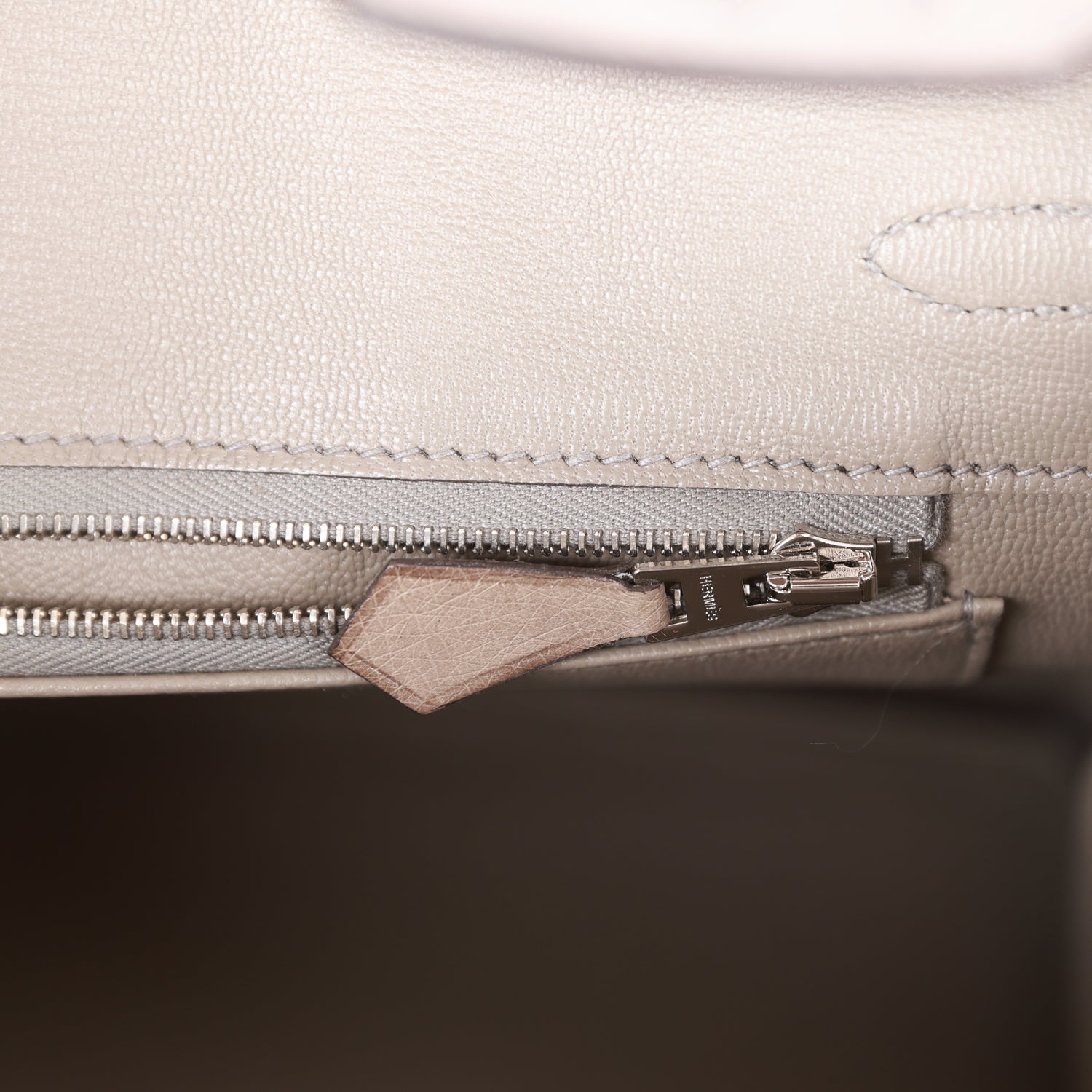 The interior is lined with Gris Tourterelle and has a zip pocket with an Hermes engraved zipper pull and an open pocket on the opposite side.