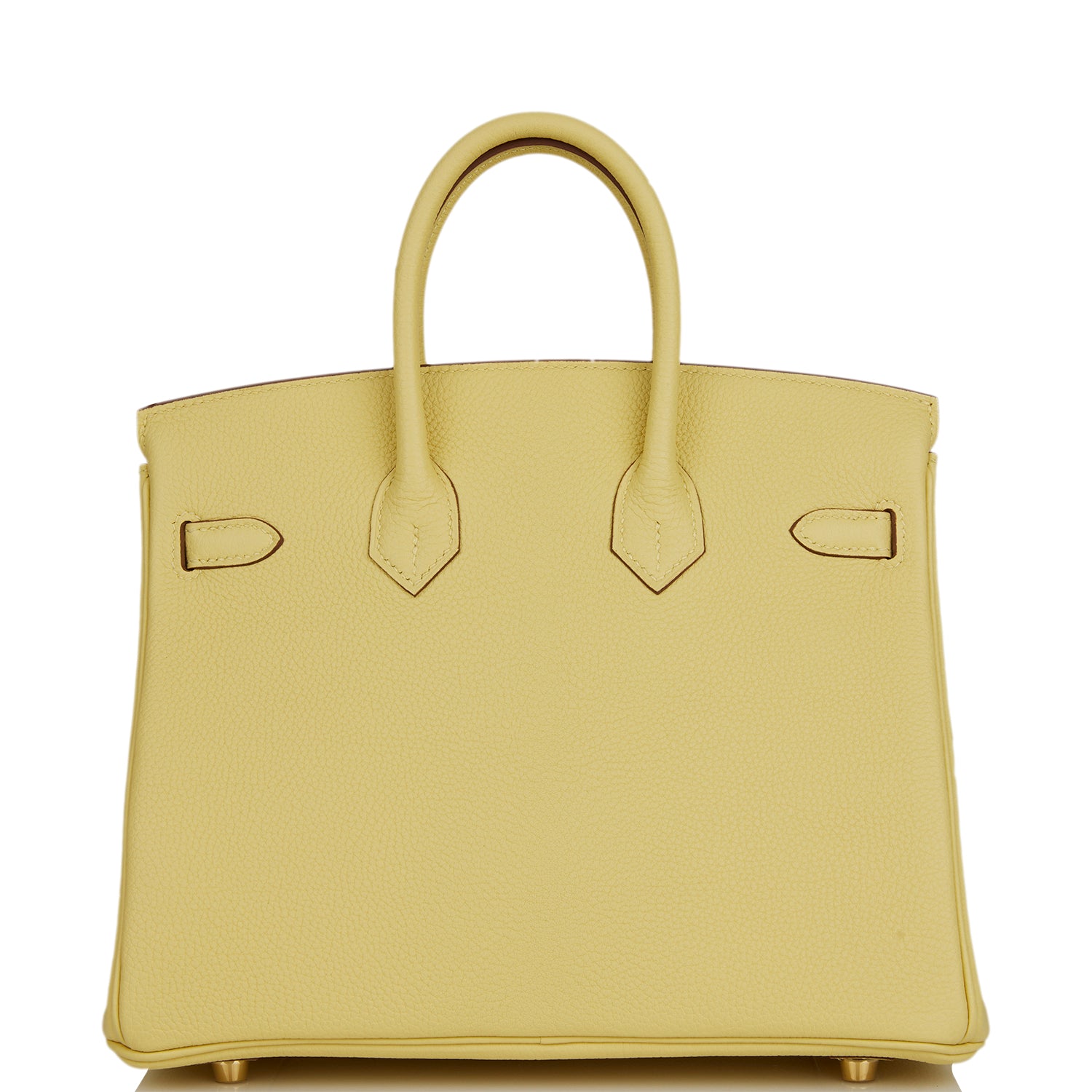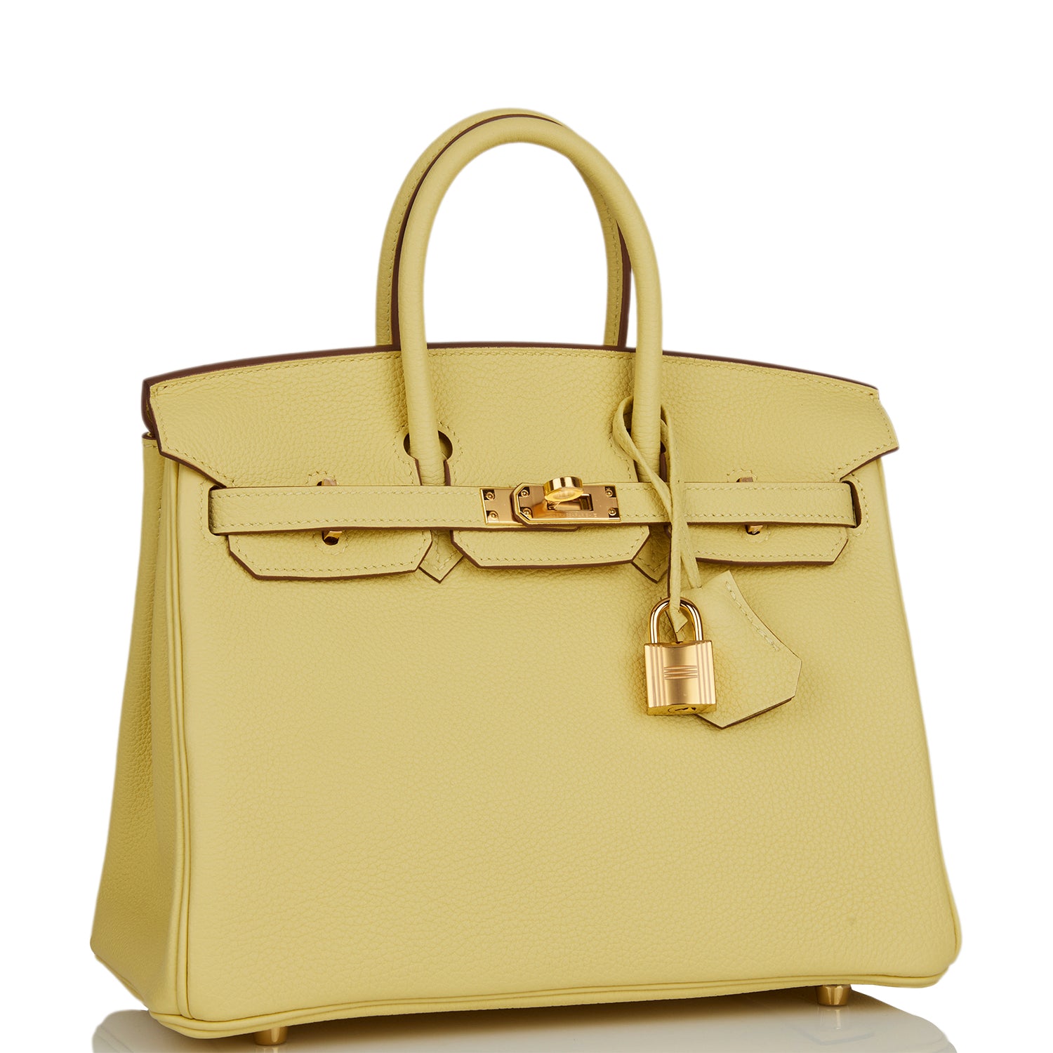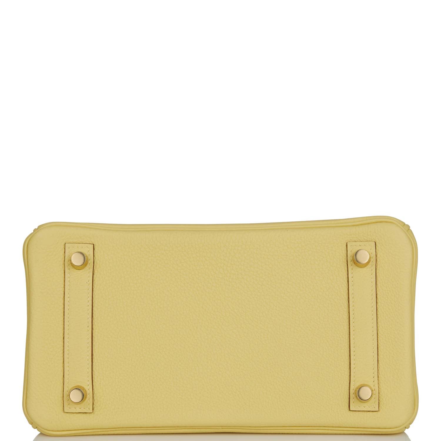 This Birkin is in Jaune Poussin togo leather with gold hardware and has tonal stitching, front flap, two straps with center toggle closure, clochette with lock and two keys, and double rolled handles.