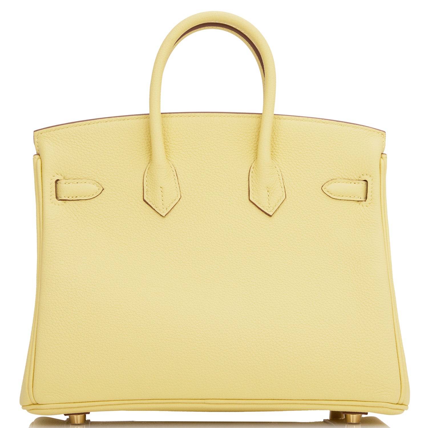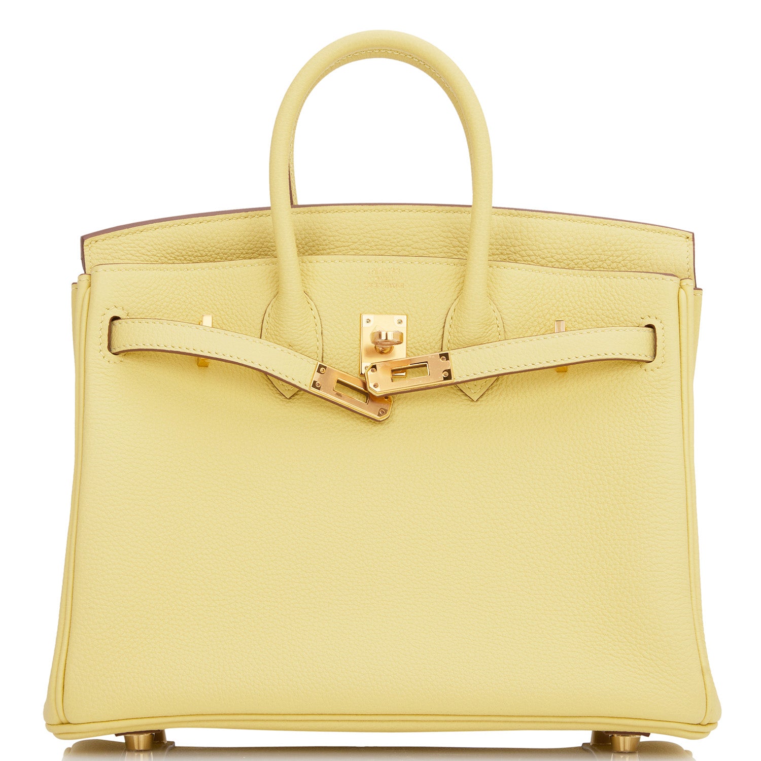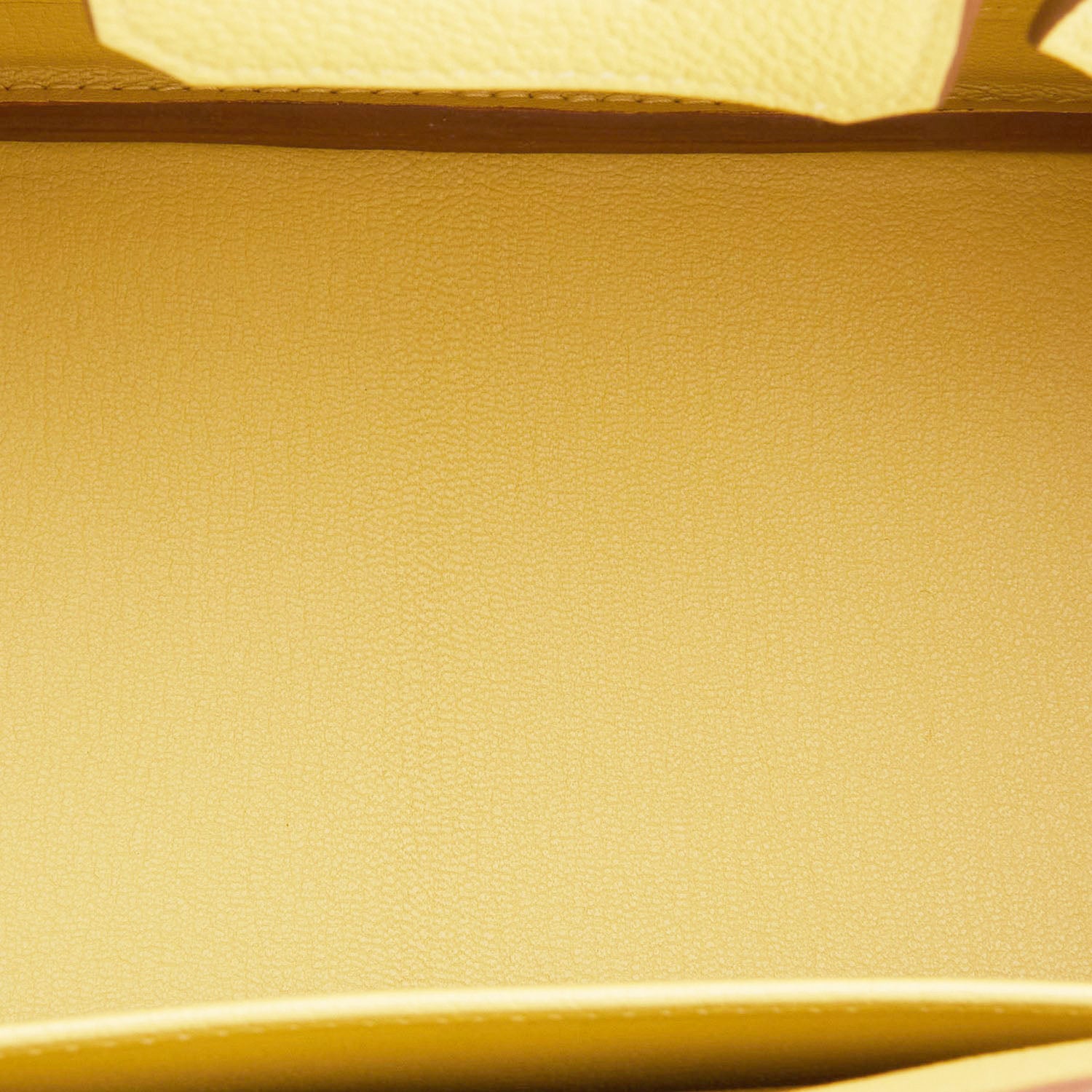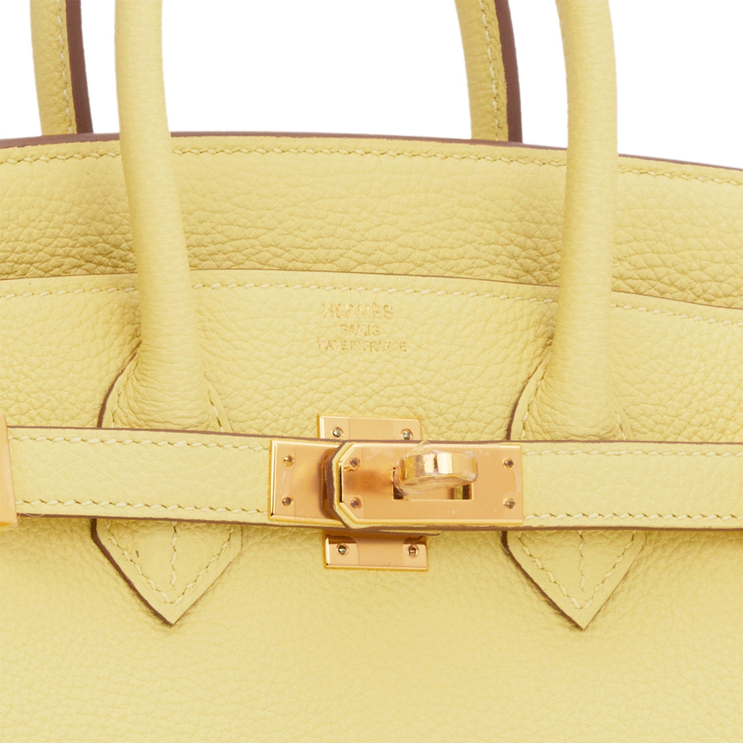 This Birkin is in Jaune Poussin togo leather with gold hardware and has tonal stitching, front flap, two straps with center toggle closure, clochette with lock and two keys, and double rolled handles.