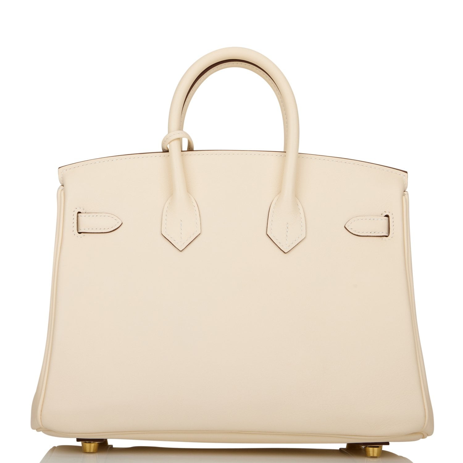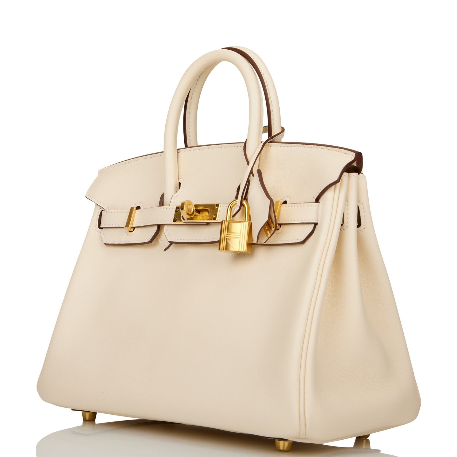 This Birkin is of Nata swift with gold hardware and features tonal stitching, front flap, two straps with center toggle closure, clochette with lock and two keys, and double rolled handles.