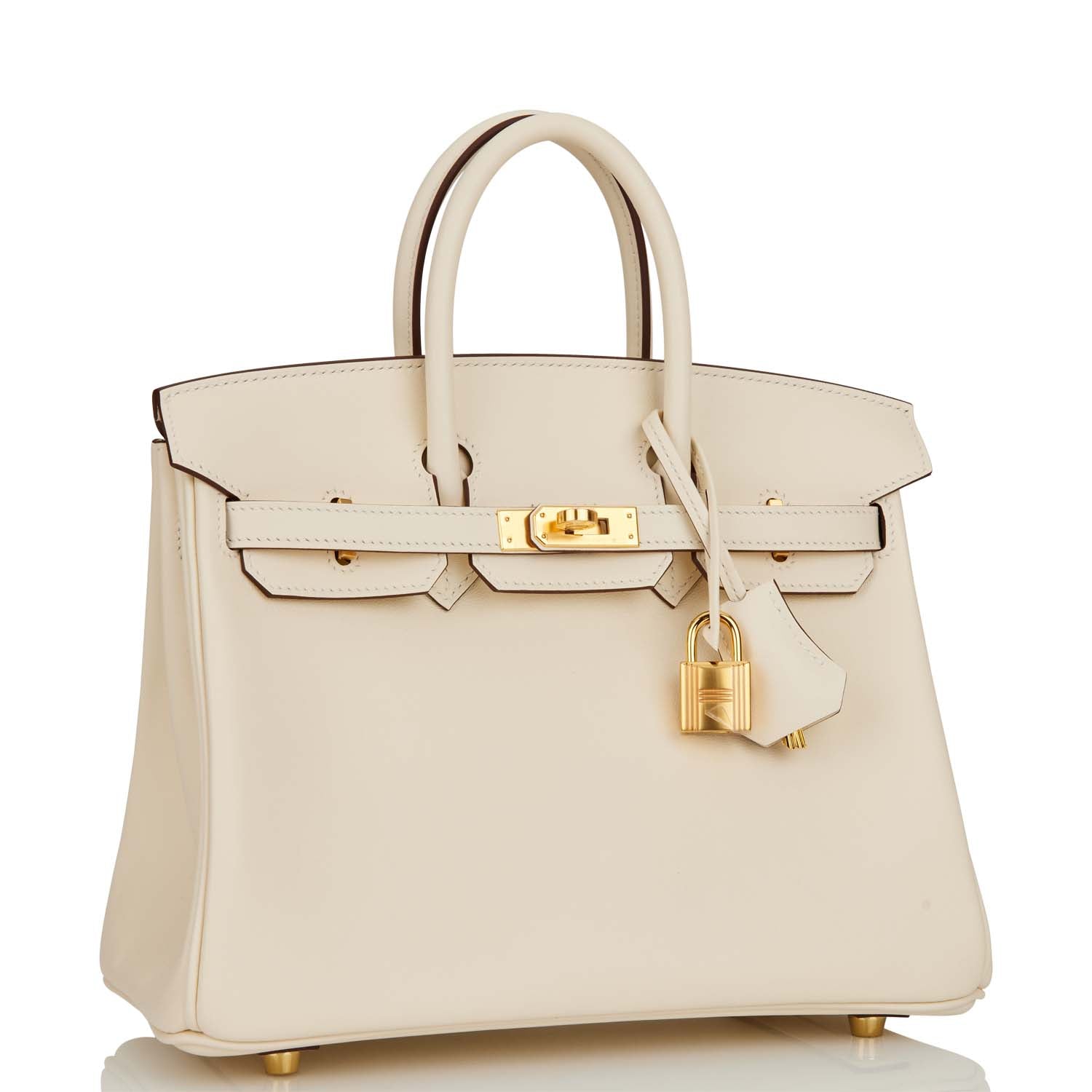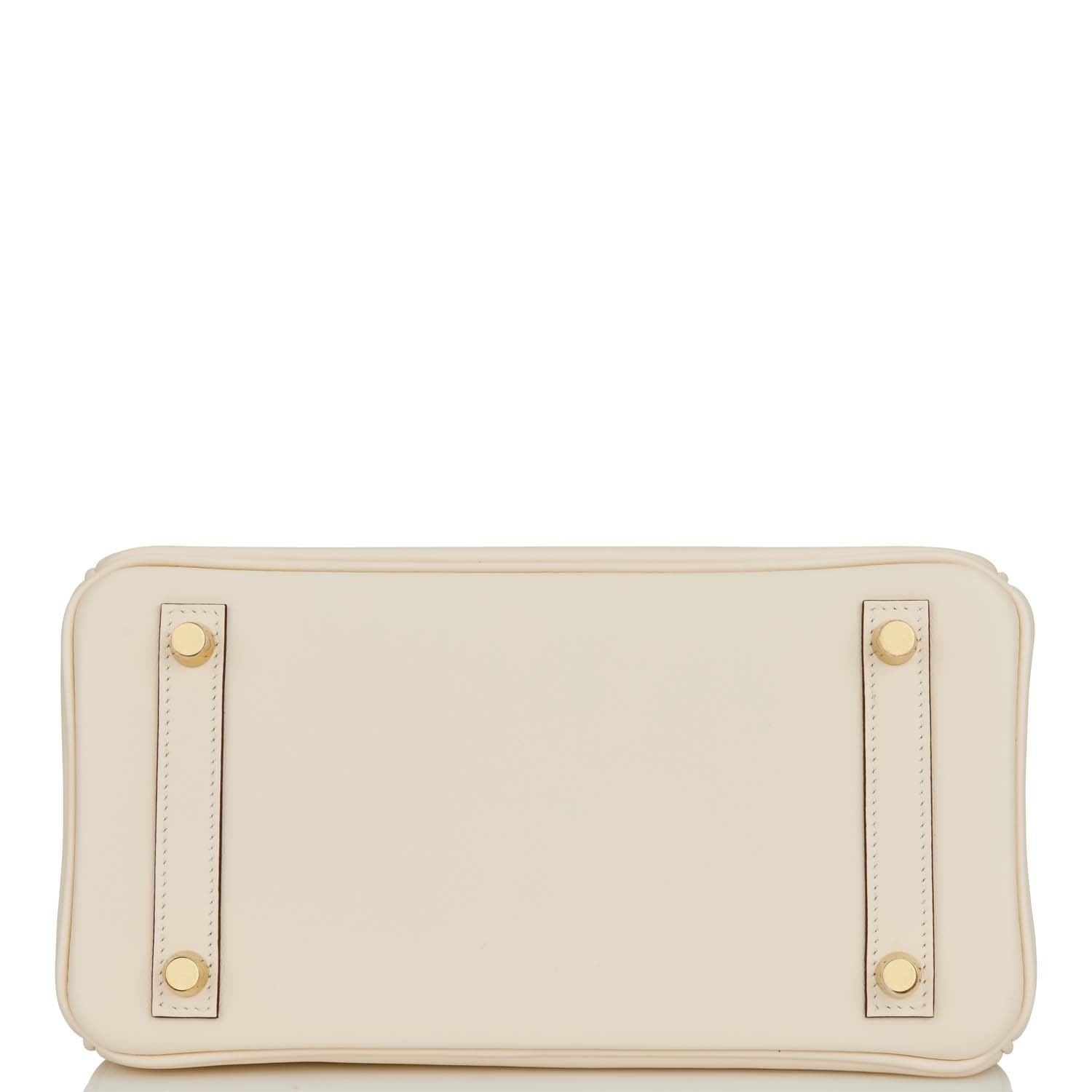 This Birkin is of Nata swift with gold hardware and features tonal stitching, front flap, two straps with center toggle closure, clochette with lock and two keys, and double rolled handles.